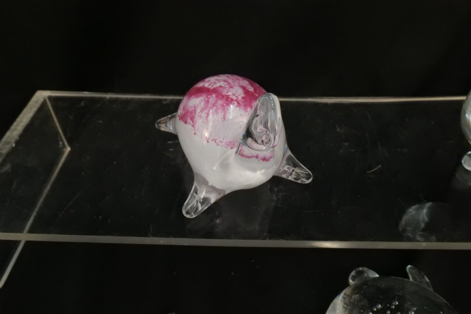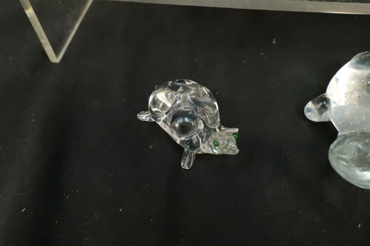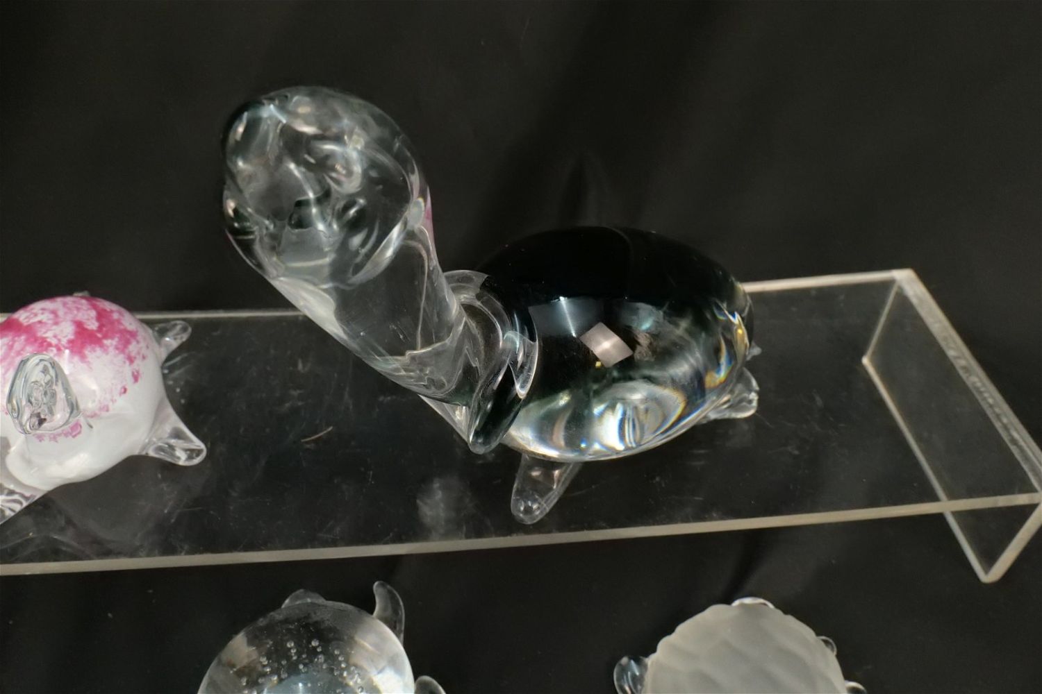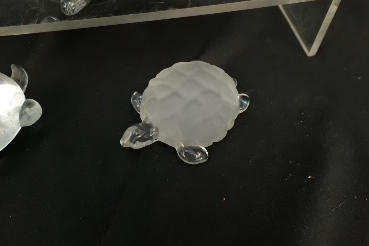 Group of 5 art glass turtles including a large Murano turtle, lead crystal Granna glass Swedish turtle, a frosted glass turtle in a Lalique style, a paperweight turtle with a bubble control shell and an art glass miniature turtle with green eyes. Largest measures 6" tall. All invoices must be paid within 24 hours of the sale. We offer multiple shipping options, please read the terms as they have changed. We also offer Pick-Ups Thursday, Friday, Saturday, and Monday immediately following the sale. BY APPOINTMENT ONLY. PLEASE READ THE NEW TERMS!!!