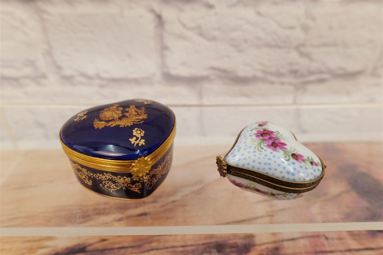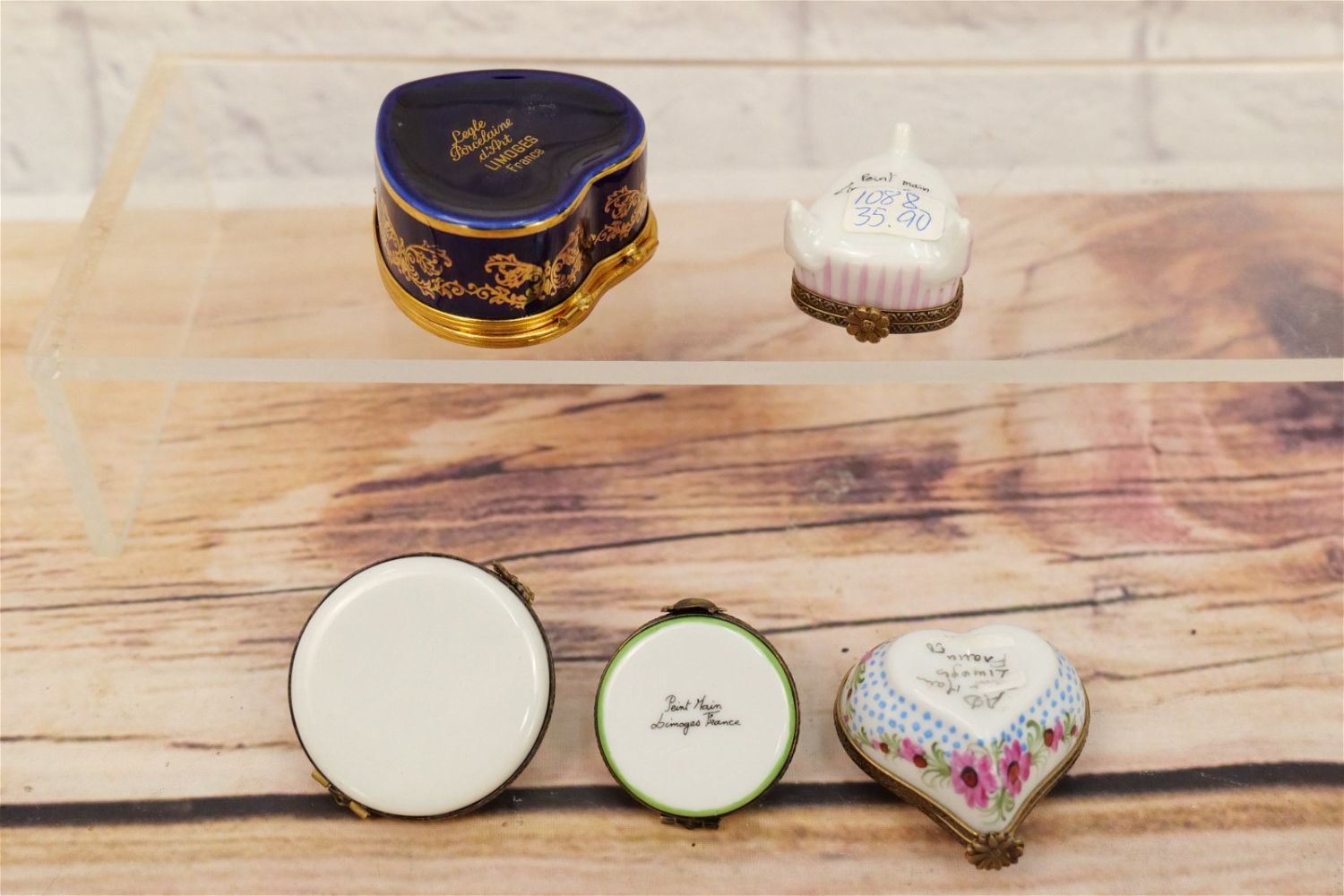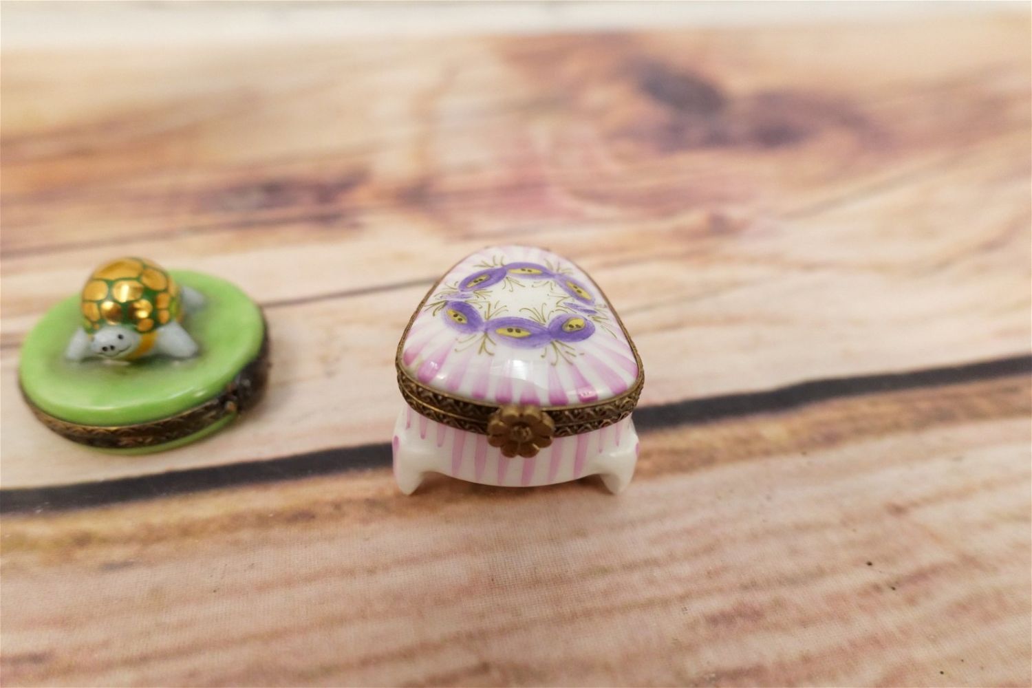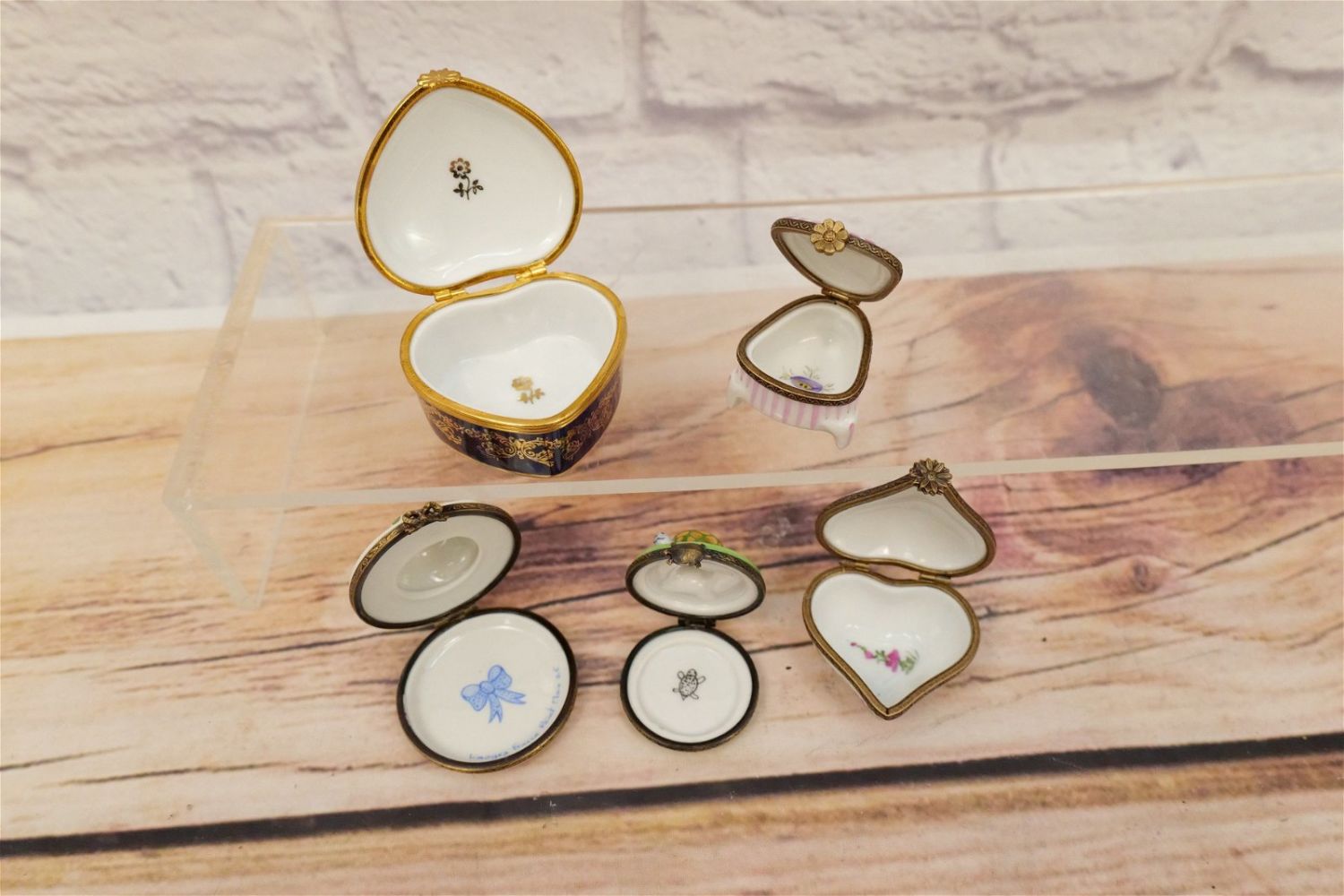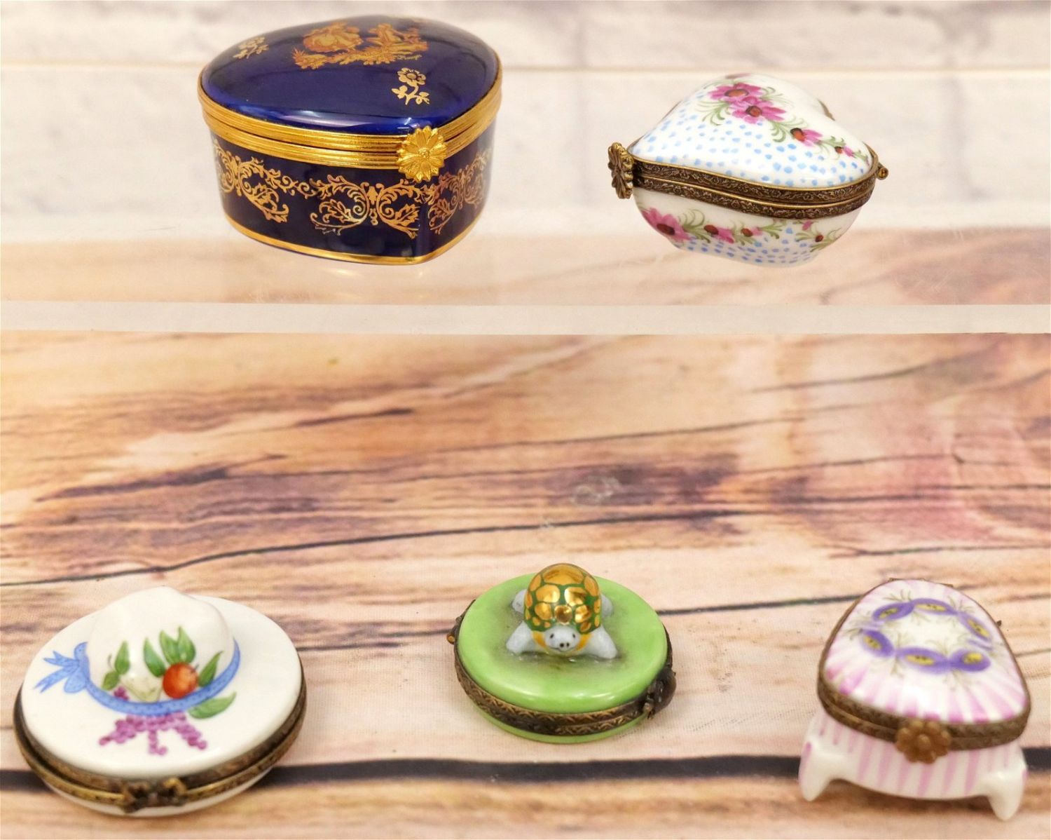 Group Lot of 5 Limoges Boxes including Cobalt Blue Heart Shaped with French Scene, Turtle, Ladies Hat, Heart Shape with Flowers, and Piano Shaped with Flowers. Largest measures 2.5" long. All invoices must be paid within 24 hours of the sale. We offer multiple shipping options, please read the terms as they have changed. We also offer Pick-Ups Thursday, Friday, Saturday, and Monday immediately following the sale. BY APPOINTMENT ONLY. PLEASE READ THE NEW TERMS!!!