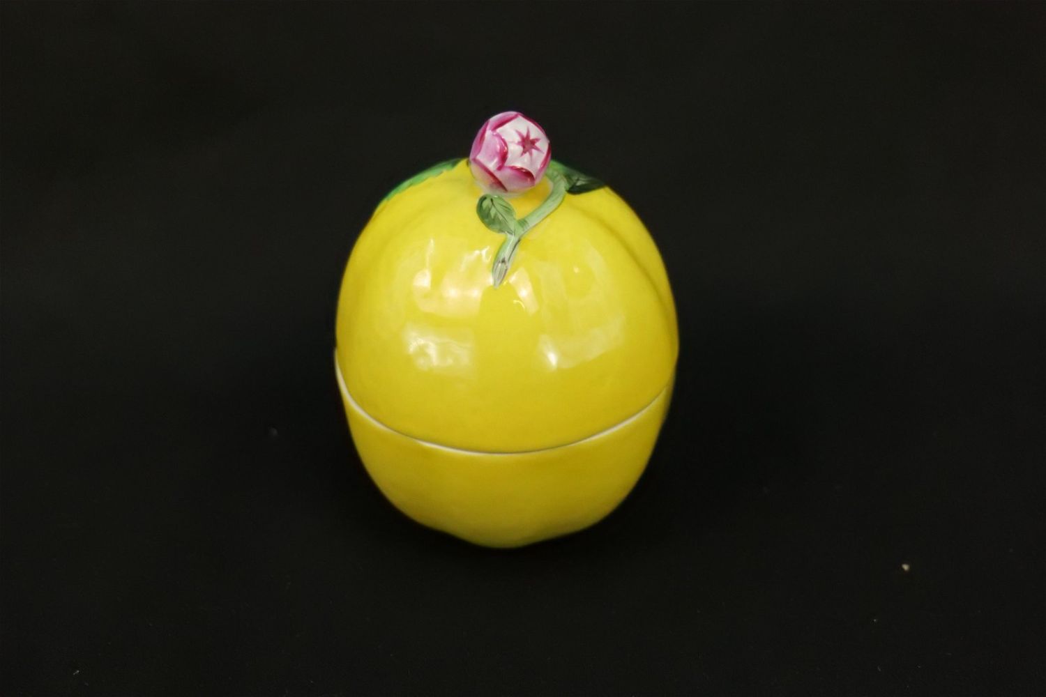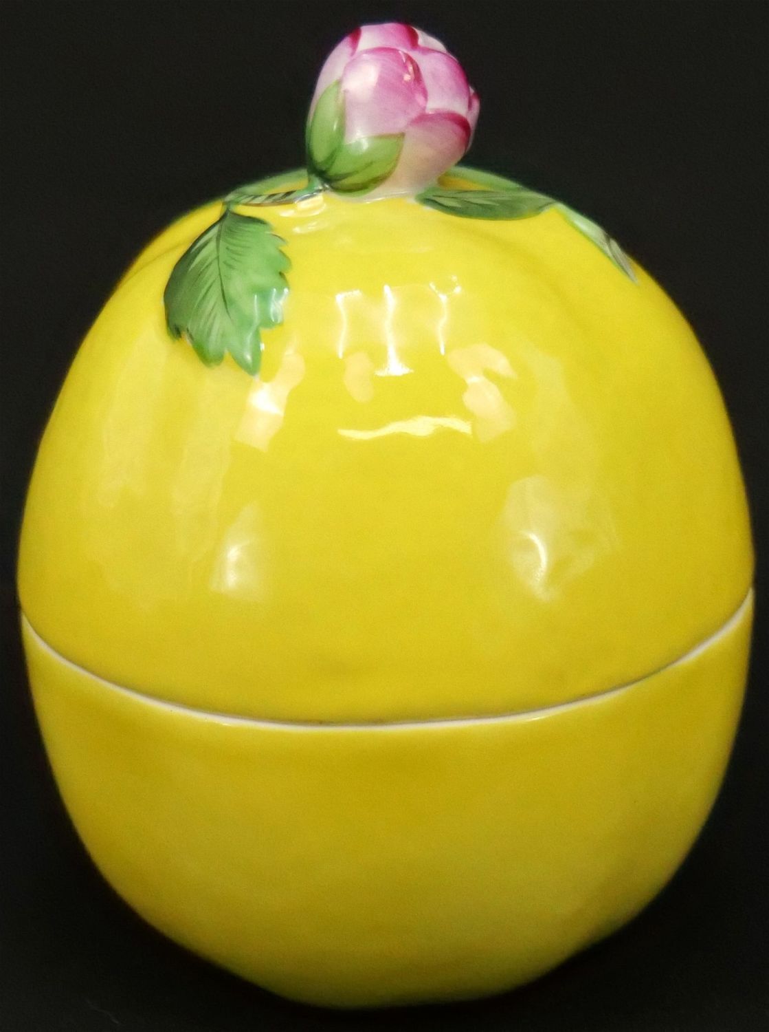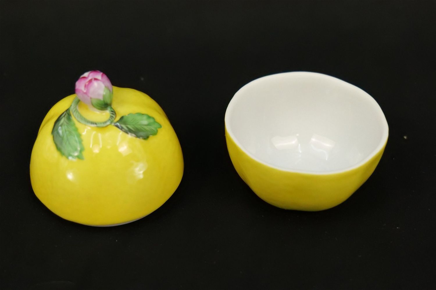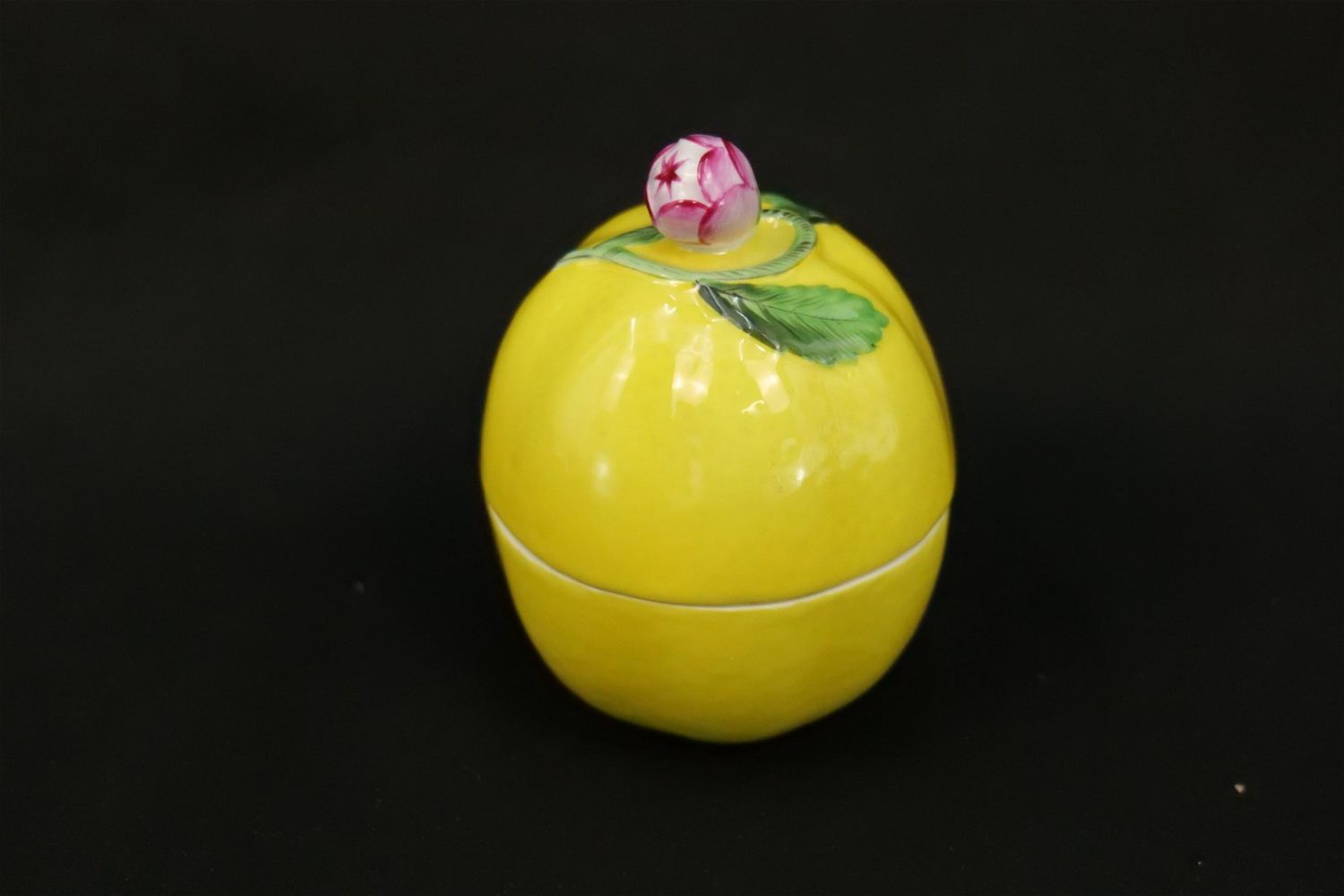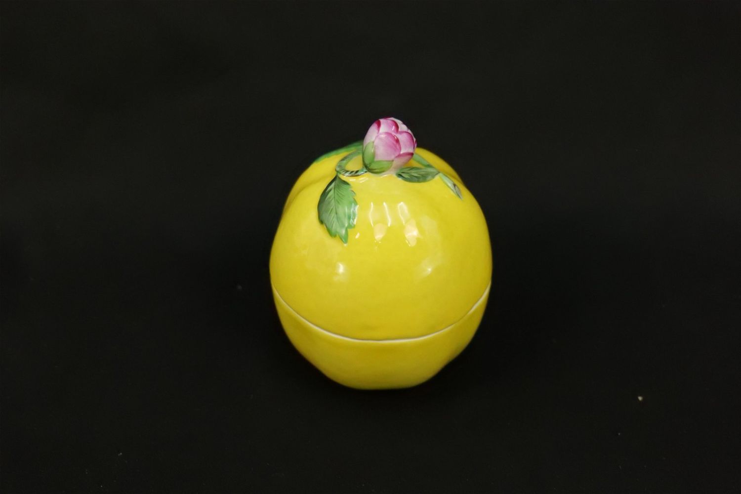 Herend Lemon Bon Bon Box. Measures 4.25" tall x 3" diameter. All invoices must be paid within 24 hours of the sale. We offer multiple shipping options, please read the terms as they have changed. We also offer Pick-Ups Thursday, Friday, Saturday, and Monday immediately following the sale. BY APPOINTMENT ONLY. PLEASE READ THE NEW TERMS!!!