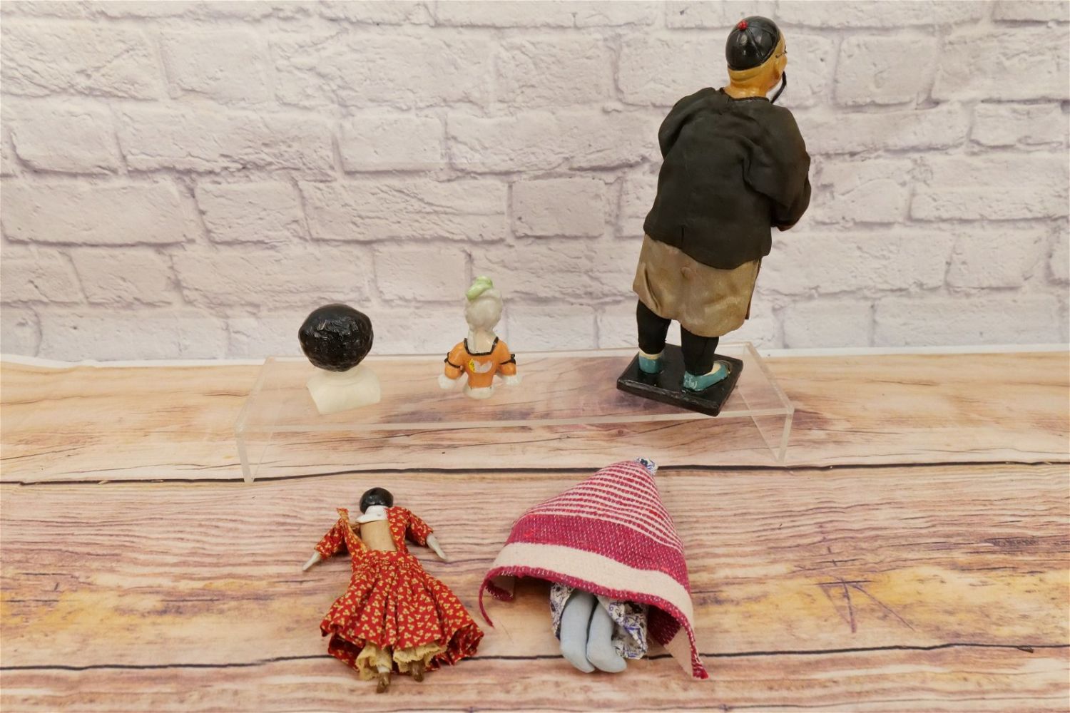 Group Lot of Dolls including Composition Chinese Man Holding Paper – Foot has been repaired, China Head Doll, China Bisque Head, and Porcelain Woman – AS-IS. Largest measures 11" tall. All invoices must be paid within 24 hours of the sale. We offer multiple shipping options, please read the terms as they have changed. We also offer Pick-Ups Thursday, Friday, Saturday, and Monday immediately following the sale. BY APPOINTMENT ONLY. PLEASE READ THE NEW TERMS!!!