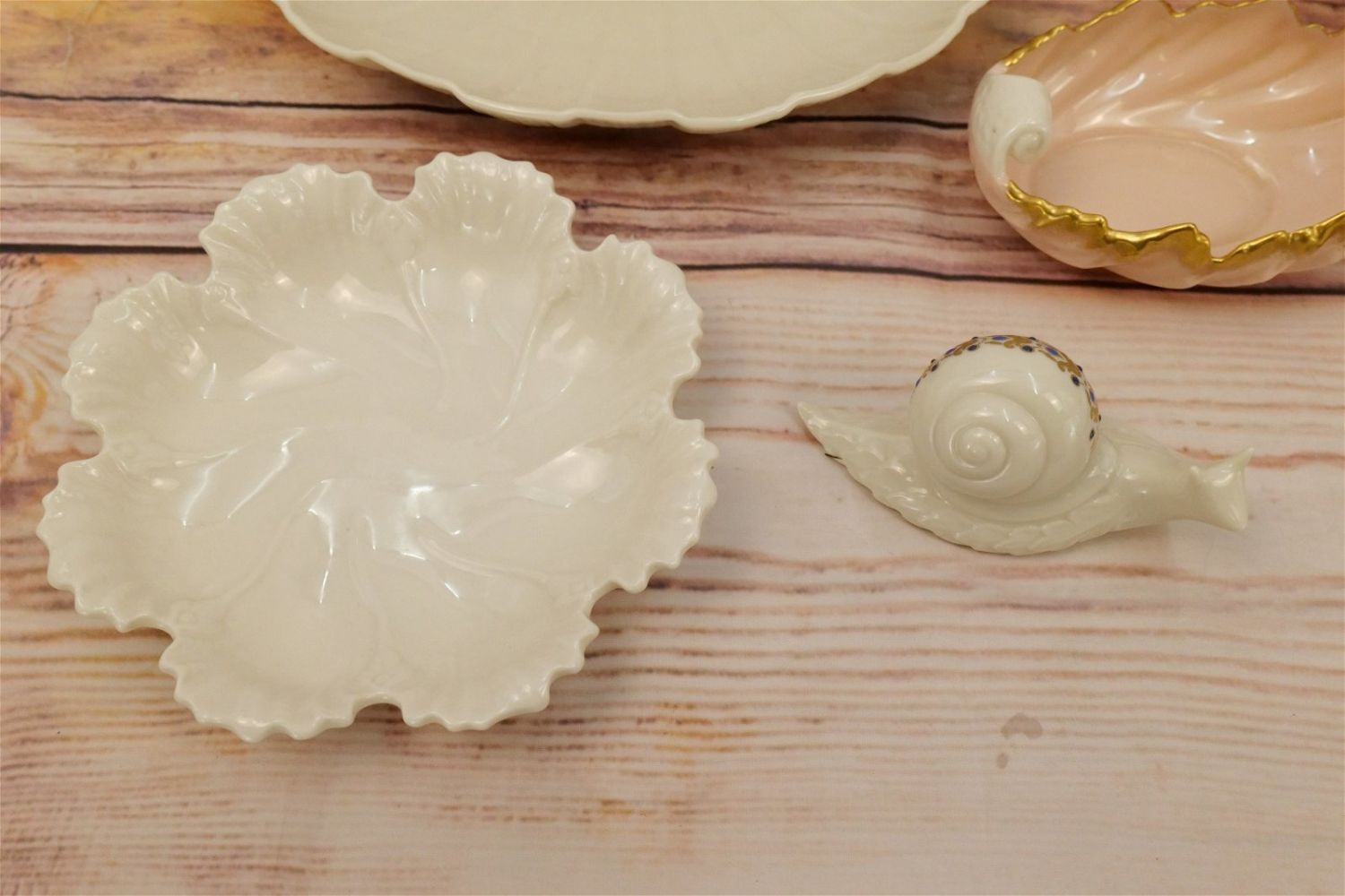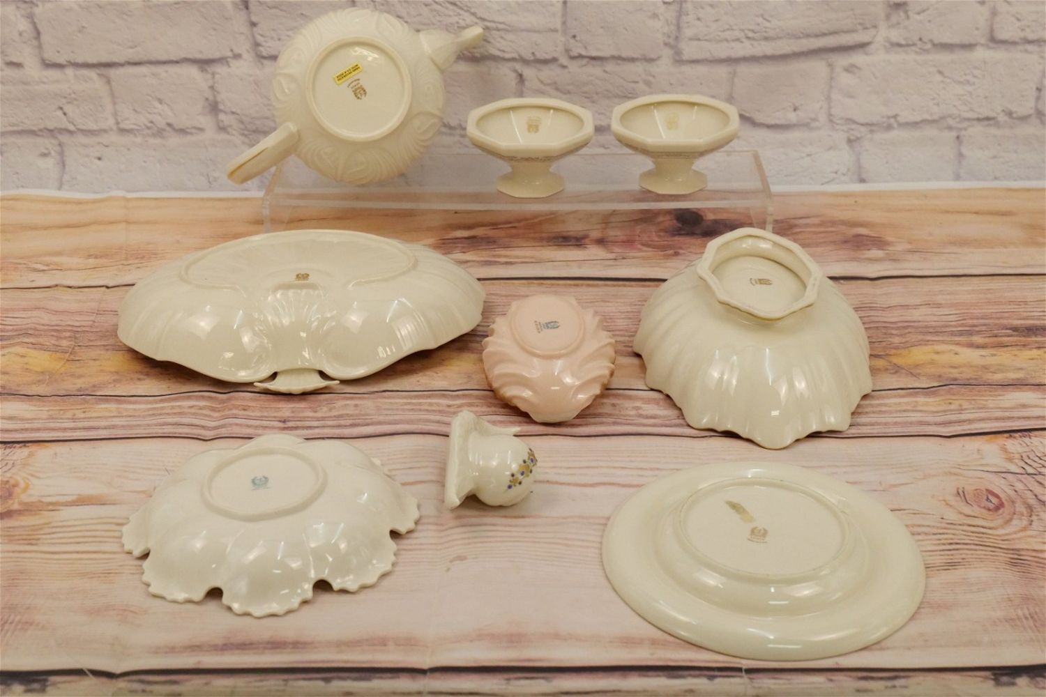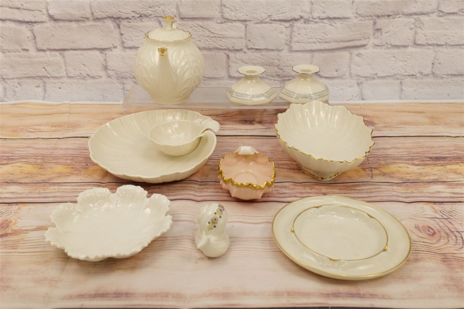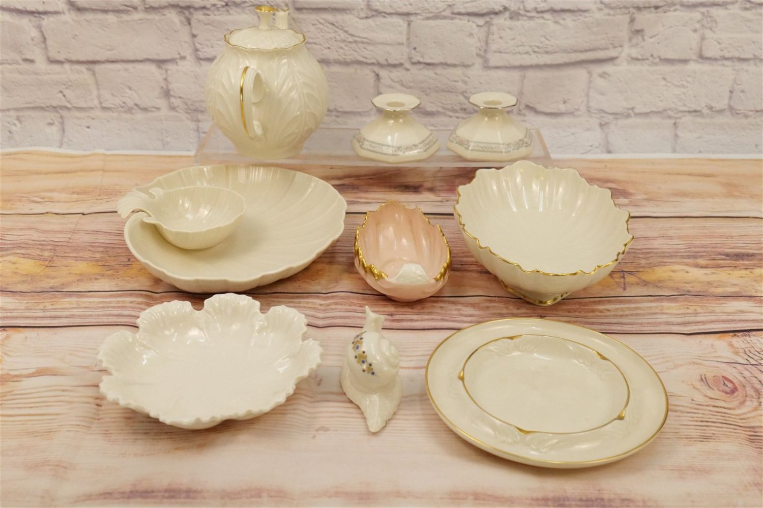 Group Lot of Lenox including Teapot, Chip and Dip, Snail Figurine, Pair of Charleston Candlesticks, Center Bowl, Ashtray, and (2) Vintage Green Marked Dishes. Teapot measures 7" tall x 11" wide. All invoices must be paid within 24 hours of the sale. We offer multiple shipping options, please read the terms as they have changed. We also offer Pick-Ups Thursday, Friday, Saturday, and Monday immediately following the sale. BY APPOINTMENT ONLY. PLEASE READ THE NEW TERMS!!!