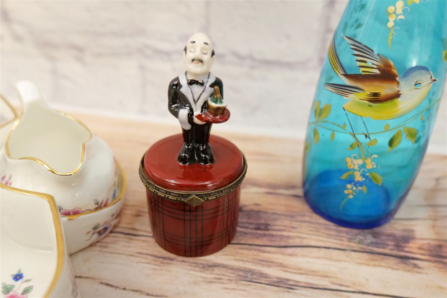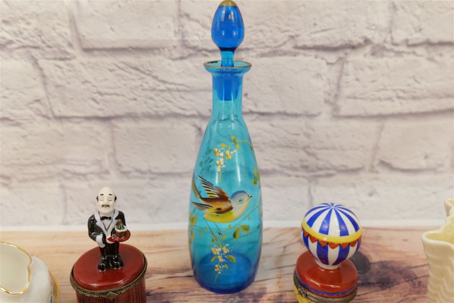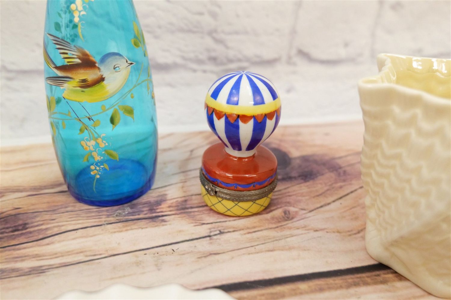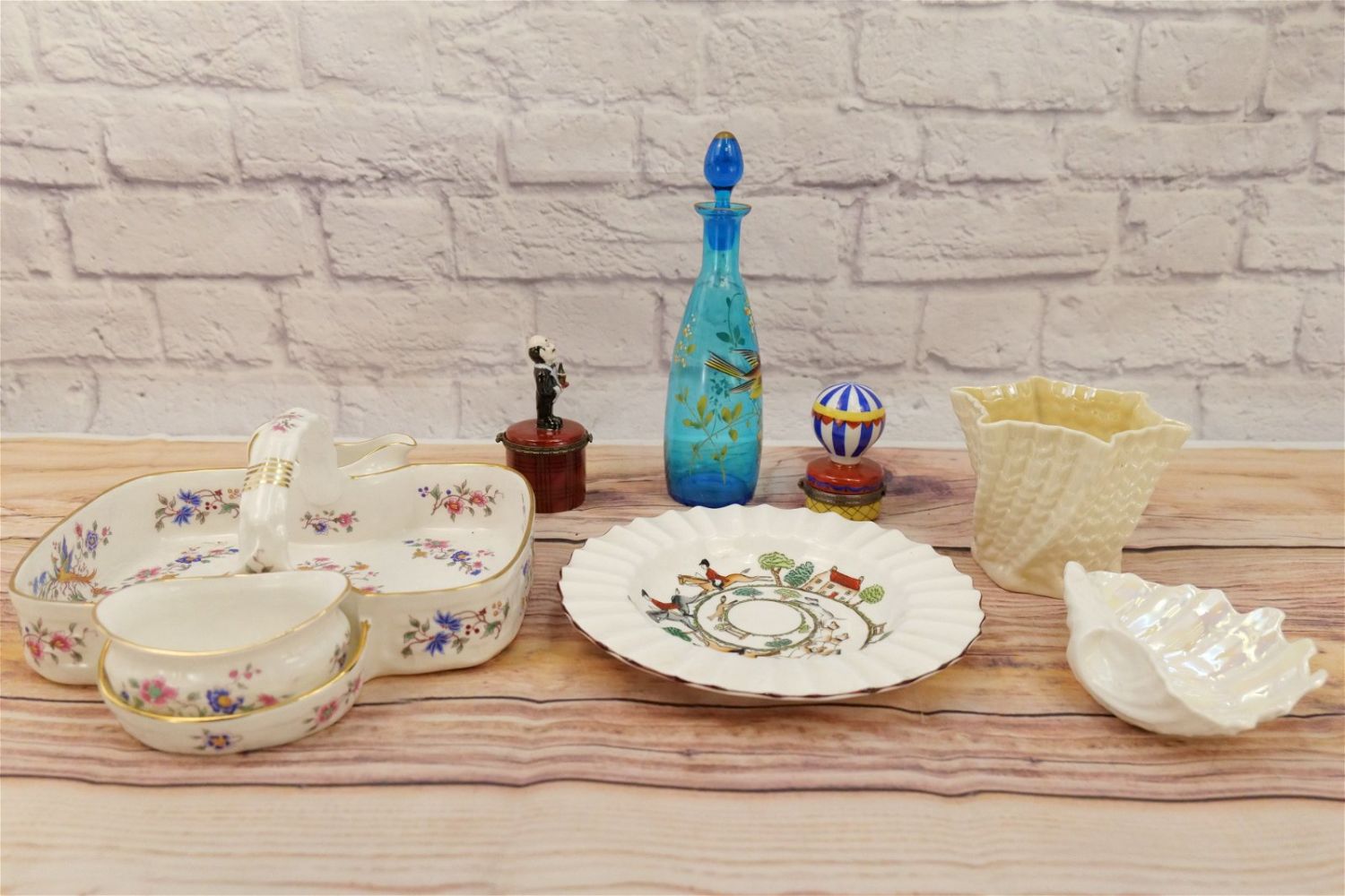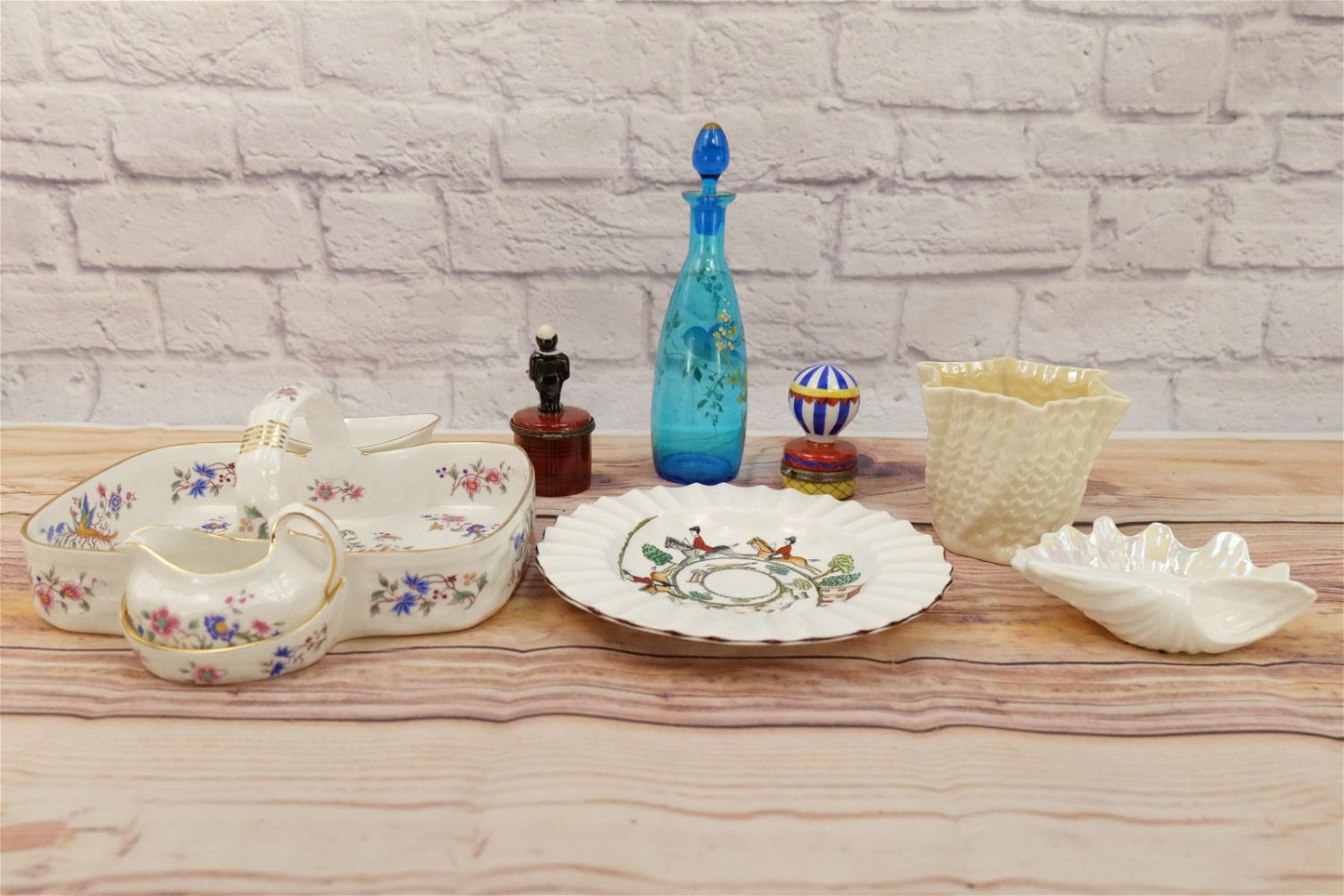 Group Lot of Porcelain and Glass including Belleek Vase, Staffordshire Plate with Hunting Scene, Wedgwood Shell Dish, Hammersley Serving Tray with Creamer & Sugar, Hot Air Balloon Dresser Box, Butler Candle Holder with Candle, and Hand Painted Decanter. Largest measures 10" tall. All invoices must be paid within 24 hours of the sale. We offer multiple shipping options, please read the terms as they have changed. We also offer Pick-Ups Thursday, Friday, Saturday, and Monday immediately following the sale. BY APPOINTMENT ONLY. PLEASE READ THE NEW TERMS!!!