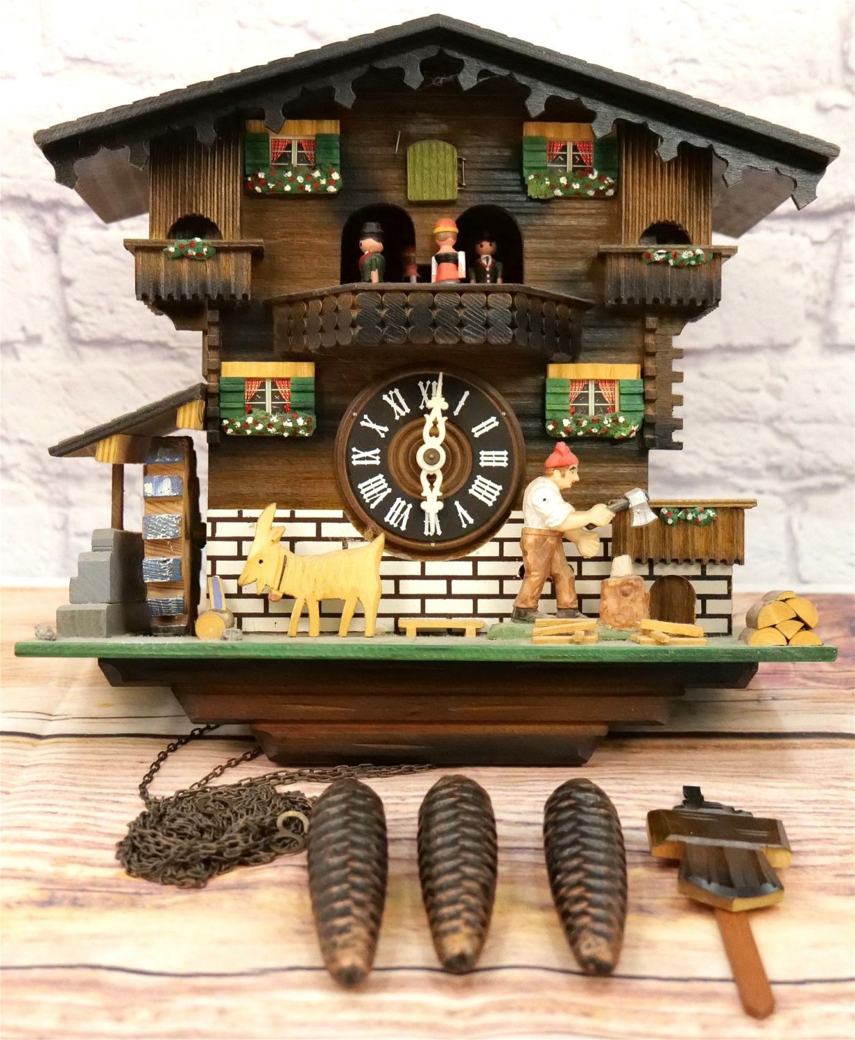 German Cuckoo Clock. Has Swiss Musical Movement. Marked Cuendet Der Frohllche Wanderer Edelwiss. Clock has music box and animated with goat and man chopping wood. Has pendulum and weights. Was working when taken from house. Measures 12" tall x 12.5" wide. All invoices must be paid within 24 hours of the sale. We offer multiple shipping options, please read the terms as they have changed. We also offer Pick-Ups Thursday, Friday, Saturday, and Monday immediately following the sale. BY APPOINTMENT ONLY. PLEASE READ THE NEW TERMS!!!