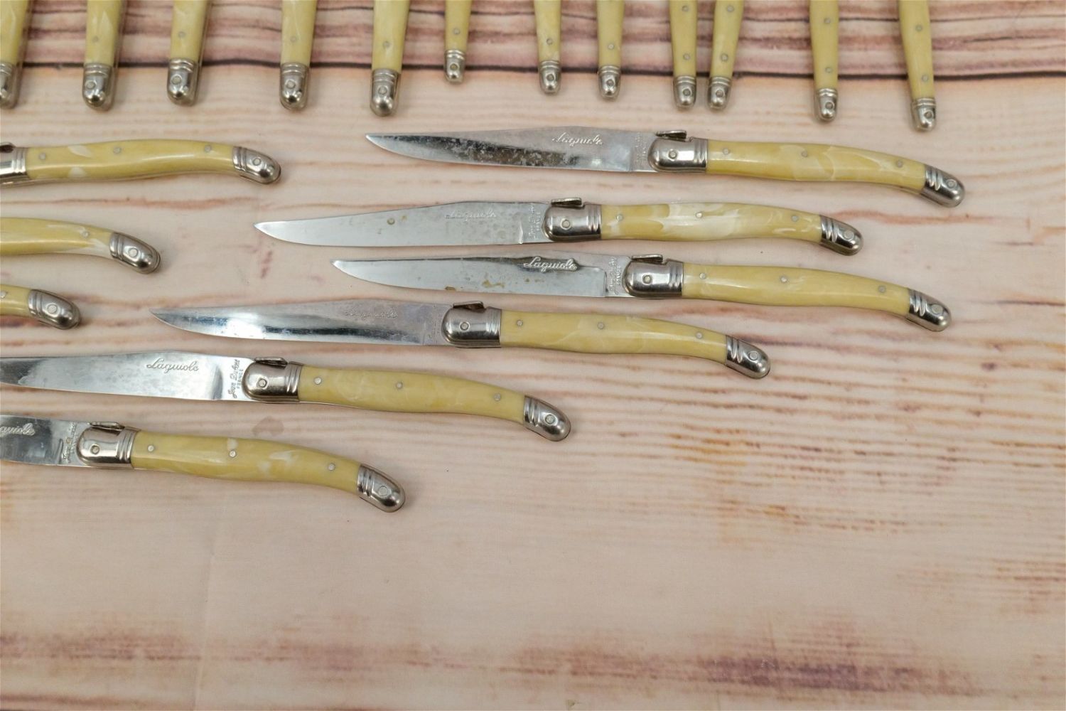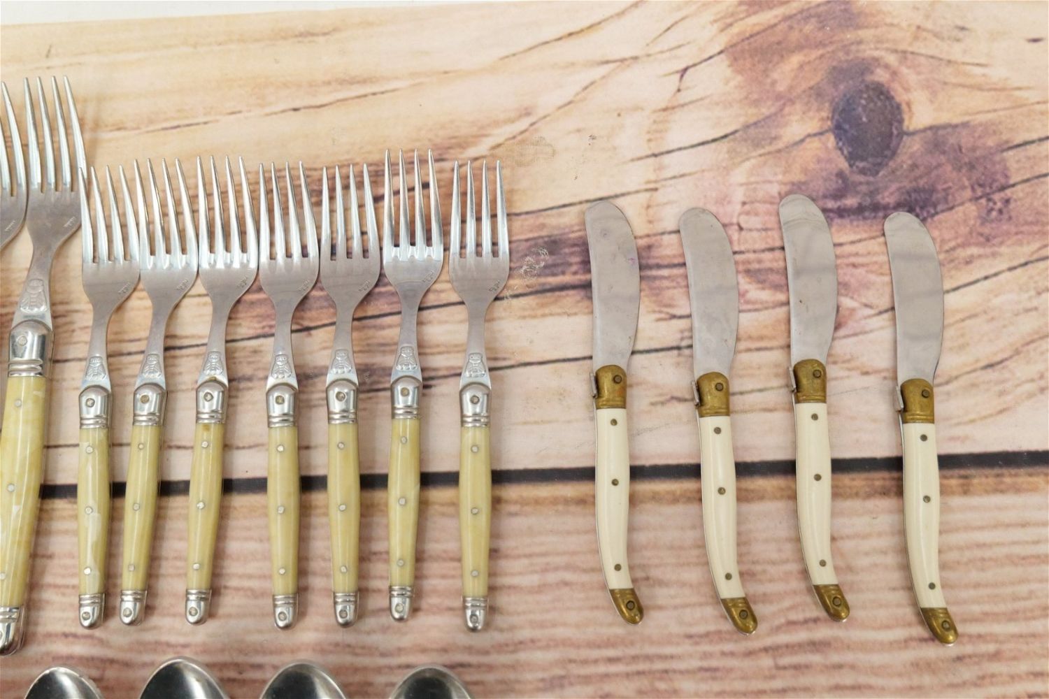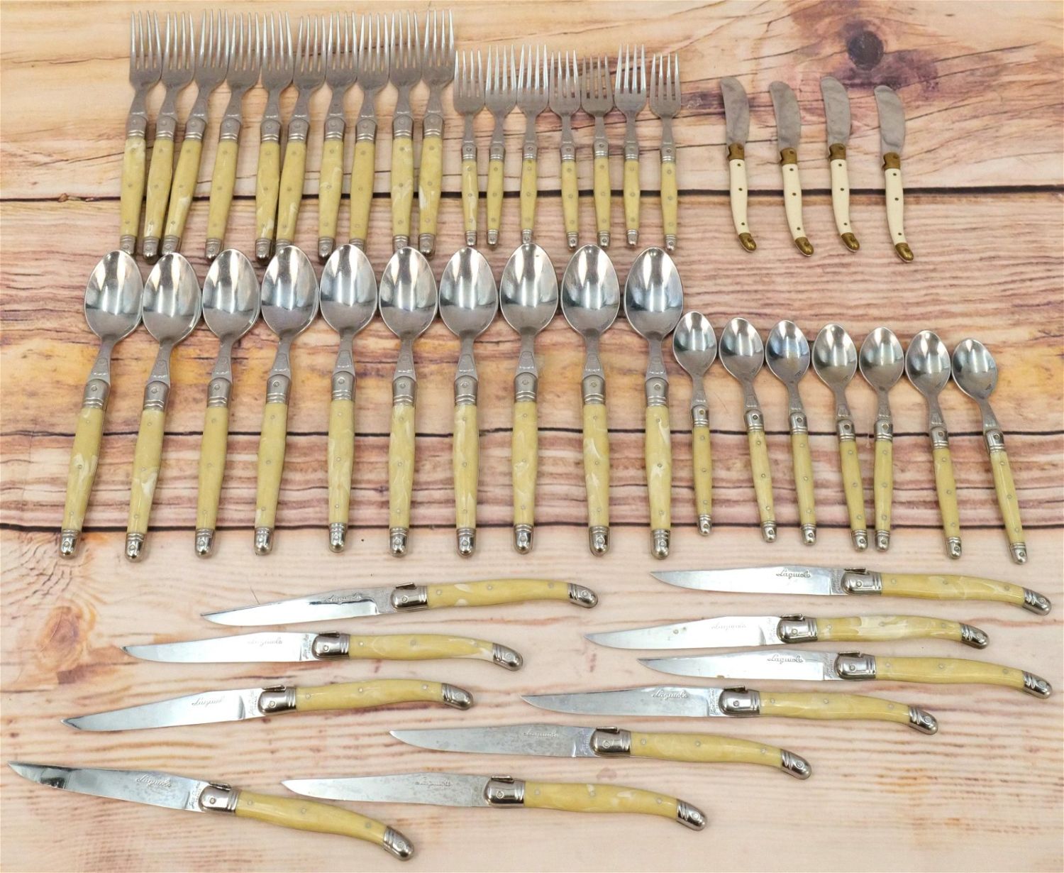 Jean Dubost Flatware Set (France) – Laguiole. Stainless and Plastic Set contains (10) Dinner Forks, (10) Large Spoons, (7) Teaspoons, (7) Salad Forks, (10 Knives), (4) Butter Knives. All invoices must be paid within 24 hours of the sale. We offer multiple shipping options, please read the terms as they have changed. We also offer Pick-Ups Thursday, Friday, Saturday, and Monday immediately following the sale. BY APPOINTMENT ONLY. PLEASE READ THE NEW TERMS!!!