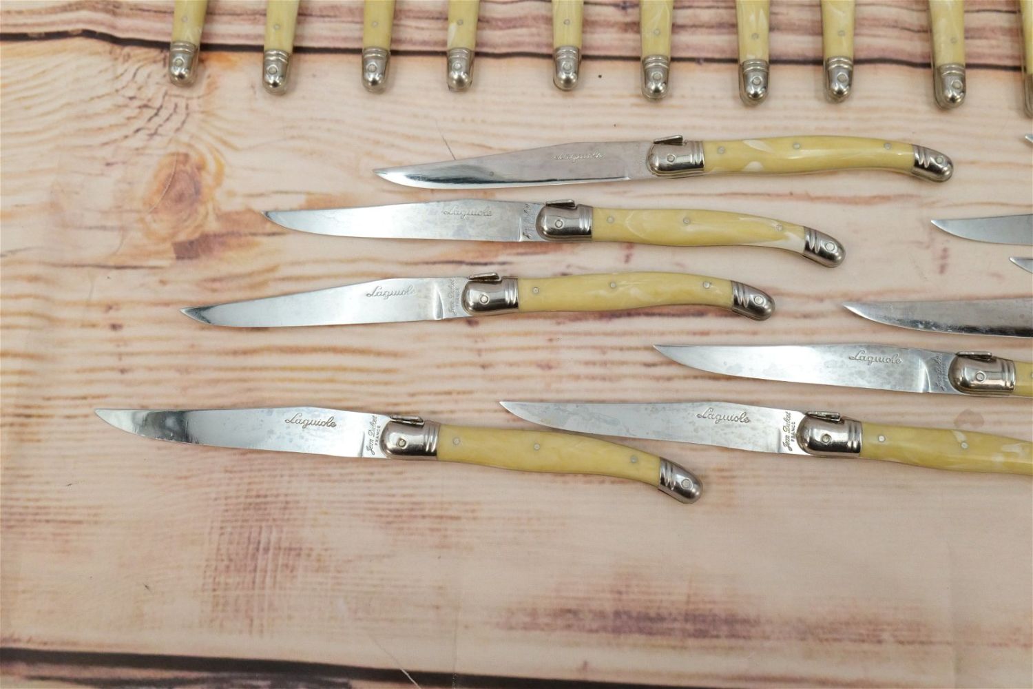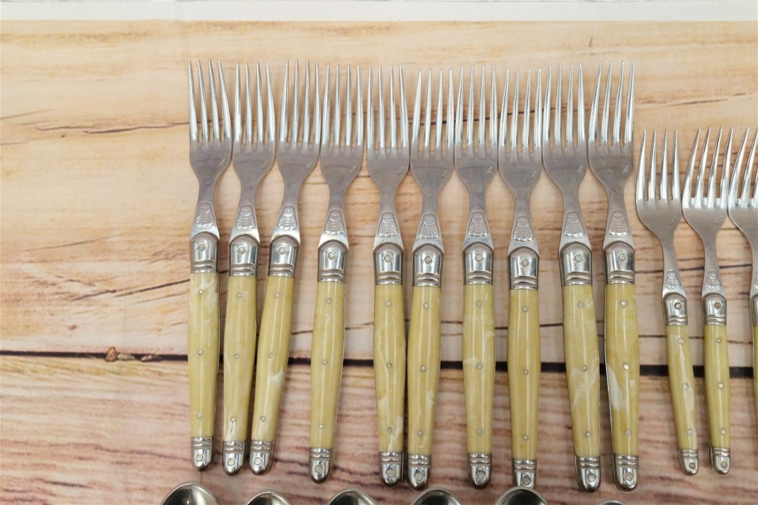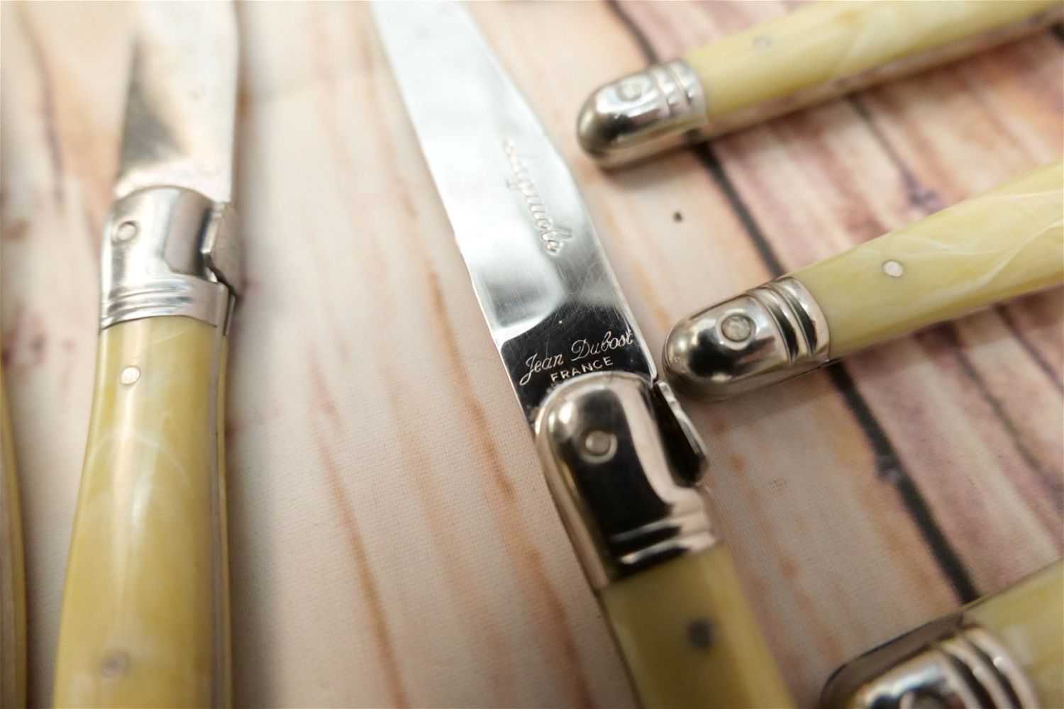 Jean Dubost Flatware Set (France) – Laguiole. Stainless and Plastic Set contains (10) Dinner Forks, (10) Large Spoons, (7) Teaspoons, (7) Salad Forks, (10 Knives), (4) Butter Knives. All invoices must be paid within 24 hours of the sale. We offer multiple shipping options, please read the terms as they have changed. We also offer Pick-Ups Thursday, Friday, Saturday, and Monday immediately following the sale. BY APPOINTMENT ONLY. PLEASE READ THE NEW TERMS!!!
