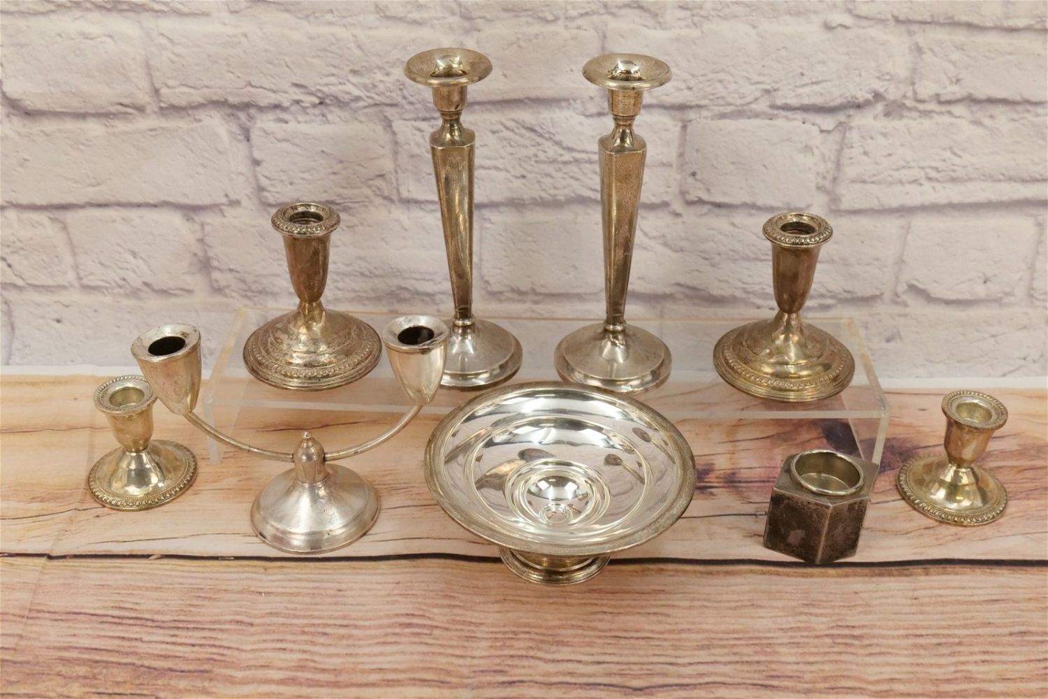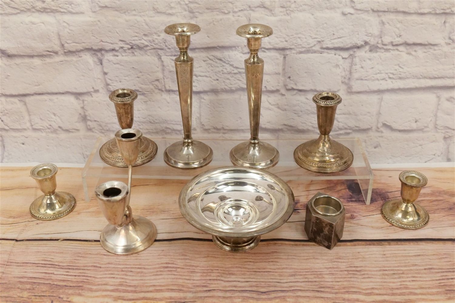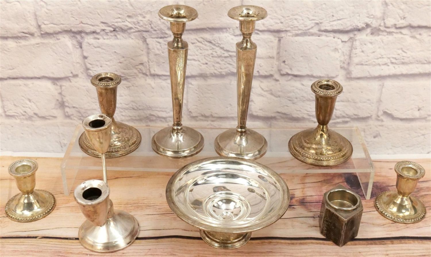 Large Lot of Weighted Sterling Silver Table Pieces including Pair of Bros Trumpet Style Candlestick Holders, International Compote, RR Inkwell, Pair of Duchin Creation Candlesticks, Duchin Creation Candelabra, and Pair of Empire Candlesticks. Some pieces have minor denting. Largest measures 9" tall. All invoices must be paid within 24 hours of the sale. We offer multiple shipping options, please read the terms as they have changed. We also offer Pick-Ups Thursday, Friday, Saturday, and Monday immediately following the sale. BY APPOINTMENT ONLY. PLEASE READ THE NEW TERMS!!!
