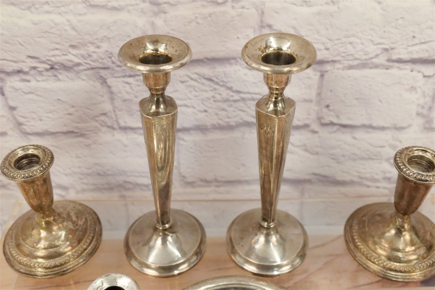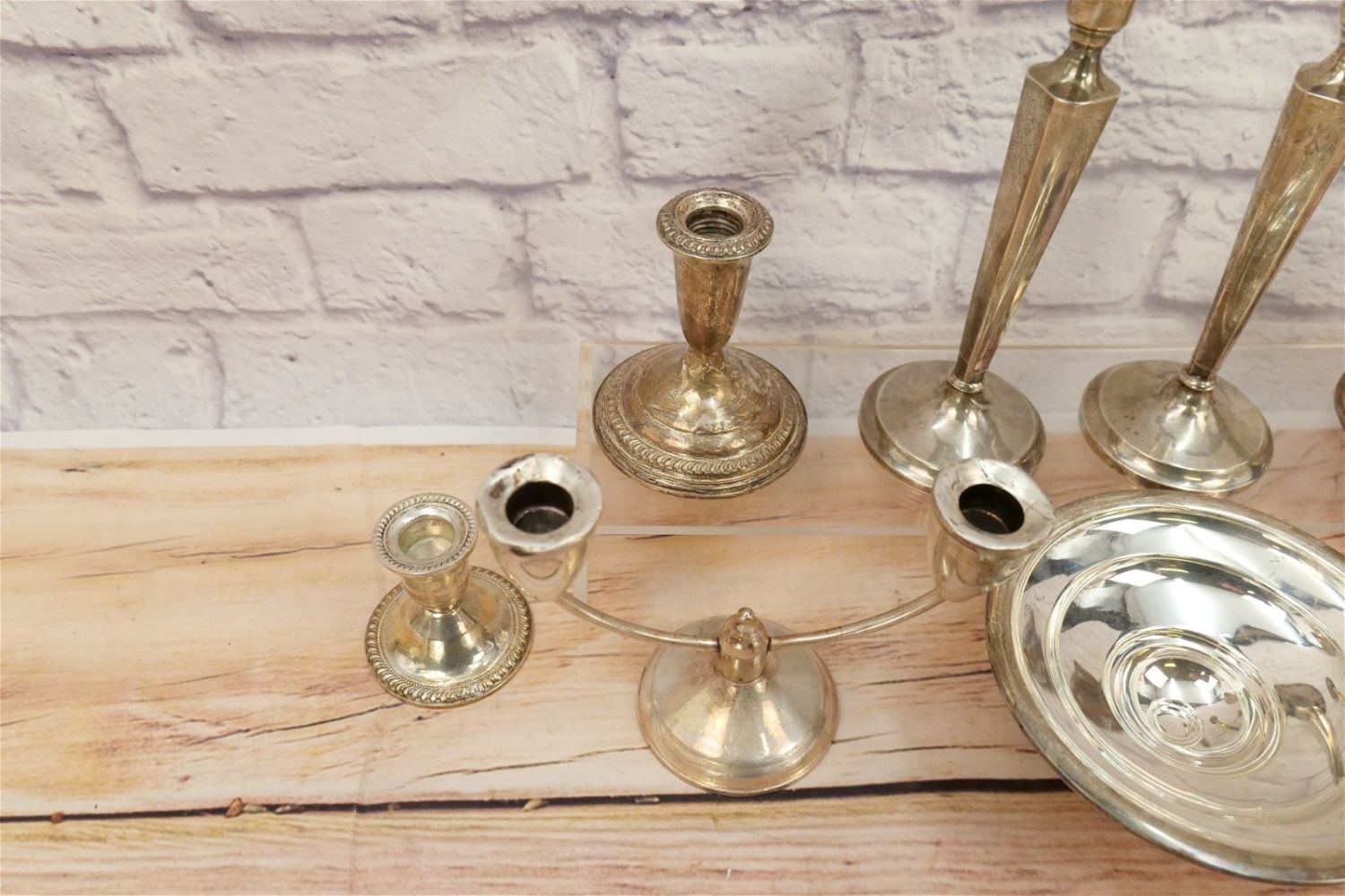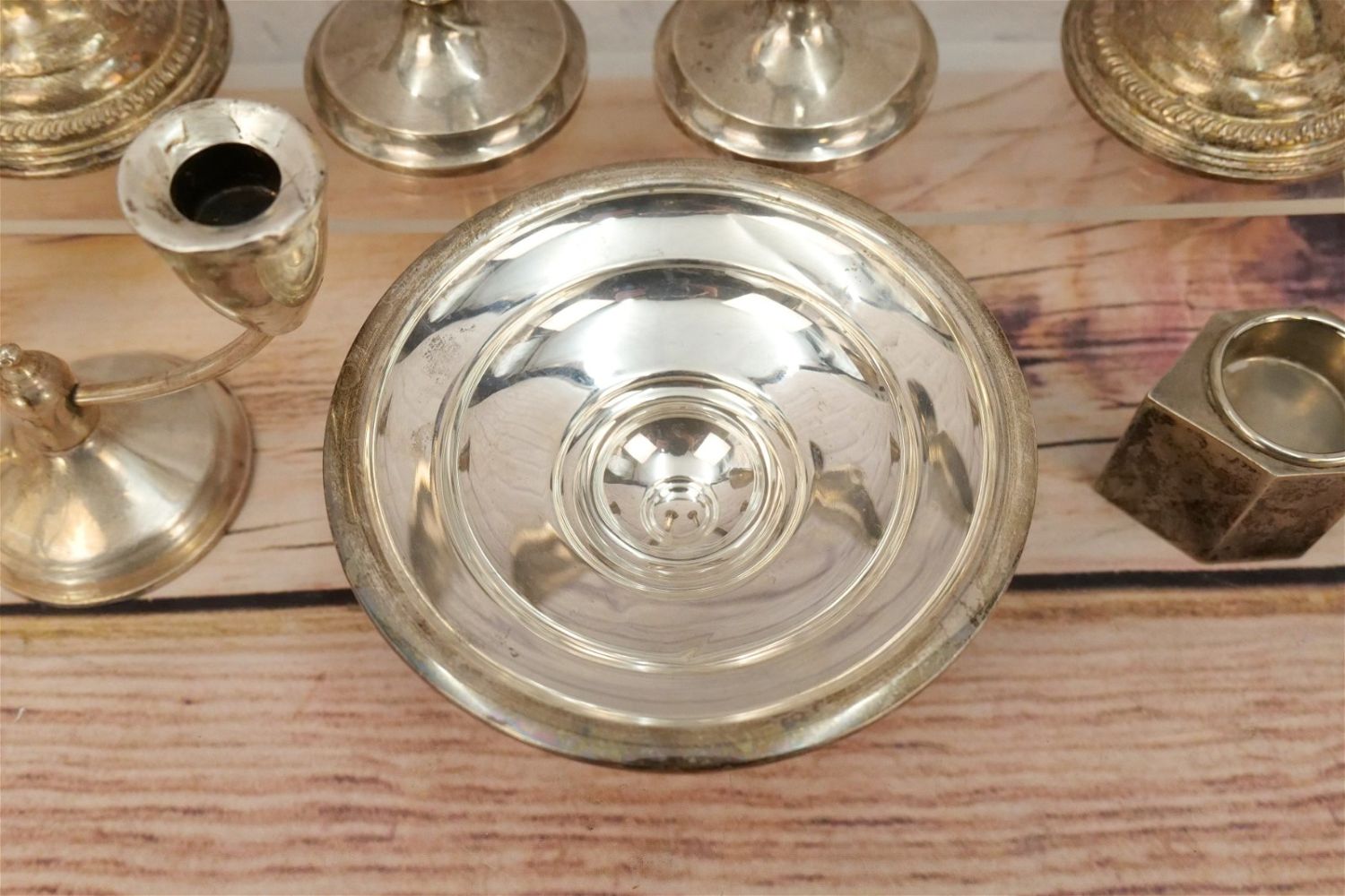 Large Lot of Weighted Sterling Silver Table Pieces including Pair of Bros Trumpet Style Candlestick Holders, International Compote, RR Inkwell, Pair of Duchin Creation Candlesticks, Duchin Creation Candelabra, and Pair of Empire Candlesticks. Some pieces have minor denting. Largest measures 9" tall. All invoices must be paid within 24 hours of the sale. We offer multiple shipping options, please read the terms as they have changed. We also offer Pick-Ups Thursday, Friday, Saturday, and Monday immediately following the sale. BY APPOINTMENT ONLY. PLEASE READ THE NEW TERMS!!!