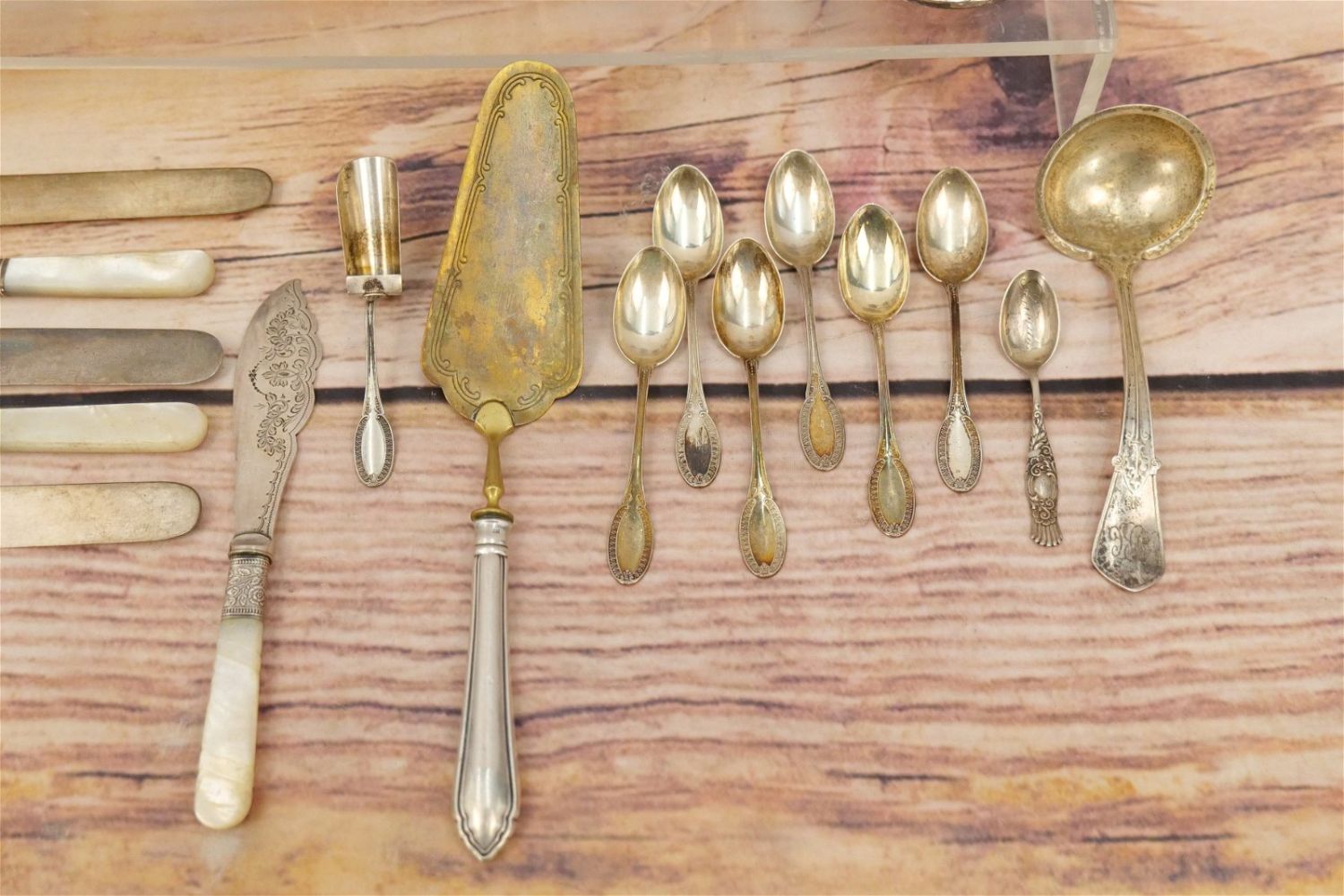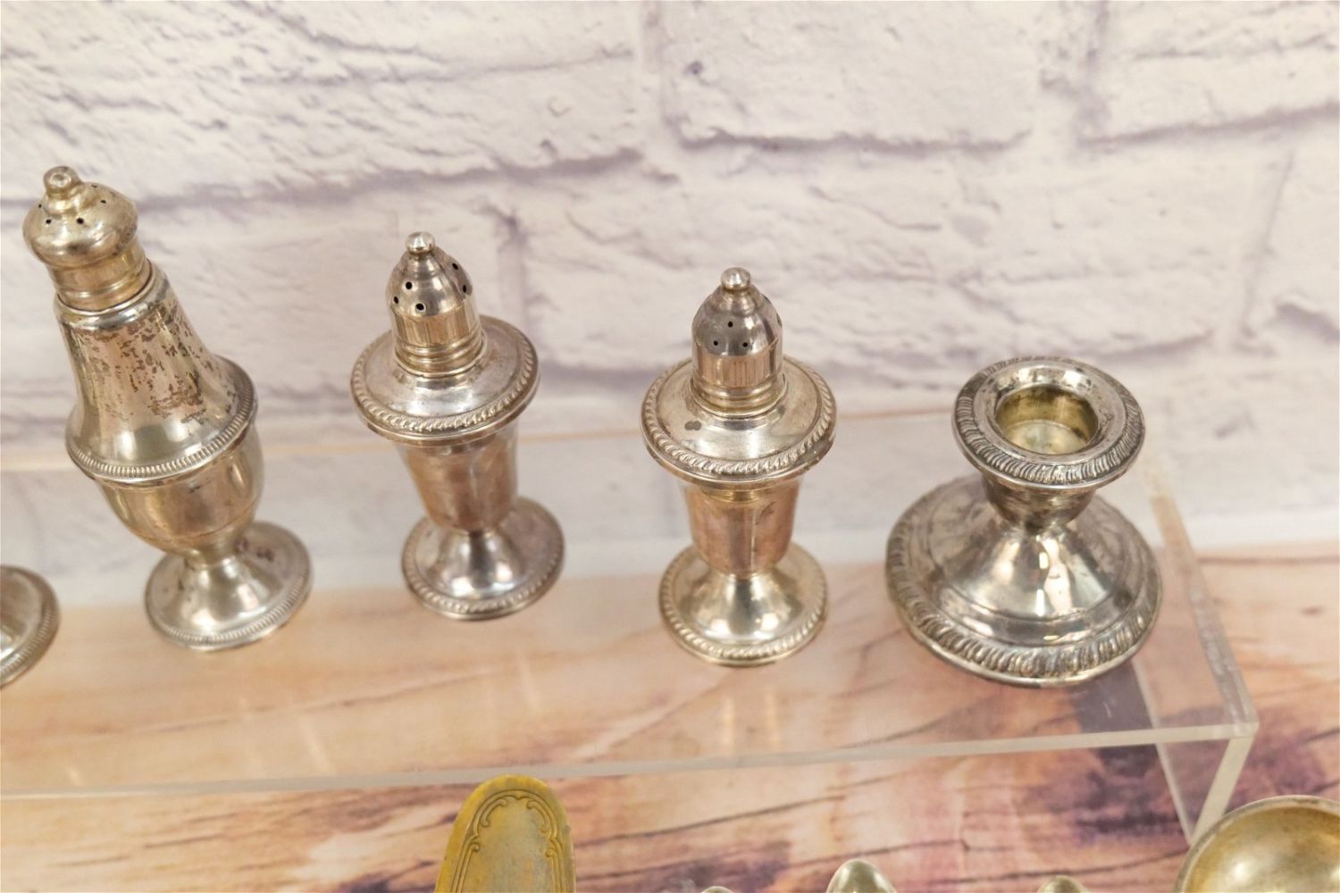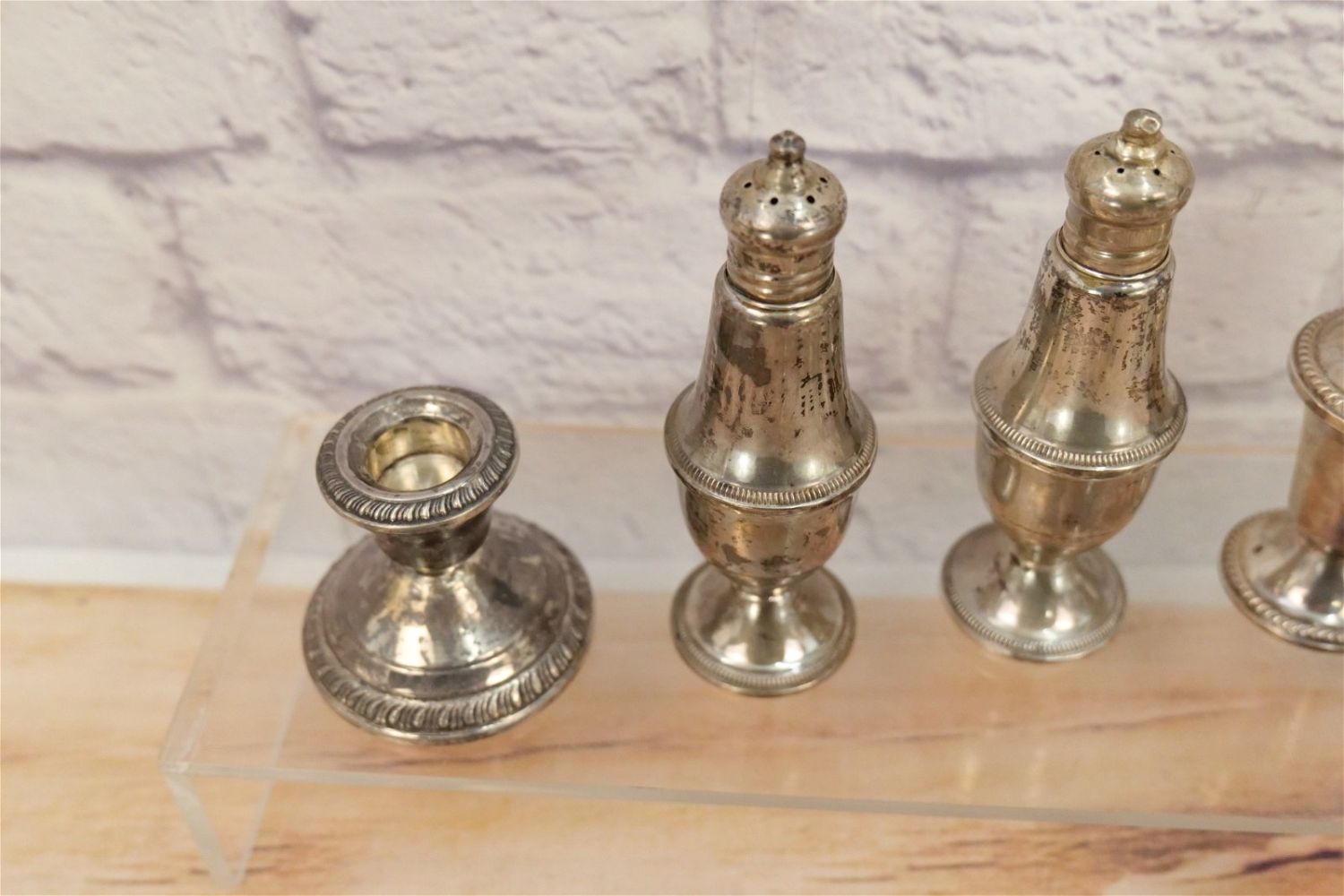 Group Lot of Silver Pieces including (2) Pairs of Sterling Weighted Salt & Peppers, Pair of Sterling Weighted Candlesticks, Set of (6) 800 Silver Miniature Fruit Spoons, Sterling Silver Ladle, Sterling Banded with Mother of Pearl Handled Knives – Set of 5, 800 Silver Sugar Scoop, Sterling Table Salt Spoon, and 800 Silver Handled Pie Server. Largest piece measures 5.5" tall. Some pieces have minor denting. All invoices must be paid within 24 hours of the sale. We offer multiple shipping options, please read the terms as they have changed. We also offer Pick-Ups Thursday, Friday, Saturday, and Monday immediately following the sale. BY APPOINTMENT ONLY. PLEASE READ THE NEW TERMS!!!