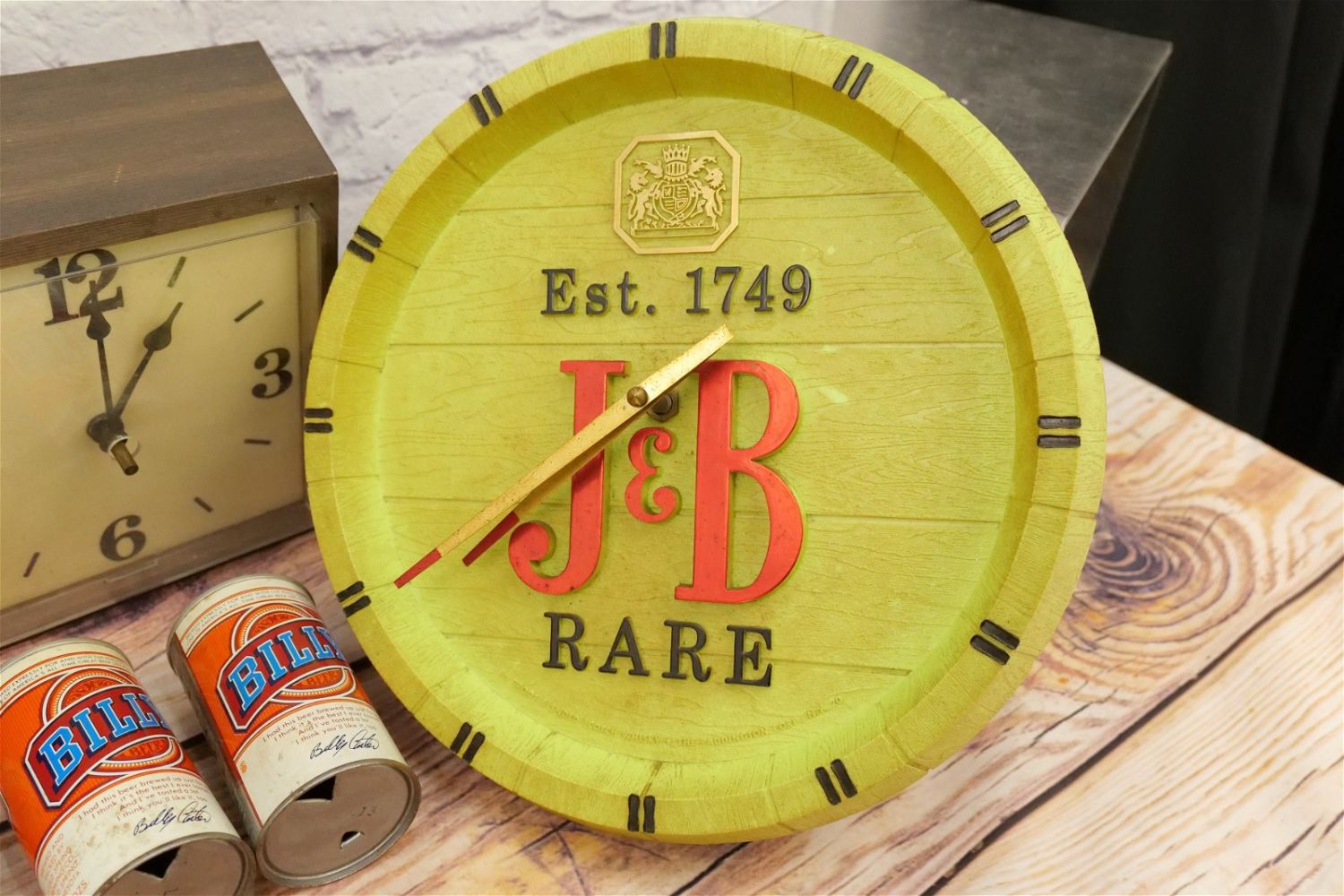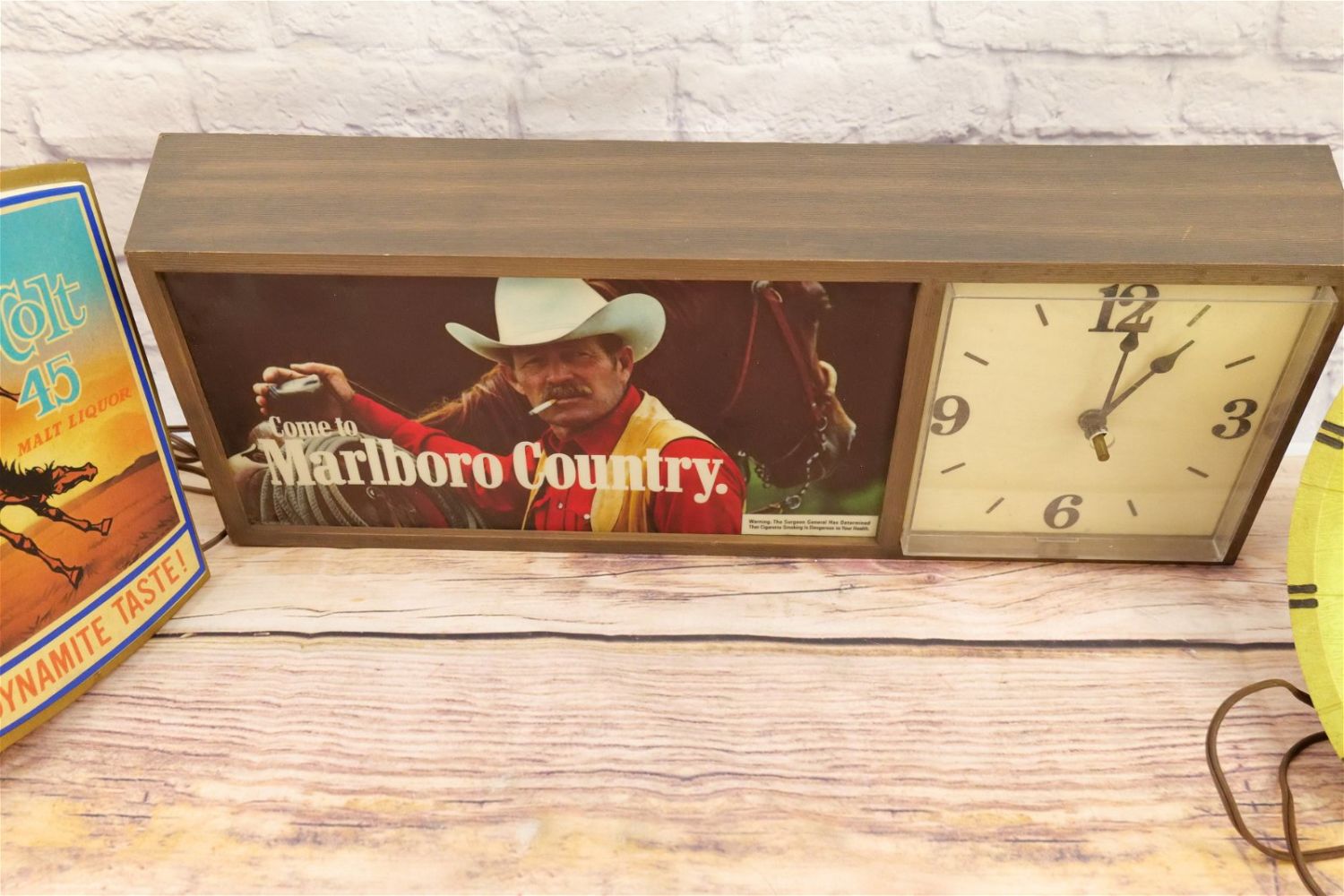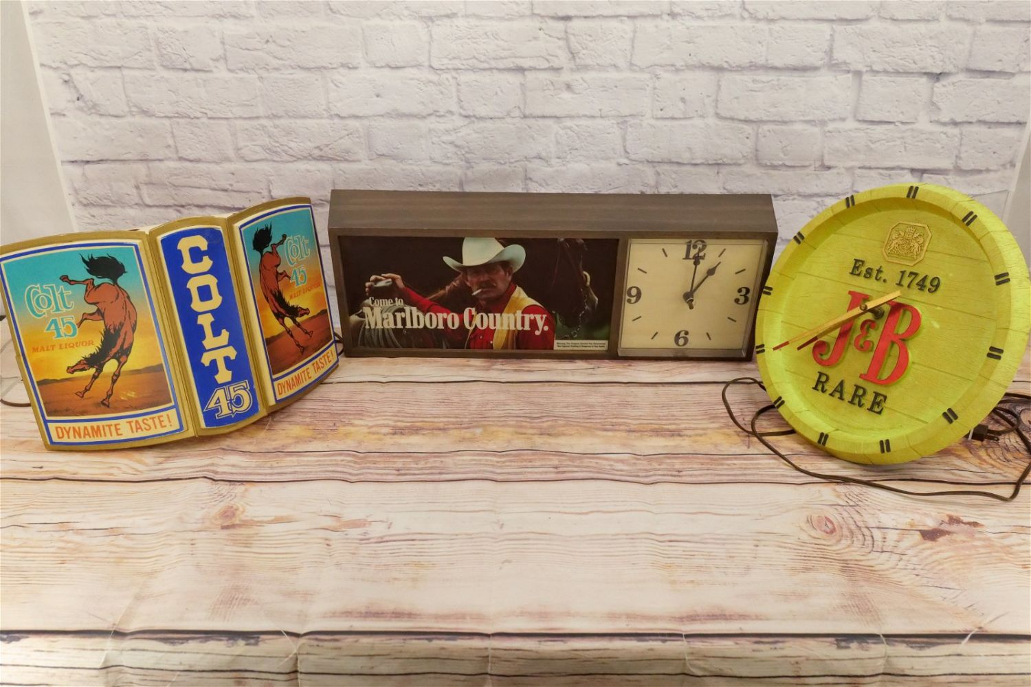 Group Lot of Advertising including Come to Marlboro Cigarette Clock – Tested and Working, J&B Clock – Clock Runs – Needs Lightbulb, Colt 45 Lighted Advertisement – Untested, and Rolling Rock Premium Beer Chalkware Barback Sign, Carlings Red Ale Sign, and 6 Pack of Vintage Billy Beer Tin Cans. Marlboro Clock measures 10" tall x 25" wide. All invoices must be paid within 24 hours of the sale. We offer multiple shipping options, please read the terms as they have changed. We also offer Pick-Ups Thursday, Friday, Saturday, and Monday immediately following the sale. BY APPOINTMENT ONLY. PLEASE READ THE NEW TERMS!!!