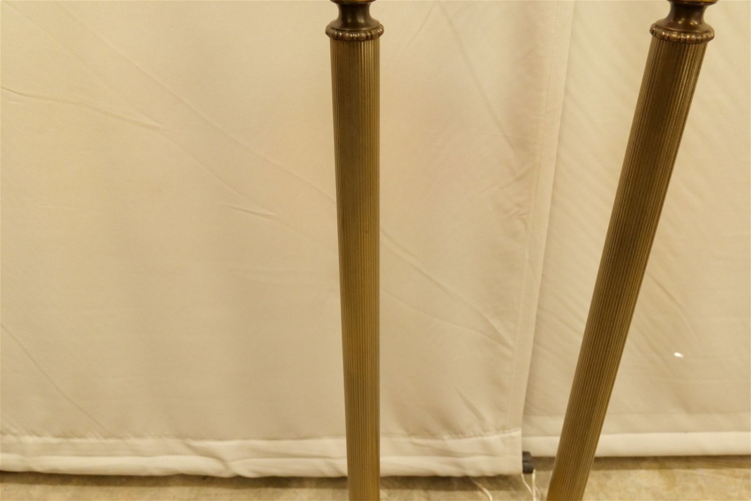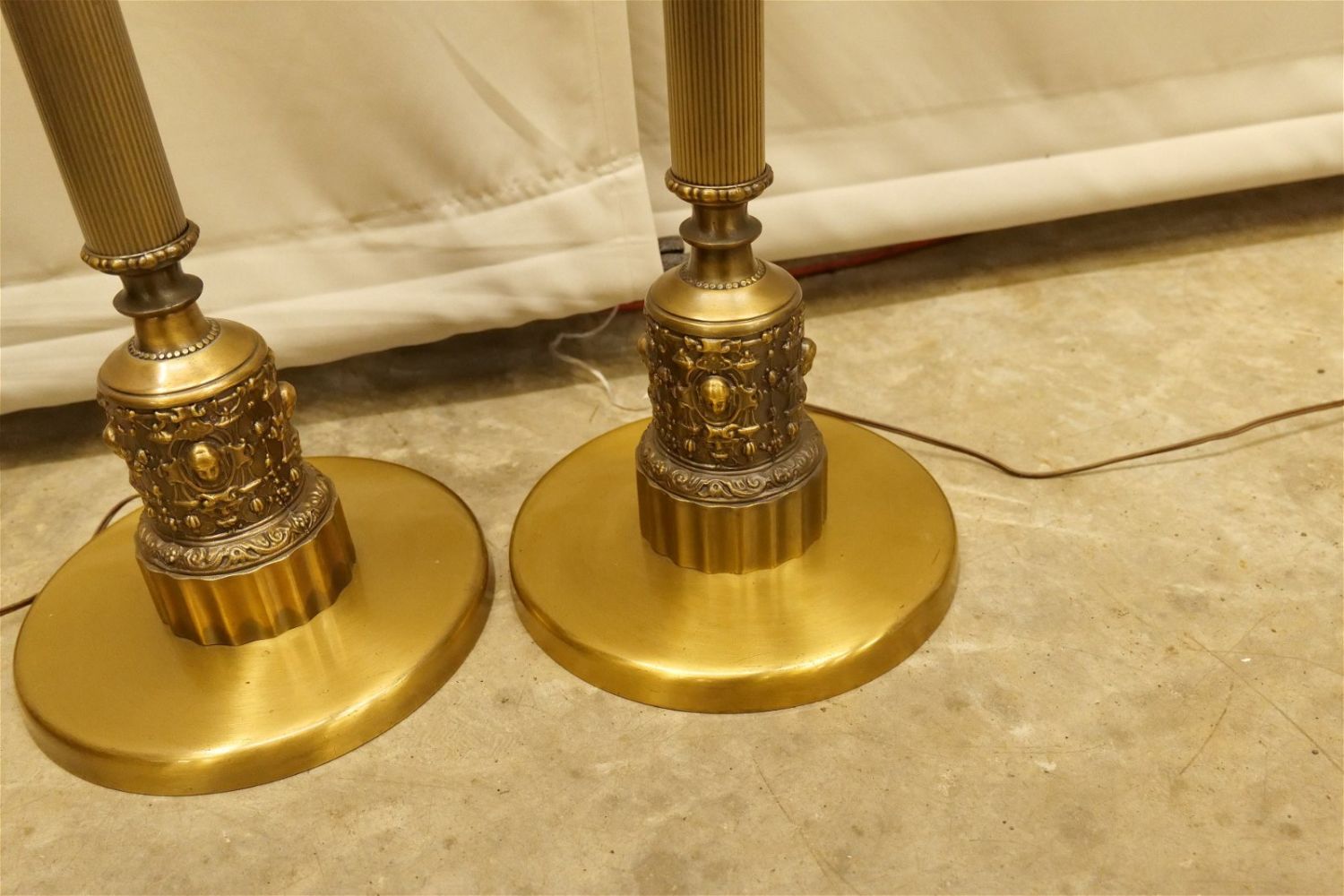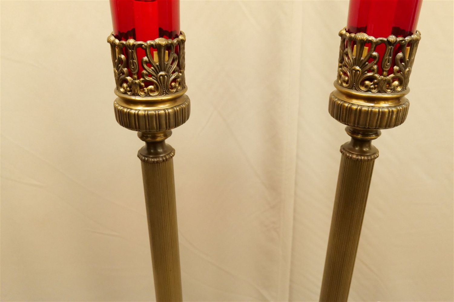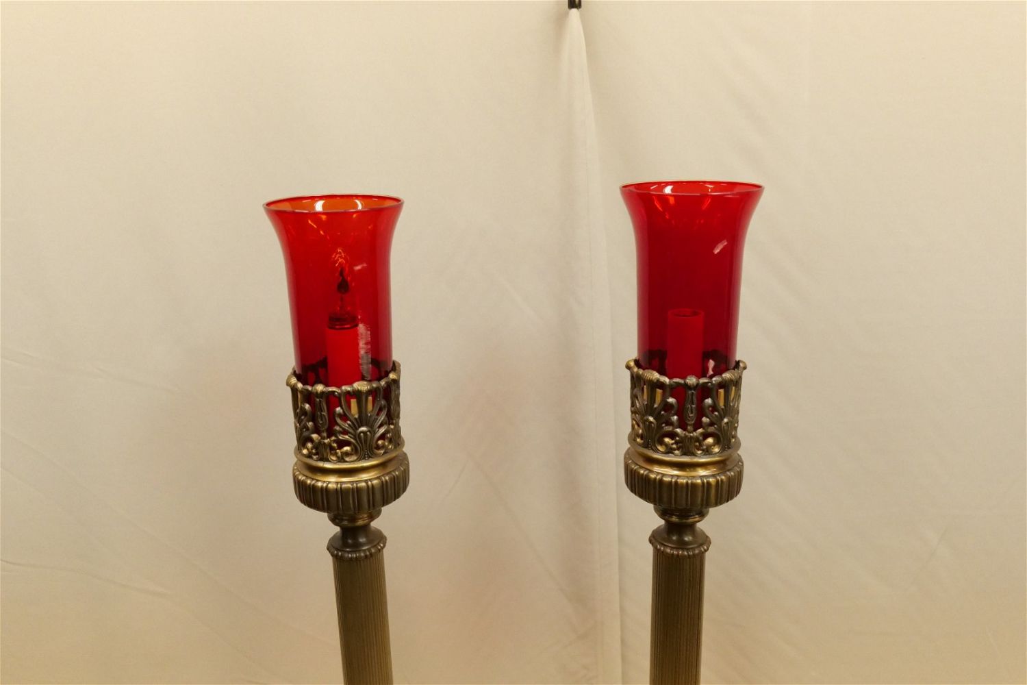 Pair of Torchiere Single Candlestick Lights. Comes with Red Shades. Working. Measures 55" tall with 5" diameter shade. All invoices must be paid within 24 hours of the sale. We offer multiple shipping options, please read the terms as they have changed. We also offer Pick-Ups Thursday, Friday, Saturday, and Monday immediately following the sale. BY APPOINTMENT ONLY. PLEASE READ THE NEW TERMS!!!