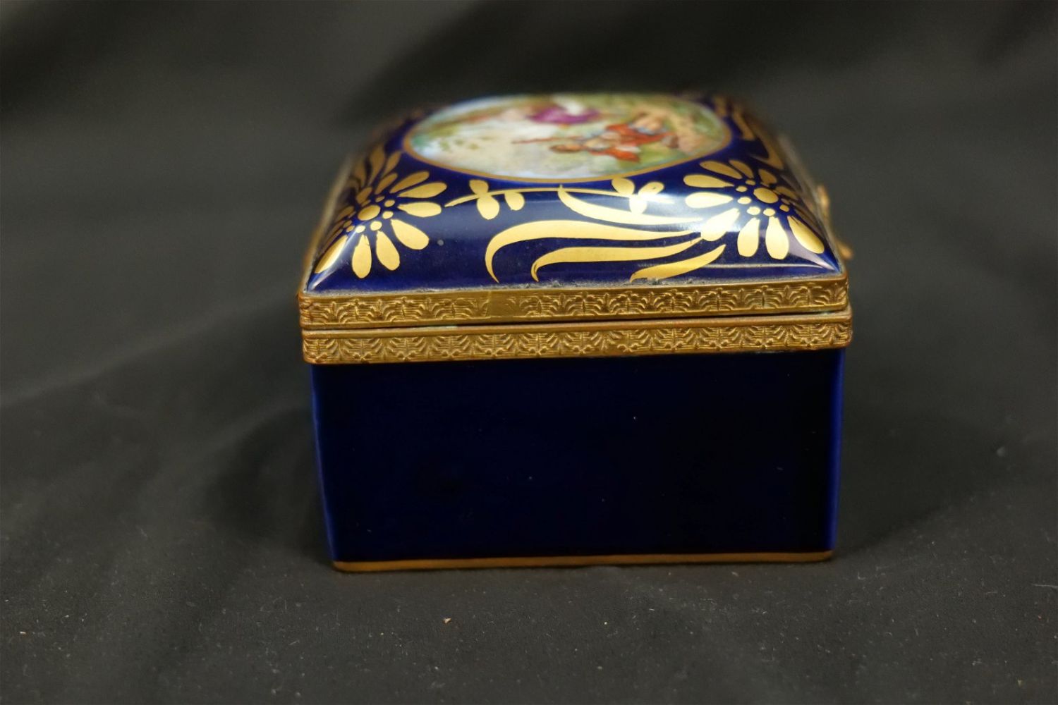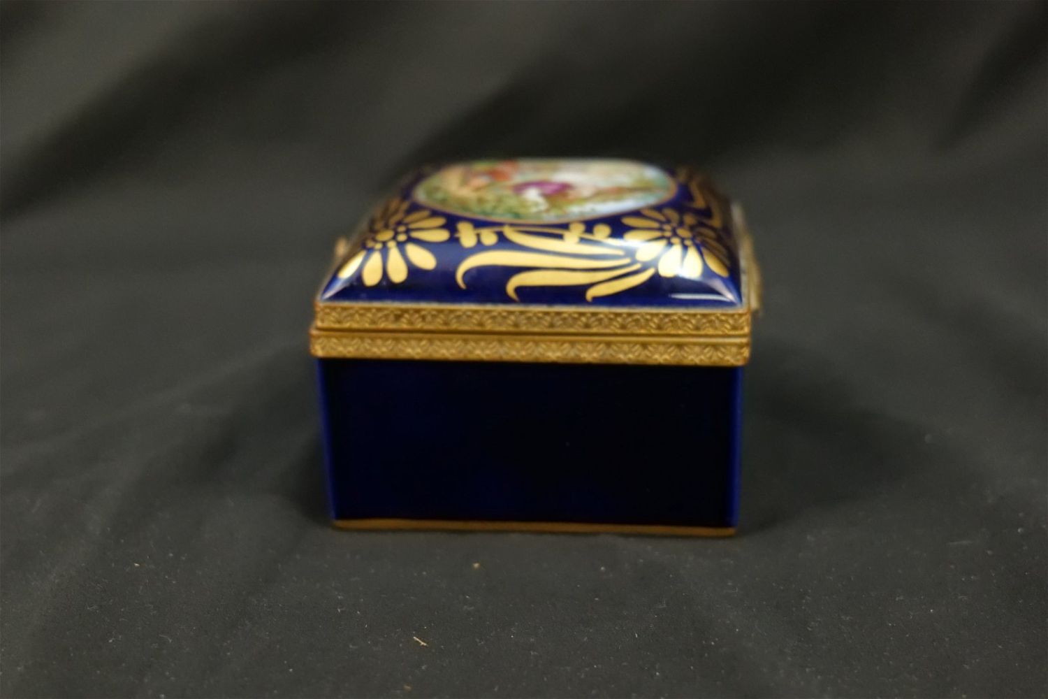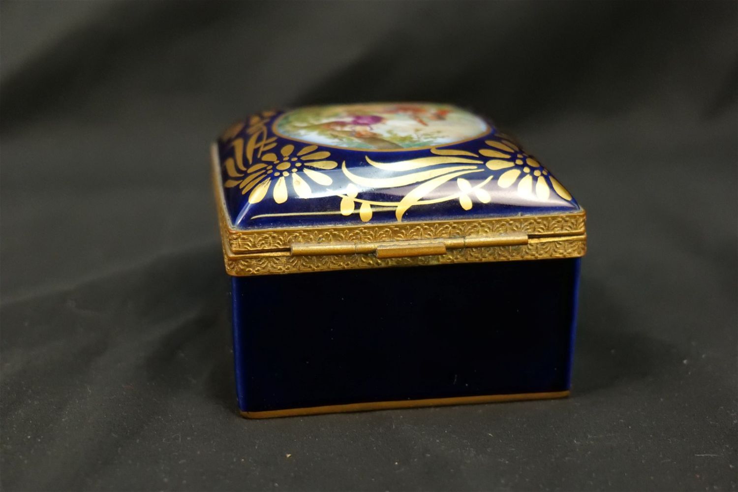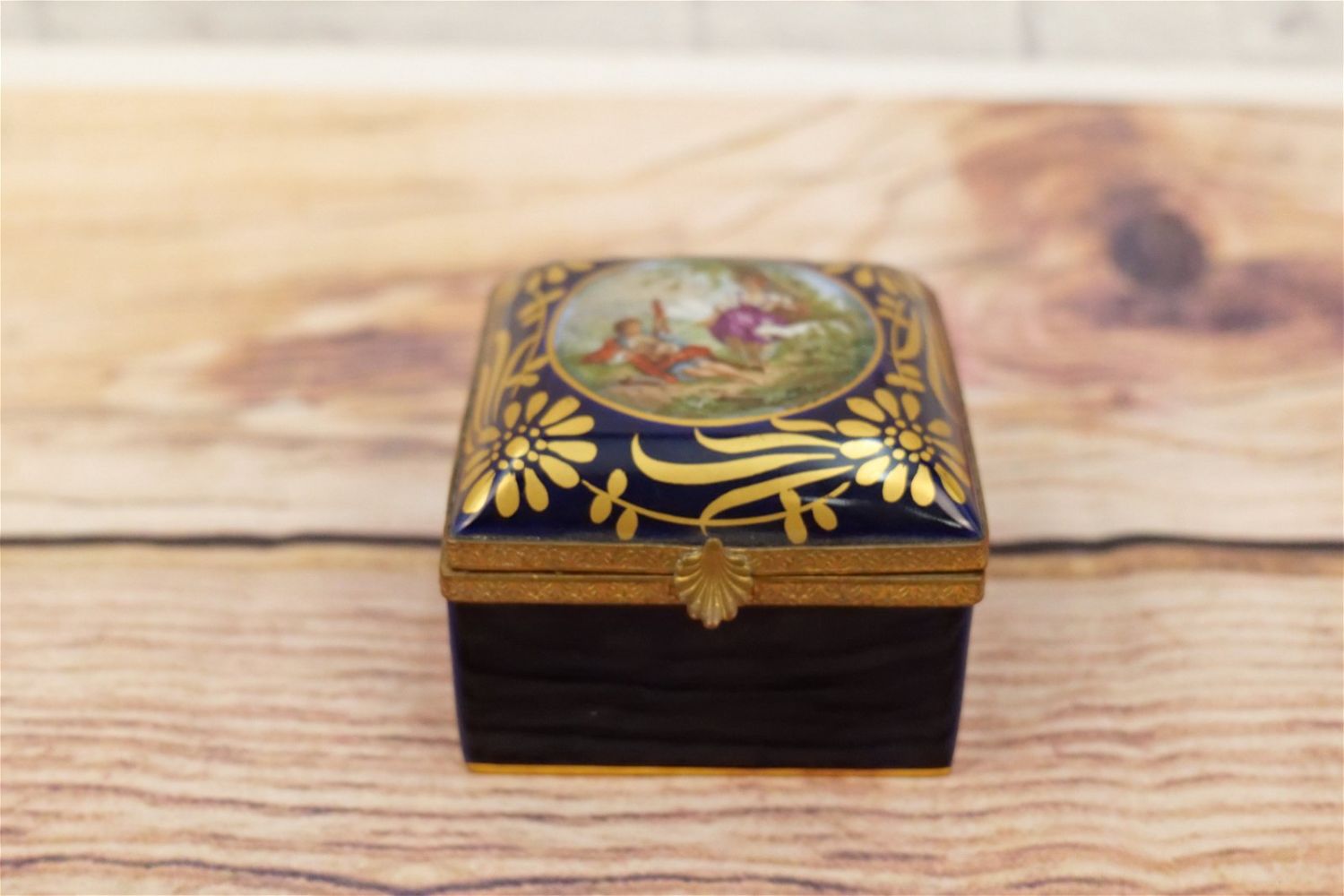 French Hand Painted Dresser Box. Cobalt Blue Gold Gilded with French Scene. Has hand painted interior. Marked Chateau Des Etoiles. Measures 3" tall x 4" long. All invoices must be paid within 24 hours of the sale. We offer multiple shipping options, please read the terms as they have changed. We also offer Pick-Ups Thursday, Friday, Saturday, and Monday immediately following the sale. BY APPOINTMENT ONLY. PLEASE READ THE NEW TERMS!!!
