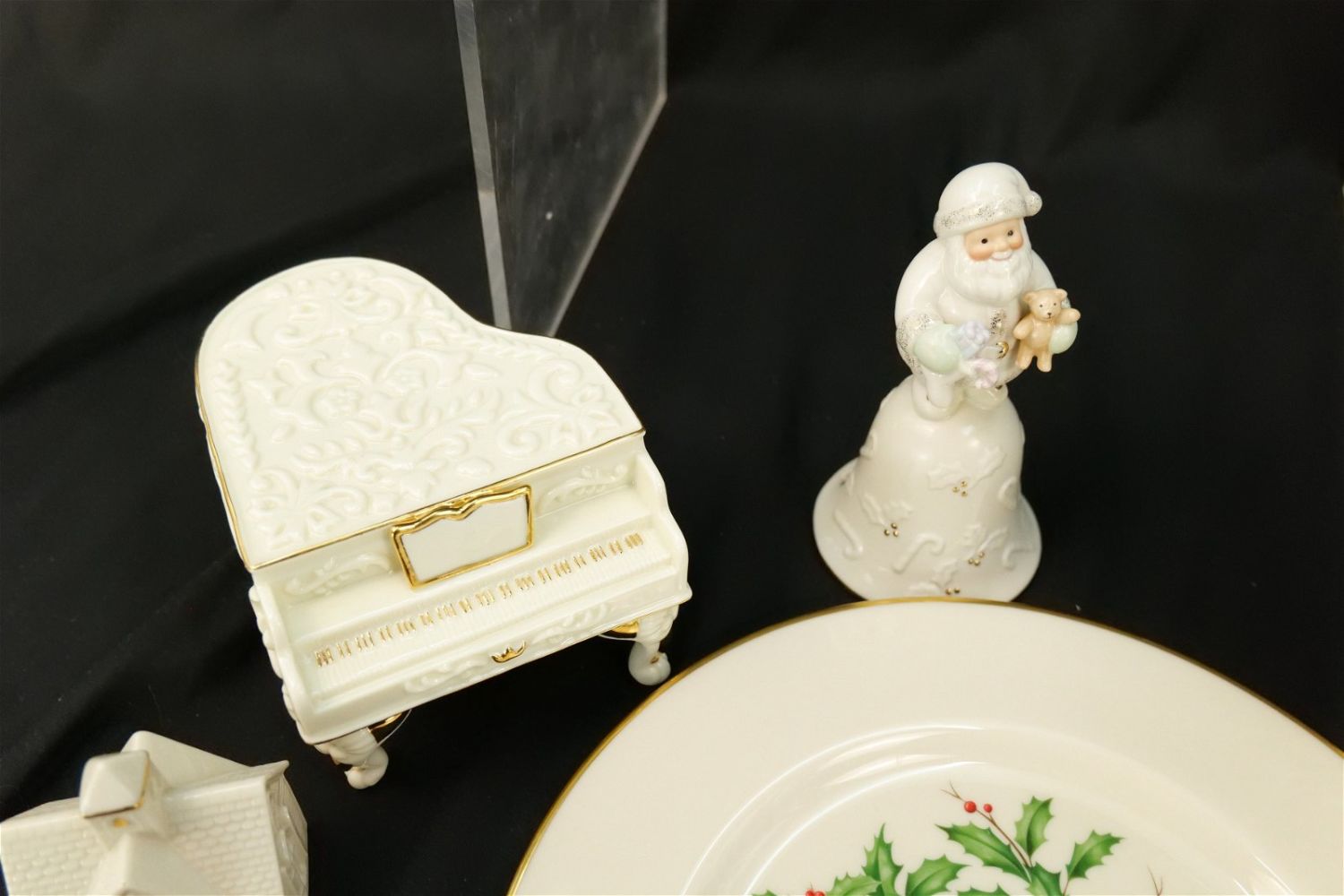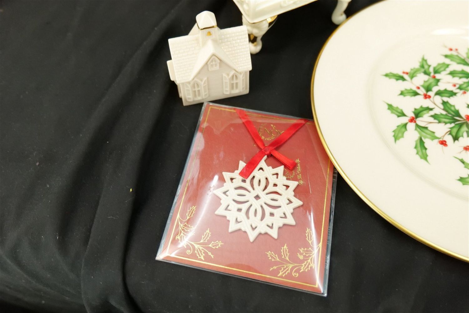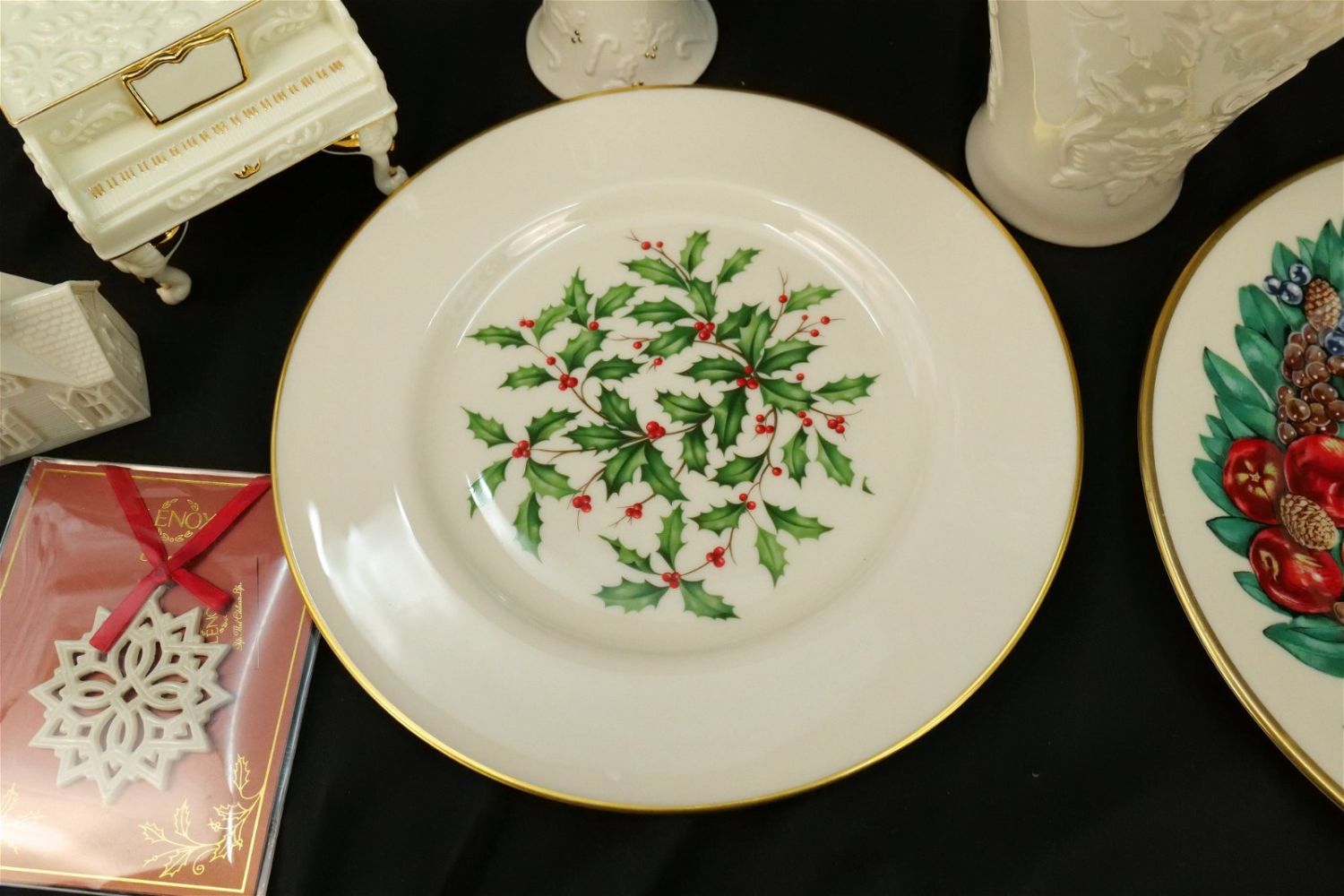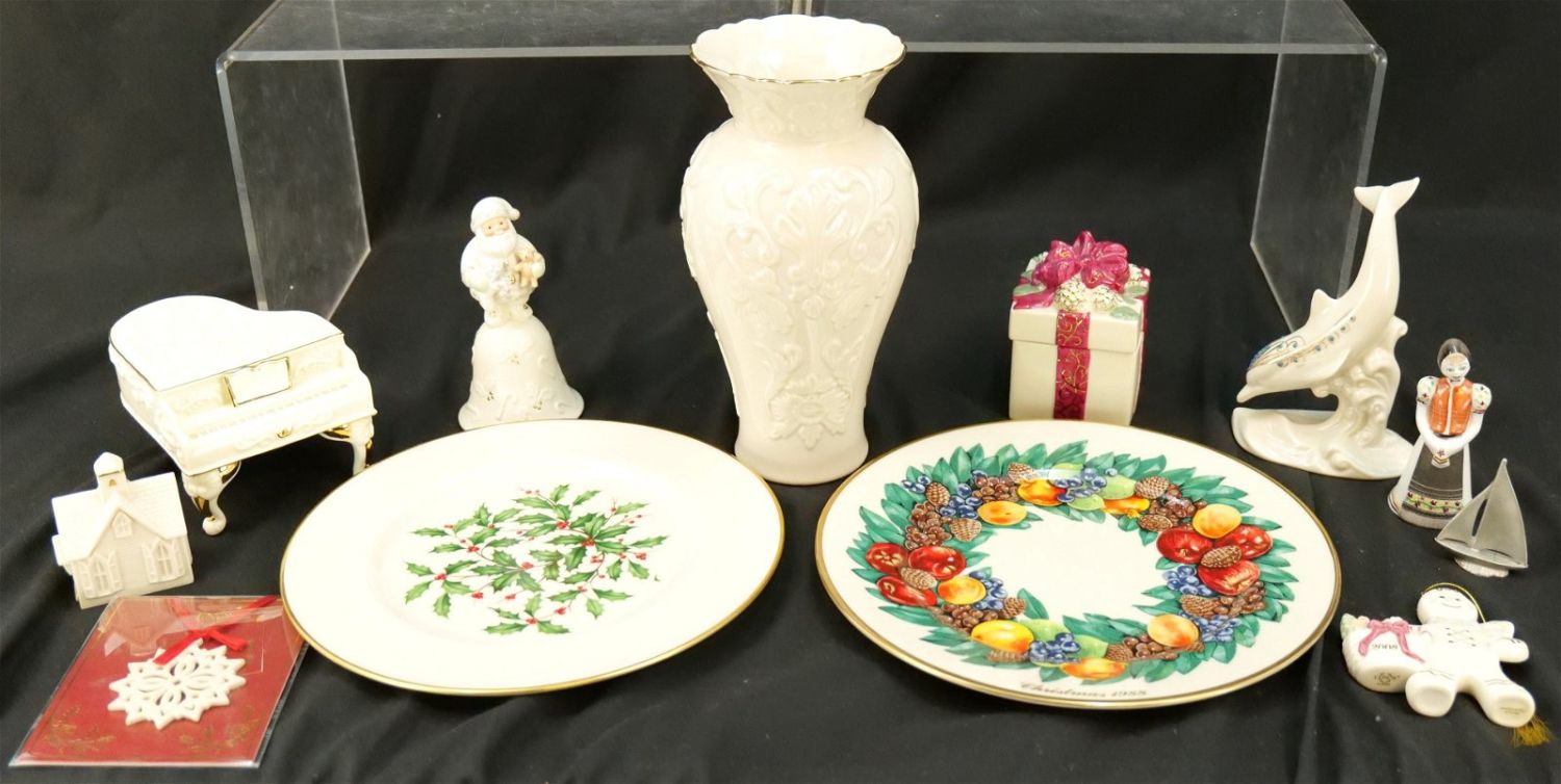 Group Lot of Mostly Lenox. Lenox includes Tall Vase, Diving Dolphin, Village Church Christmas Village, Holiday Wishes Gift Box, 2008 Gingerbread Christmas Ornament, 2001 Santa’s Joyous Jingle Bell, Pierced Star Christmas Ornament, Colonial Reissue Delaware, and Ivy Dinner Plate. Lot also contains San Francisco Music Co. Piano Music Box, Pewter Sailboat and Hollahazza Lady Figurine. Largest measures 10" tall. All invoices must be paid within 24 hours of the sale. We offer multiple shipping options, please read the terms as they have changed. We also offer Pick-Ups Thursday, Friday, Saturday, and Monday immediately following the sale. BY APPOINTMENT ONLY. PLEASE READ THE NEW TERMS!!!