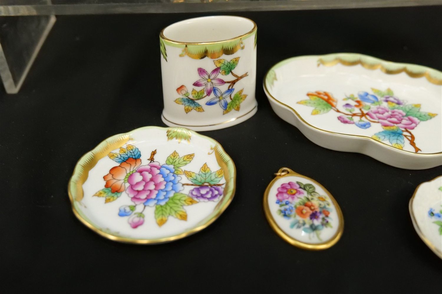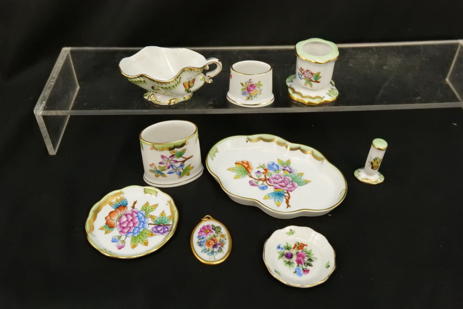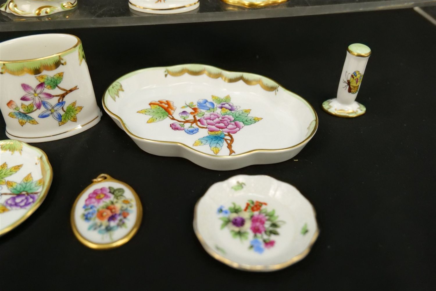 Group Lot of 9 Herend Pieces of Tableware including Miniature Creamer, Toothpick Holders, Candlestick Holder, Stamper, Dresser Trays, and Necklace Pendant. Mostly Queen Victoria plus Other Patterns. Largest measures 2.5" tall. All invoices must be paid within 24 hours of the sale. We offer multiple shipping options, please read the terms as they have changed. We also offer Pick-Ups Thursday, Friday, Saturday, and Monday immediately following the sale. BY APPOINTMENT ONLY. PLEASE READ THE NEW TERMS!!!