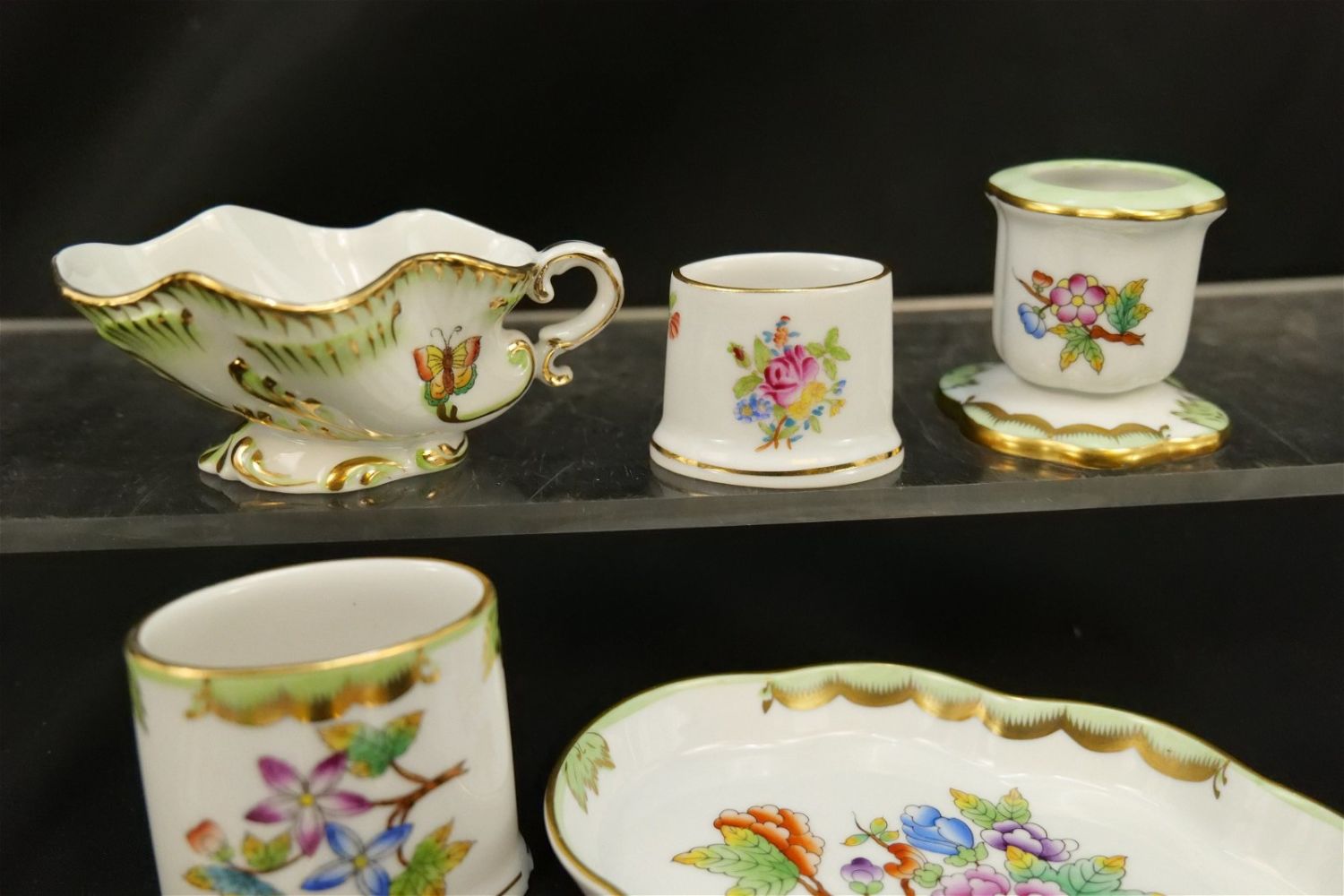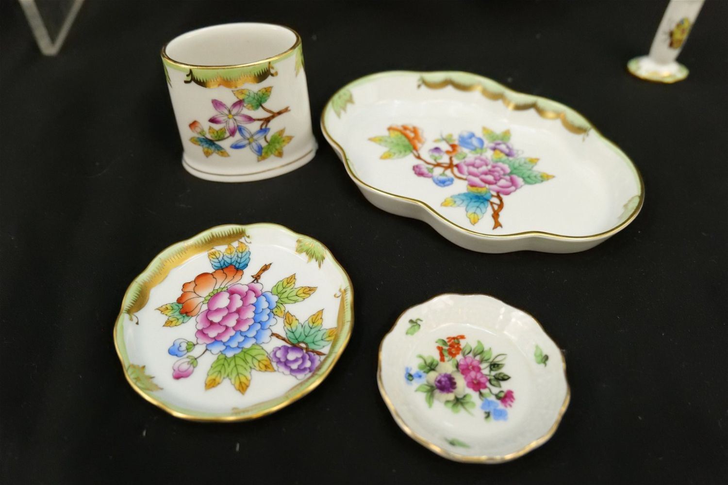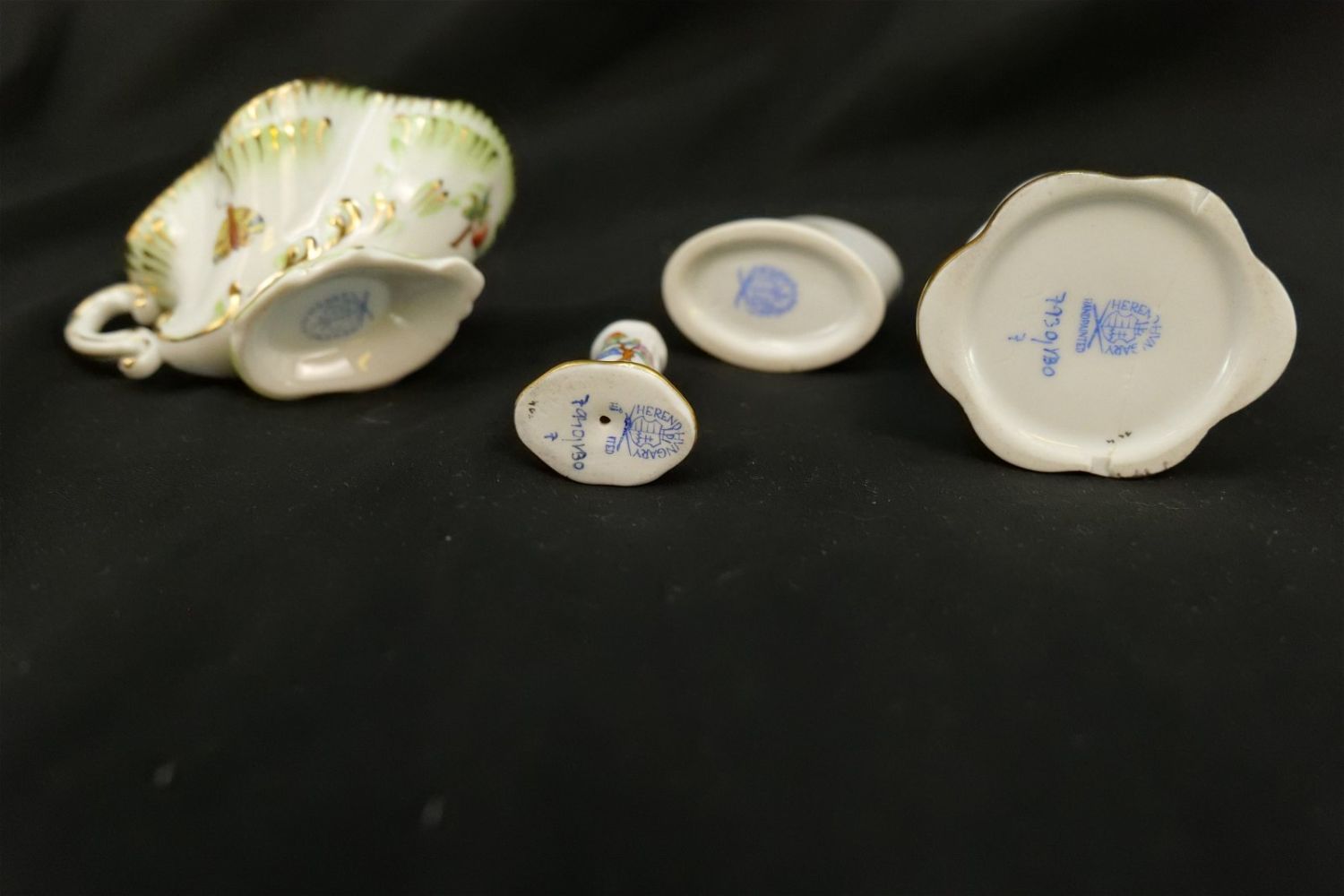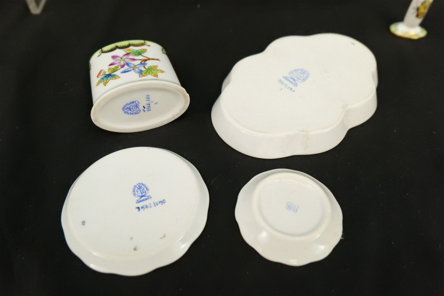 Group Lot of 9 Herend Pieces of Tableware including Miniature Creamer, Toothpick Holders, Candlestick Holder, Stamper, Dresser Trays, and Necklace Pendant. Mostly Queen Victoria plus Other Patterns. Largest measures 2.5" tall. All invoices must be paid within 24 hours of the sale. We offer multiple shipping options, please read the terms as they have changed. We also offer Pick-Ups Thursday, Friday, Saturday, and Monday immediately following the sale. BY APPOINTMENT ONLY. PLEASE READ THE NEW TERMS!!!