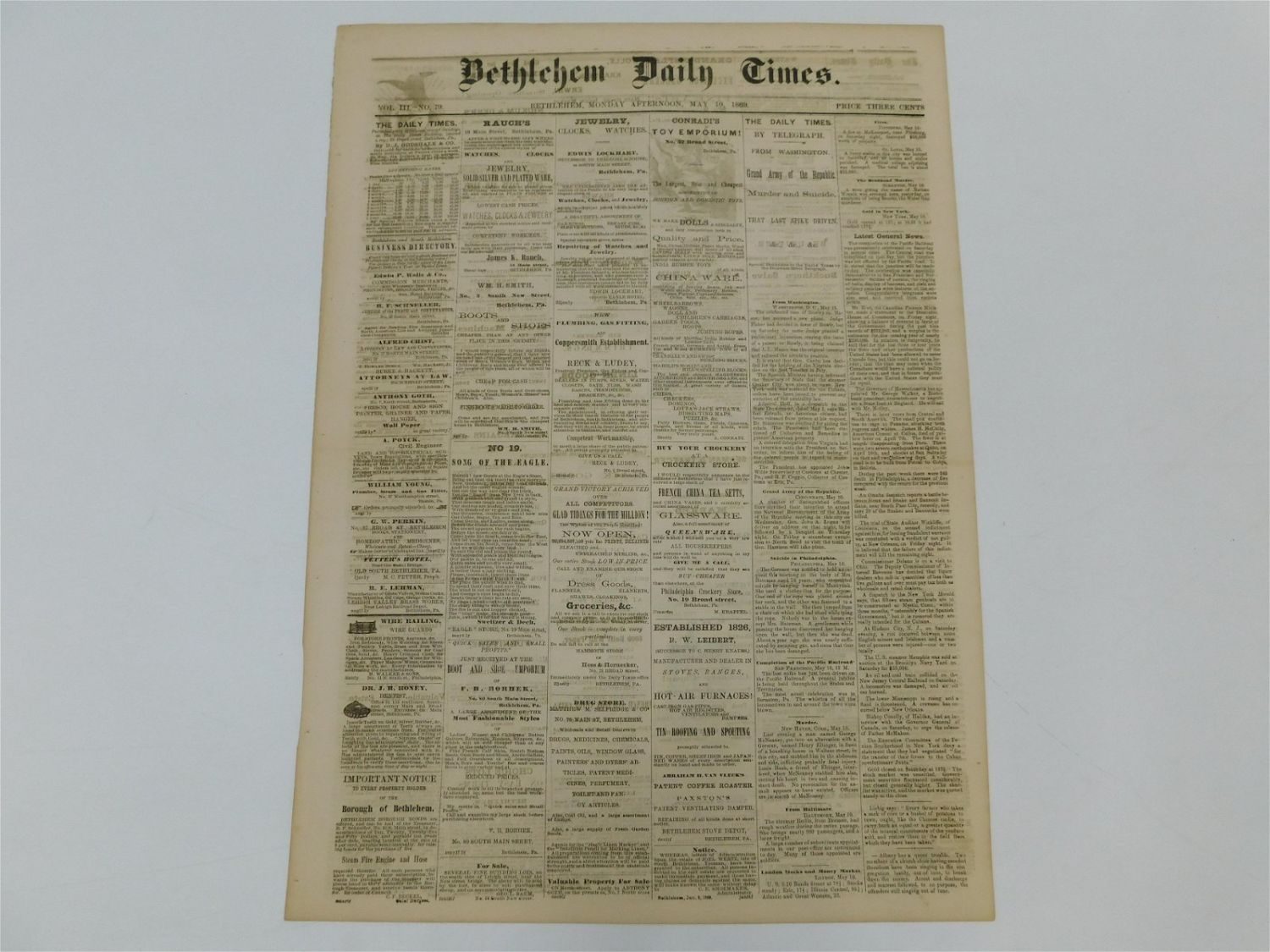 May 10th 1869 Bethlehem Daily Times Newspaper Reporting on the completion of the Pacific Railroad which should have been completed that day. Also discussing the GAR. Appears to be complete and in excellent condition for age. All invoices must be paid within 24 hours of the sale. All items are shipped USPS or UPS and will be billed separately. A $12 handling fee is added to the shipping price per lot if shipped in house. Some items or large quantity of purchases will be packed and shipped via the Monmouth Junction UPS store. Local pickups are at our Monmouth Junction location on Friday, Saturday and Monday ONLY! All pickups are by appointment only. Any condition issues will be listed in the description. Please read the terms for full information.