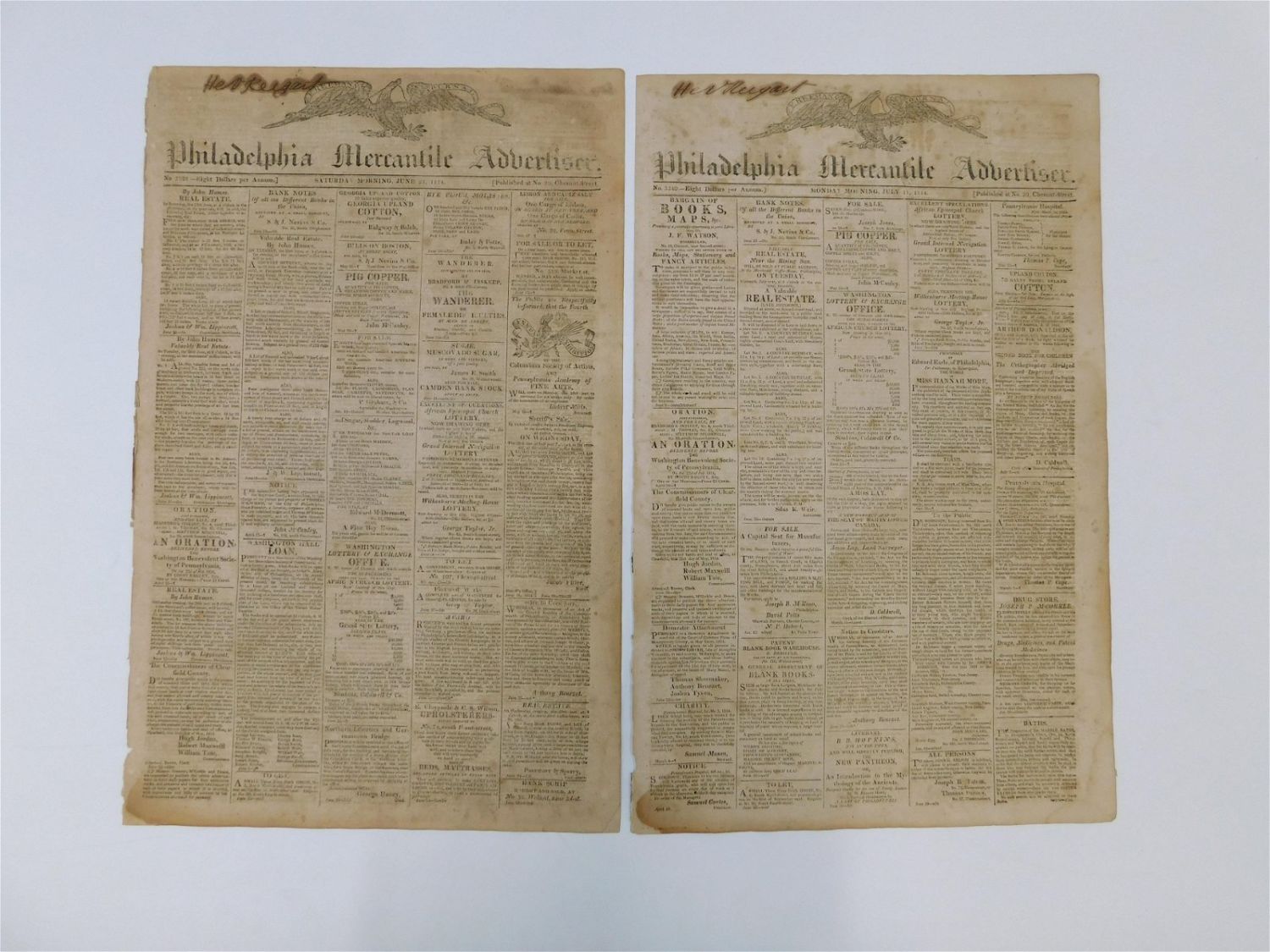 Lot of 2 Philadelphia Mercantile Advertisers from 1814 filled with advertising, reporting on Napoleon, The Latest from England, plus more and other filled with many advertisements and reporting on Napoleon, plus more. Both appear to be complete with some discoloration and minor loss to edges. All invoices must be paid within 24 hours of the sale. All items are shipped USPS or UPS and will be billed separately. A $12 handling fee is added to the shipping price per lot if shipped in house. Some items or large quantity of purchases will be packed and shipped via the Monmouth Junction UPS store. Local pickups are at our Monmouth Junction location on Friday, Saturday and Monday ONLY! All pickups are by appointment only. Any condition issues will be listed in the description. Please read the terms for full information.