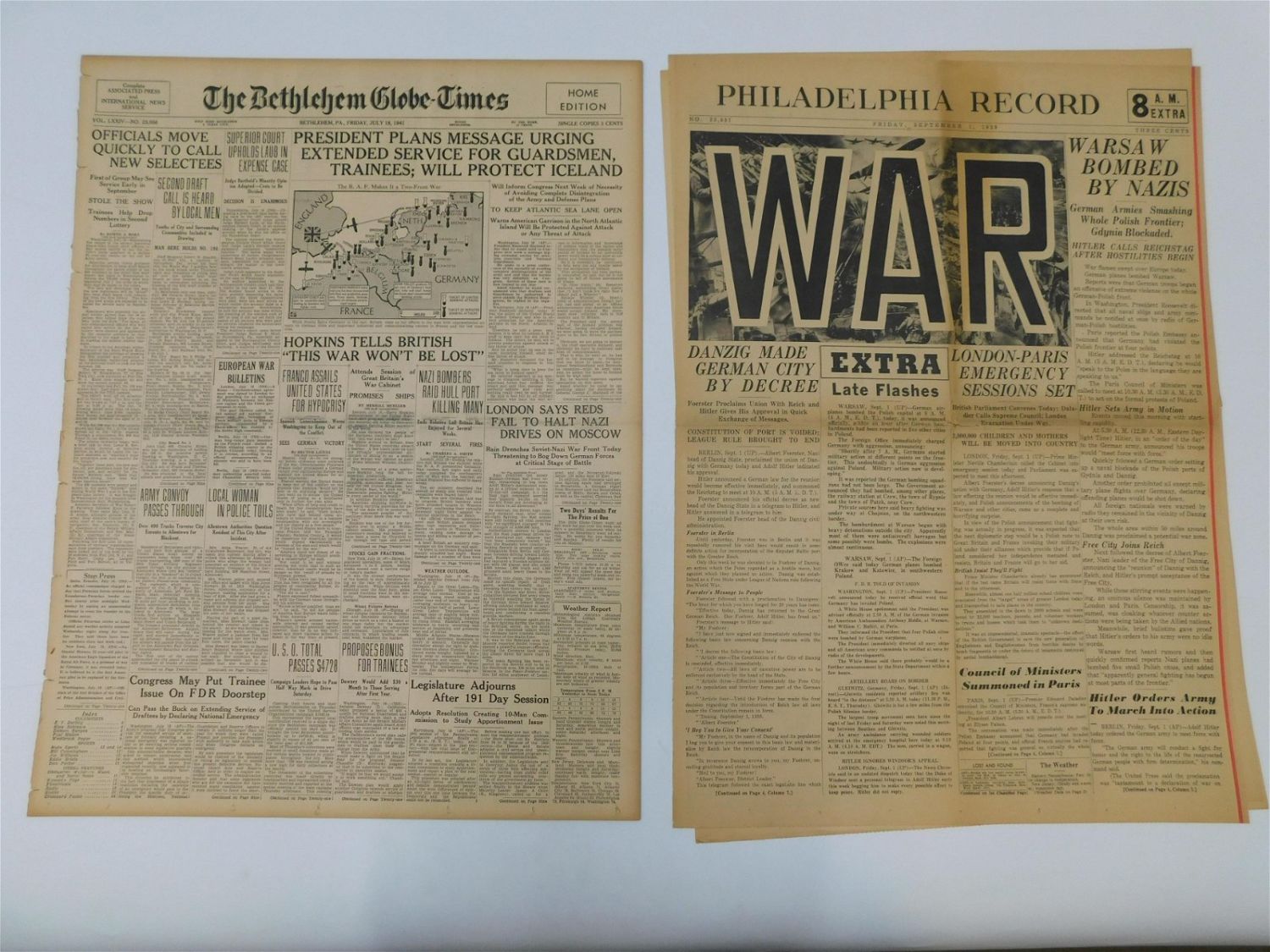 Lot of 2 WWII Related Newspapers including The Bethlehem Globe Times 7-18-1941 discussing various issues on the war and Philadelphia Record 9-1-1939 "War" Warsaw Bombed by Nazi’s, Hitler Orders Army to March into Action and other articles relating to Hitler’s Invasion of Poland. Some loss to edges and discoloration. All invoices must be paid within 24 hours of the sale. All items are shipped USPS or UPS and will be billed separately. A $12 handling fee is added to the shipping price per lot if shipped in house. Some items or large quantity of purchases will be packed and shipped via the Monmouth Junction UPS store. Local pickups are at our Monmouth Junction location on Friday, Saturday and Monday ONLY! All pickups are by appointment only. Any condition issues will be listed in the description. Please read the terms for full information.