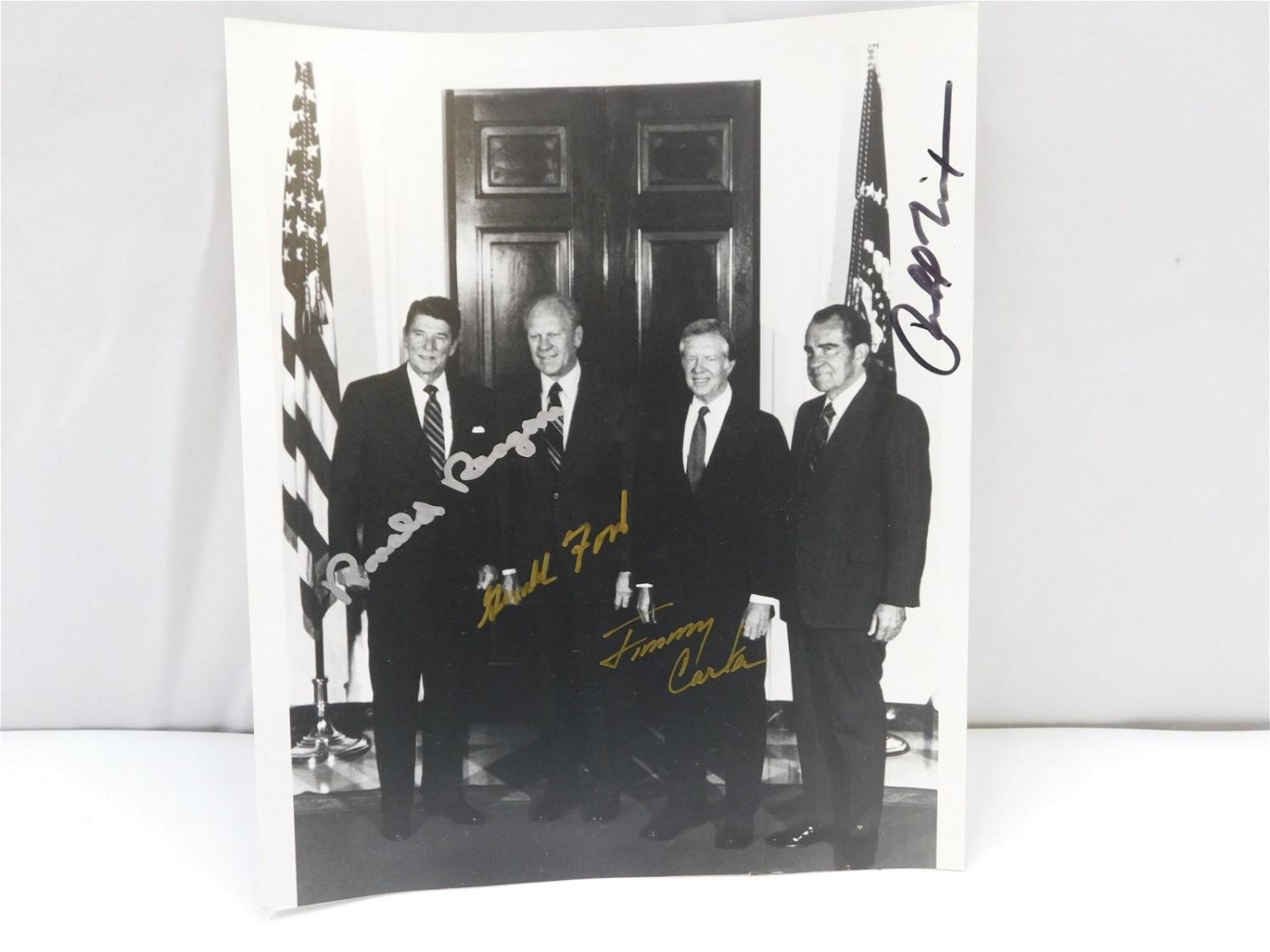 Black and White Photo of 4 US Presidents. 8×10. Signed by Ronald Reagan, Gerald Ford, Richard Nixon, and Jimmy Carter. 3 in metallic marker and 1 in black marker. Comes with STAT COA. All invoices must be paid within 24 hours of the sale. All items are shipped USPS or UPS and will be billed separately. A $12 handling fee is added to the shipping price per lot if shipped in house. Some items or large quantity of purchases will be packed and shipped via the Monmouth Junction UPS store. Local pickups are at our Monmouth Junction location on Friday, Saturday and Monday ONLY! All pickups are by appointment only. Any condition issues will be listed in the description. Please read the terms for full information.