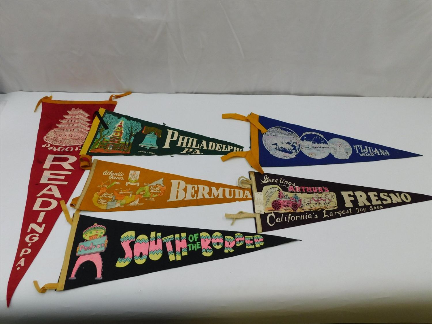 Lot of Vintage Souvenir Pennants including Reading PA, Philadelphia, Fresno, Tajuana, Bermuda, and South of the Border. All in fair to good condition. Measures 26" – 28.5". All invoices must be paid within 24 hours of the sale. All items are shipped USPS or UPS and will be billed separately. A $12 handling fee is added to the shipping price per lot if shipped in house. Some items or large quantity of purchases will be packed and shipped via the Monmouth Junction UPS store. Local pickups are at our Monmouth Junction location on Friday, Saturday and Monday ONLY! All pickups are by appointment only. Any condition issues will be listed in the description. Please read the terms for full information.