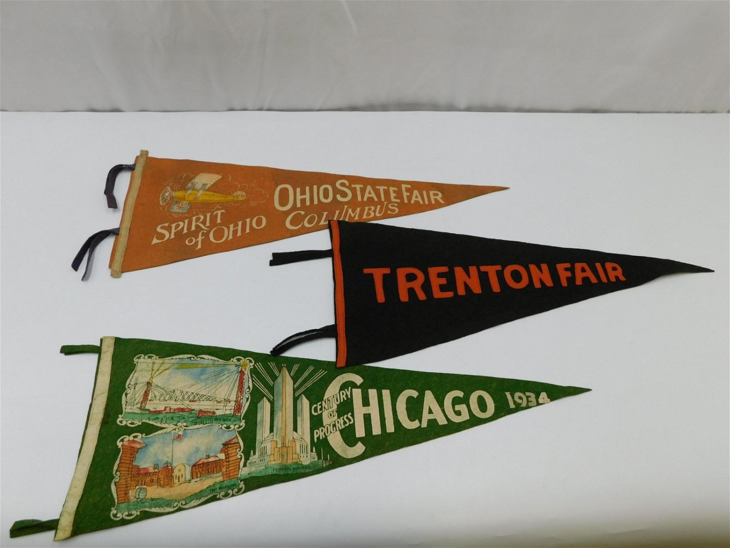Lot of 3 Vintage Fair Pennants including Ohio State Columbus Spirit of St. Louis, Trenton Fair, and Chicago World’s Fair with 1934 printed over 1933 and images of attractions on left. All in good condition. Measures approx. 26" – 28.5" long. All invoices must be paid within 24 hours of the sale. All items are shipped USPS or UPS and will be billed separately. A $12 handling fee is added to the shipping price per lot if shipped in house. Some items or large quantity of purchases will be packed and shipped via the Monmouth Junction UPS store. Local pickups are at our Monmouth Junction location on Friday, Saturday and Monday ONLY! All pickups are by appointment only. Any condition issues will be listed in the description. Please read the terms for full information.