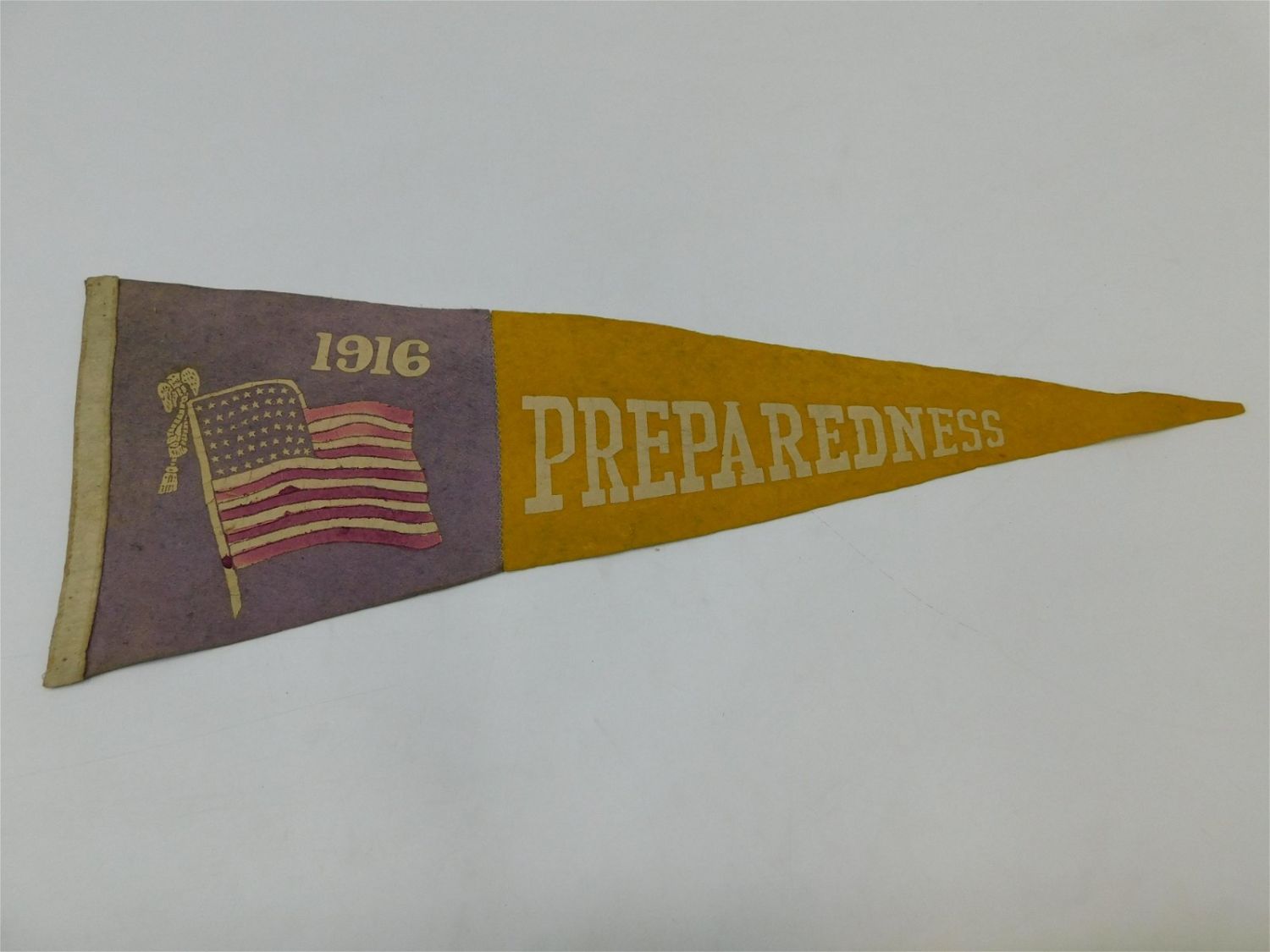 Vintage 1916 Preparedness Pennant. Comes in 2 sections with a lavender portion on left with American Flag and yellow on right – Stitched Together. From the doomed 1916 Preparedness Parade. In good condition. Measures 29" long. All invoices must be paid within 24 hours of the sale. All items are shipped USPS or UPS and will be billed separately. A $12 handling fee is added to the shipping price per lot if shipped in house. Some items or large quantity of purchases will be packed and shipped via the Monmouth Junction UPS store. Local pickups are at our Monmouth Junction location on Friday, Saturday and Monday ONLY! All pickups are by appointment only. Any condition issues will be listed in the description. Please read the terms for full information.