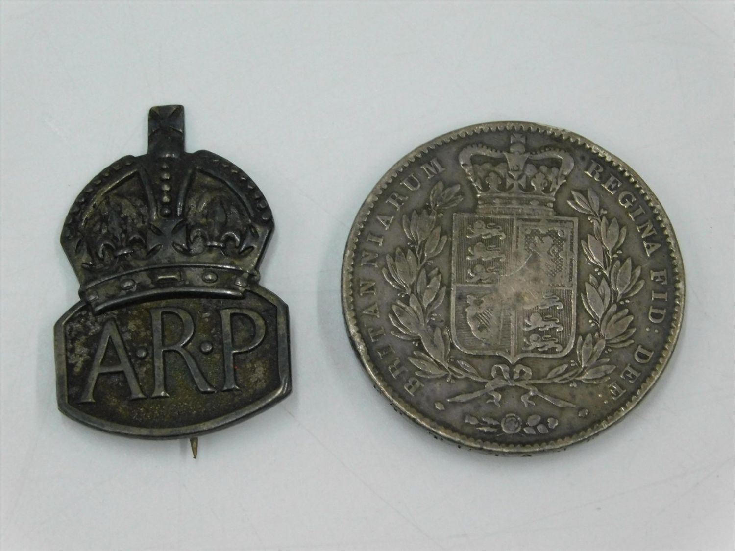 Sterling WWII British Air Raid Precaution Pin and Sterling 1845 Victoria Silver Crown that has been made into a pin. Measures 1.5". All invoices must be paid within 24 hours of the sale. All items are shipped USPS or UPS and will be billed separately. A $12 handling fee is added to the shipping price per lot if shipped in house. Some items or large quantity of purchases will be packed and shipped via the Monmouth Junction UPS store. Local pickups are at our Monmouth Junction location on Friday, Saturday and Monday ONLY! All pickups are by appointment only. Any condition issues will be listed in the description. Please read the terms for full information.