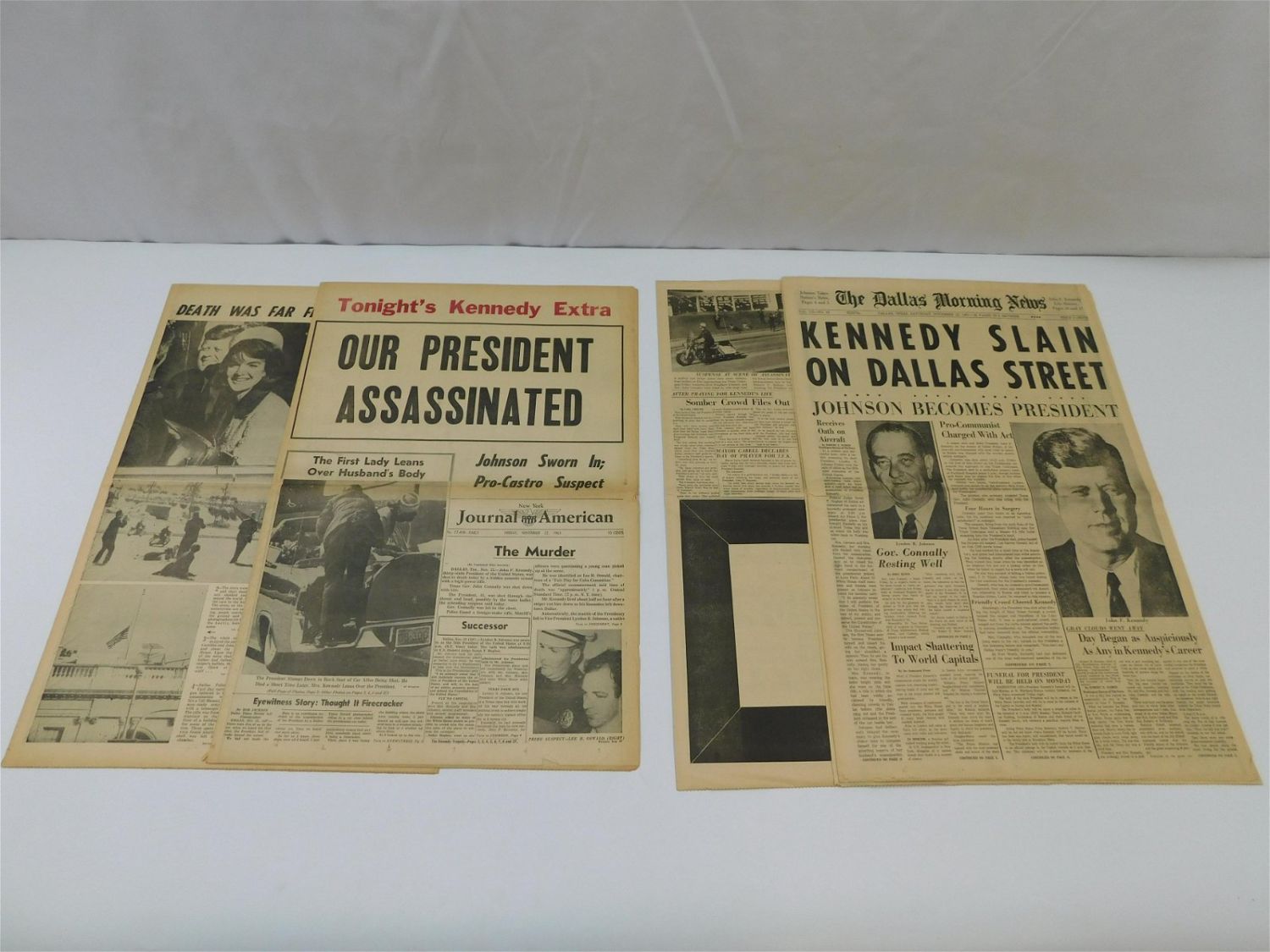 Lot of 2 Kennedy Assassination Newspapers including New York Journal American "Our President Assassinated" 11-22-63 and The Dallas Morning News "Kennedy Slain on Dallas Street" 11-23-63. Both appear to be complete and are in excellent condition with extremely minor tears to the bottom on both. All invoices must be paid within 24 hours of the sale. All items are shipped USPS or UPS and will be billed separately. A $12 handling fee is added to the shipping price per lot if shipped in house. Some items or large quantity of purchases will be packed and shipped via the Monmouth Junction UPS store. Local pickups are at our Monmouth Junction location on Friday, Saturday and Monday ONLY! All pickups are by appointment only. Any condition issues will be listed in the description. Please read the terms for full information.