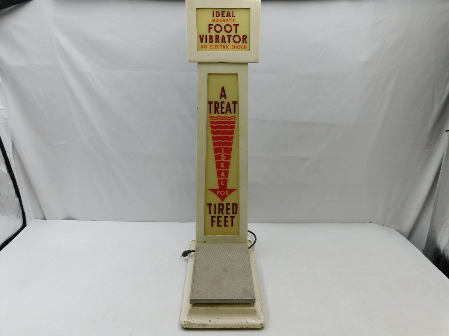 Vintage Carnival/Arcade Ideal Magnetic Foot Vibrator "No Electric Shock" Working Condition. Measures 44" tall x 12" wide. All invoices must be paid within 24 hours of the sale. There are 3 Shipping Options. Please read the Terms of Sale and Shipping Options in the Terms. If you don’t read the terms, you will be upset because you don’t know what is happening. Local pickups are at our Monmouth Junction location on Friday, Saturday and Monday ONLY! All pickups are by appointment only. Any condition issues will be listed in the description. Please read the terms for full information.