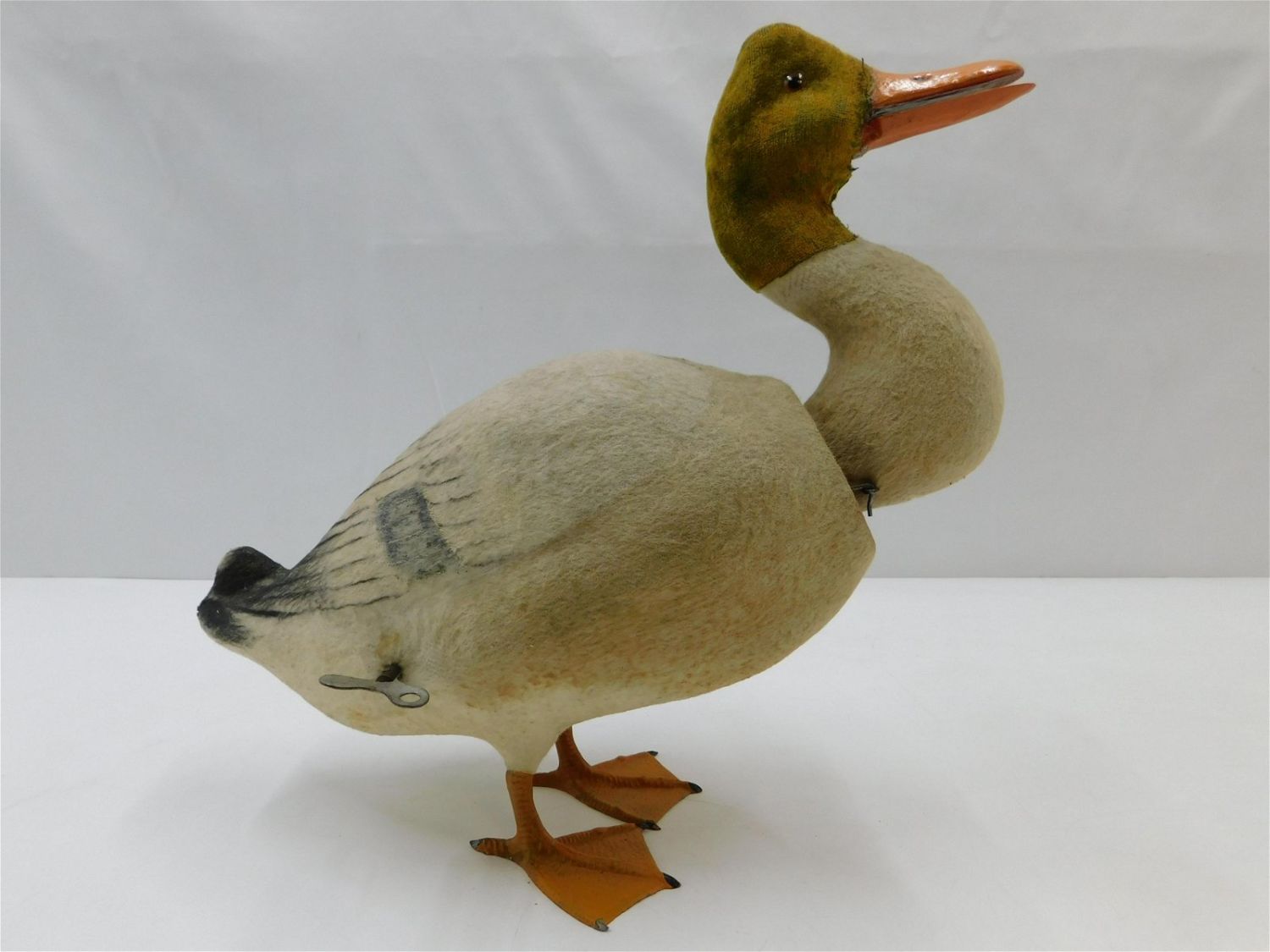 Antique Key Wind Duck Nodder. Felt Body with Working Beak Quacker. Has cast iron feet. In working condition. Measures 13" tall x 14" wide. All invoices must be paid within 24 hours of the sale. There are 3 Shipping Options. Please read the Terms of Sale and Shipping Options in the Terms. If you don’t read the terms, you will be upset because you don’t know what is happening. Local pickups are at our Monmouth Junction location on Friday, Saturday and Monday ONLY! All pickups are by appointment only. Any condition issues will be listed in the description. Please read the terms for full information.