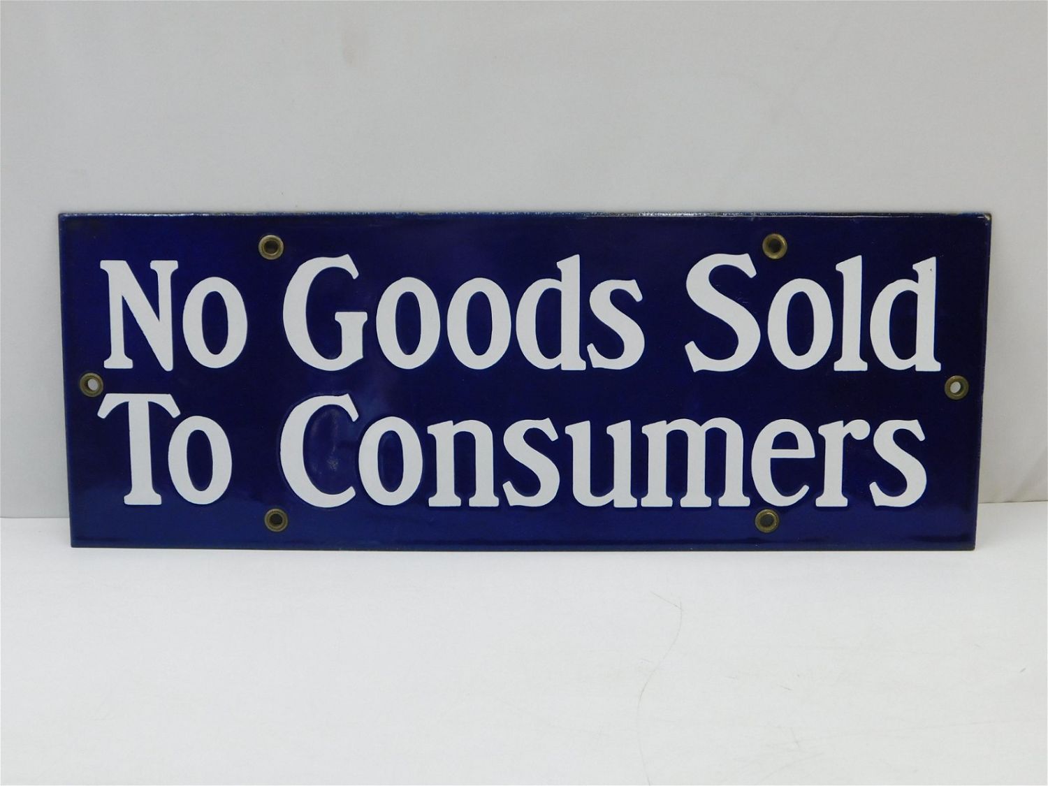 Vintage Porcelain Sign. "No Goods Sold to Consumers". In Excellent to Near Mint Condition. Measures 5.5" tall x 15" wide. All invoices must be paid within 24 hours of the sale. There are 3 Shipping Options. Please read the Terms of Sale and Shipping Options in the Terms. If you don’t read the terms, you will be upset because you don’t know what is happening. Local pickups are at our Monmouth Junction location on Friday, Saturday and Monday ONLY! All pickups are by appointment only. Any condition issues will be listed in the description. Please read the terms for full information.