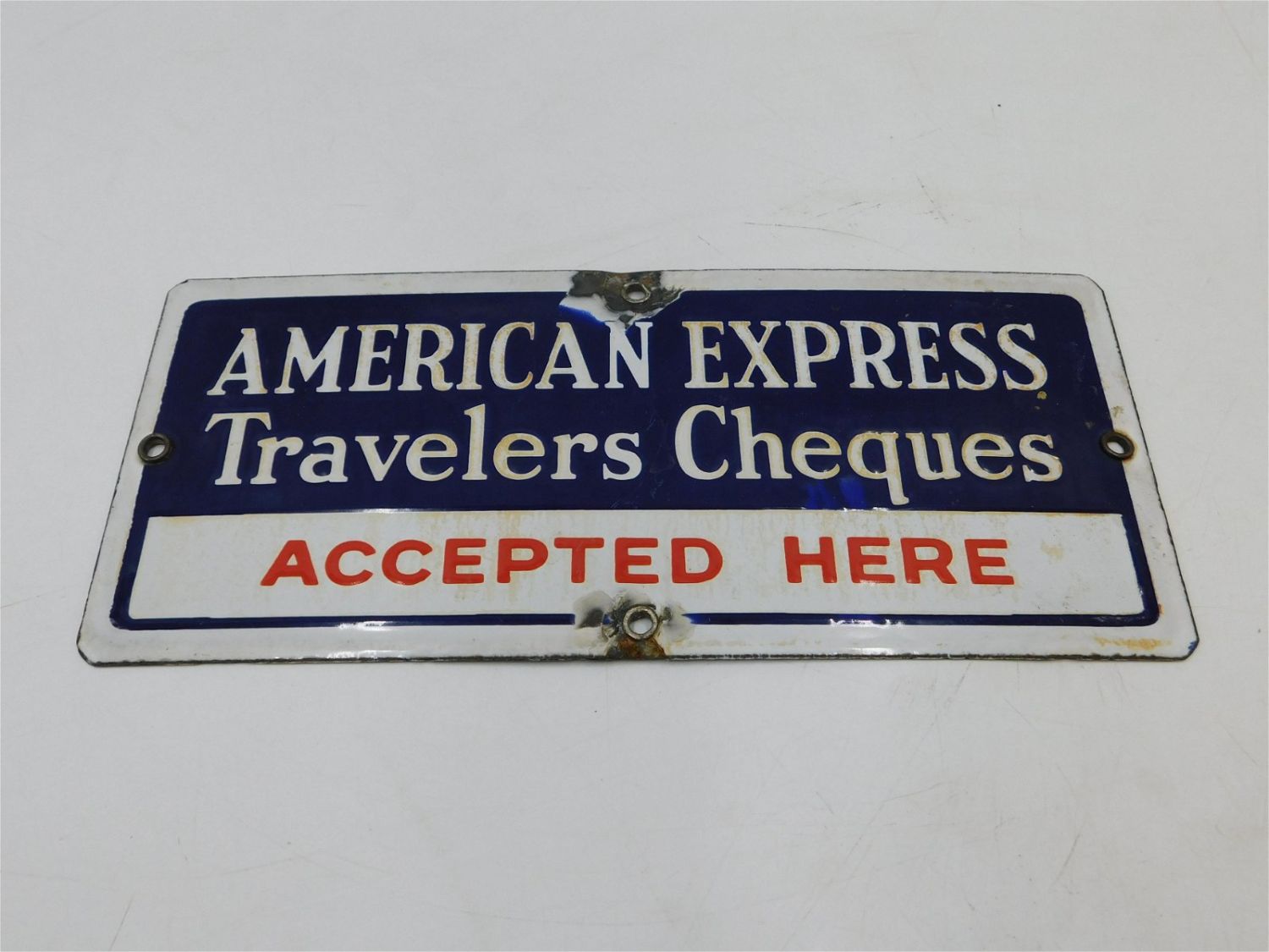 Vintage Porcelain Sign – American Express Travelers Cheques Accepted Here. Does have chipping and minor loss by top and bottom holes. Overall very good condition. Measures 4.5" tall x 10" wide. All invoices must be paid within 24 hours of the sale. There are 3 Shipping Options. Please read the Terms of Sale and Shipping Options in the Terms. If you don’t read the terms, you will be upset because you don’t know what is happening. Local pickups are at our Monmouth Junction location on Friday, Saturday and Monday ONLY! All pickups are by appointment only. Any condition issues will be listed in the description. Please read the terms for full information.