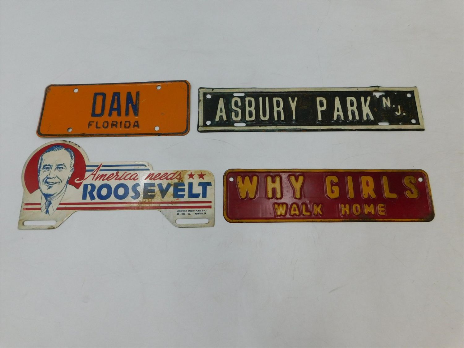 Lot of 4 Tin Signs and License Plate Signs including America Needs Roosevelt License Plate Signs, Why Girls Walk Home, Asbury Park NJ, and Dan Florida Bicycle Plate. Largest measures 12" tall x 3" wide. All invoices must be paid within 24 hours of the sale. There are 3 Shipping Options. Please read the Terms of Sale and Shipping Options in the Terms. If you don’t read the terms, you will be upset because you don’t know what is happening. Local pickups are at our Monmouth Junction location on Friday, Saturday and Monday ONLY! All pickups are by appointment only. Any condition issues will be listed in the description. Please read the terms for full information.