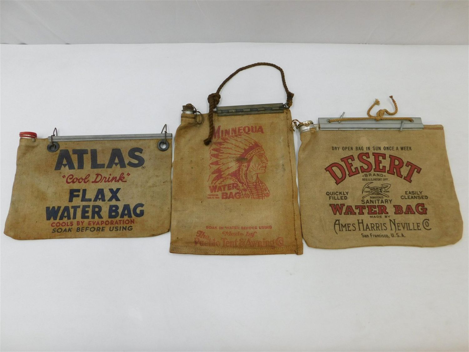 Lot of 3 Vintage Sack Water Bags. Including Minnequa, Atlas Cool Drink Flax Water Bag, and Desert Brand. Largest measures 14.5" tall x 12" wide. All invoices must be paid within 24 hours of the sale. There are 3 Shipping Options. Please read the Terms of Sale and Shipping Options in the Terms. If you don’t read the terms, you will be upset because you don’t know what is happening. Local pickups are at our Monmouth Junction location on Friday, Saturday and Monday ONLY! All pickups are by appointment only. Any condition issues will be listed in the description. Please read the terms for full information.