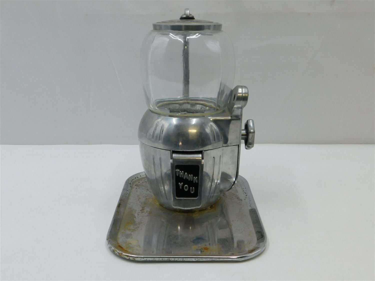 Antique 5 Cents Tabletop Chrome Gumball Machine. Mounted on a serving tray. Has key that fits but won’t turn. Tray has some pitting and rust. Overall very good condition. Measures 12" tall x 8" wide. All invoices must be paid within 24 hours of the sale. There are 3 Shipping Options. Please read the Terms of Sale and Shipping Options in the Terms. If you don’t read the terms, you will be upset because you don’t know what is happening. Local pickups are at our Monmouth Junction location on Friday, Saturday and Monday ONLY! All pickups are by appointment only. Any condition issues will be listed in the description. Please read the terms for full information.