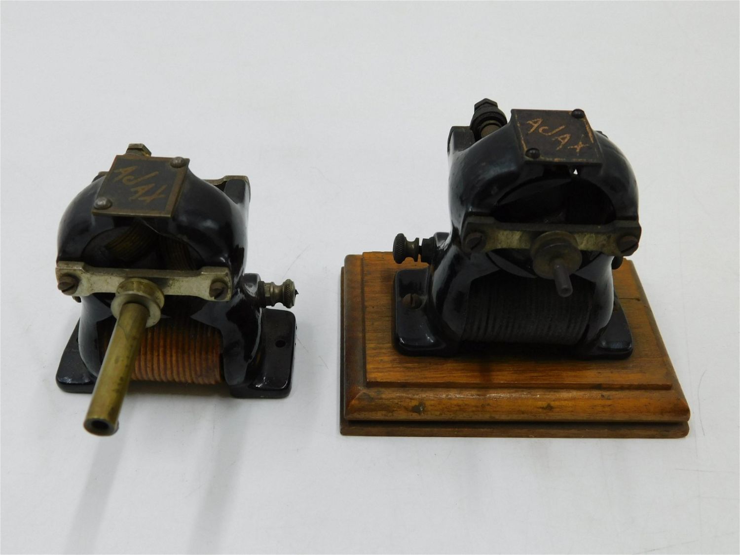 Lot of 2 Antique Ajax Electric Motors. One mounted on wooden base. Largest measures 3.5" tall x 4" wide. Not Tested. Appears to be complete but unsure if complete. All invoices must be paid within 24 hours of the sale. There are 3 Shipping Options. Please read the Terms of Sale and Shipping Options in the Terms. If you don’t read the terms, you will be upset because you don’t know what is happening. Local pickups are at our Monmouth Junction location on Friday, Saturday and Monday ONLY! All pickups are by appointment only. Any condition issues will be listed in the description. Please read the terms for full information.