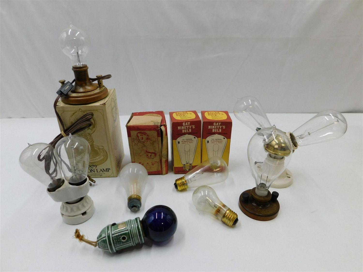 Lot of 11 Lightbulbs including (2) Antique Bulbs – One with Hand Written Hollow Stem with Information in Stem and Insulation and other has relief letters and numbers in hollow stem with insulation in a double ceramic fixture, 2 Bulbs including Antique Champion Hand Written Hollow Stem with Insulation – Pontil is chipped but bulb is in tact and Vintage Bulb without Pontil with Hollow Stem in Double Benjamin Ceramic and Brass Fixture – Patent 1905 660 Watt 250 Volt, Reproduction Bulb – Broken Filament, (2) Gay Ninety’s Bulbs in Original Boxes, Novelty Miracle Light – Does Not Appear to Work, Centennial Anniversary Reproduction of Thomas Edison Lamp in Box, Cobalt Bulb – Possibly Blacklight – Cracked Holder and Flash Bulb. Largest measures 7.25" tall. All invoices must be paid within 24 hours of the sale. There are 3 Shipping Options. Please read the Terms of Sale and Shipping Options in the Terms. If you don’t read the terms, you will be upset because you don’t know what is happening. Local pickups are at our Monmouth Junction location on Thursday, Friday, Saturday and Monday ONLY! All pickups are by appointment only. Any condition issues will be listed in the description. Please read the terms for full information.