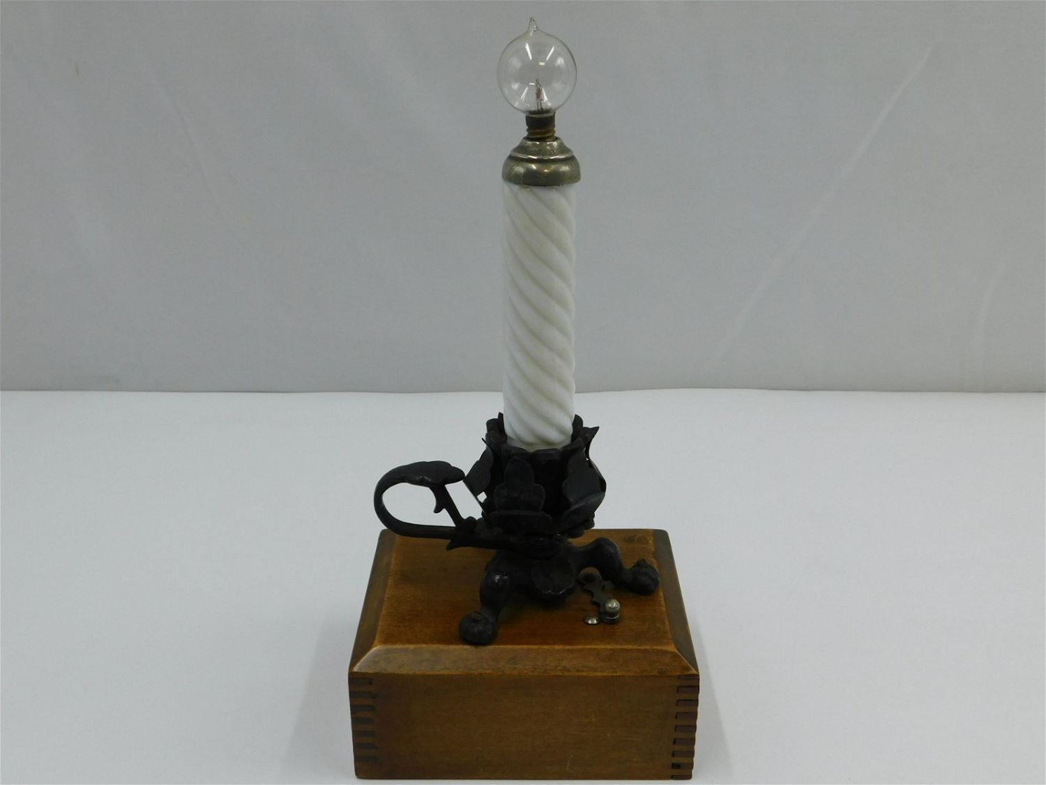 Vintage Battery Operated Candlestick Table Lamp. Comes on wooden base. Has wrought iron candlestick holder with glass candle. Has clean interior. The workings for battery connectors are included but not attached. In very good condition. Measures 10" tall. All invoices must be paid within 24 hours of the sale. There are 3 Shipping Options. Please read the Terms of Sale and Shipping Options in the Terms. If you don’t read the terms, you will be upset because you don’t know what is happening. Local pickups are at our Monmouth Junction location on Thursday, Friday, Saturday and Monday ONLY! All pickups are by appointment only. Any condition issues will be listed in the description. Please read the terms for full information.