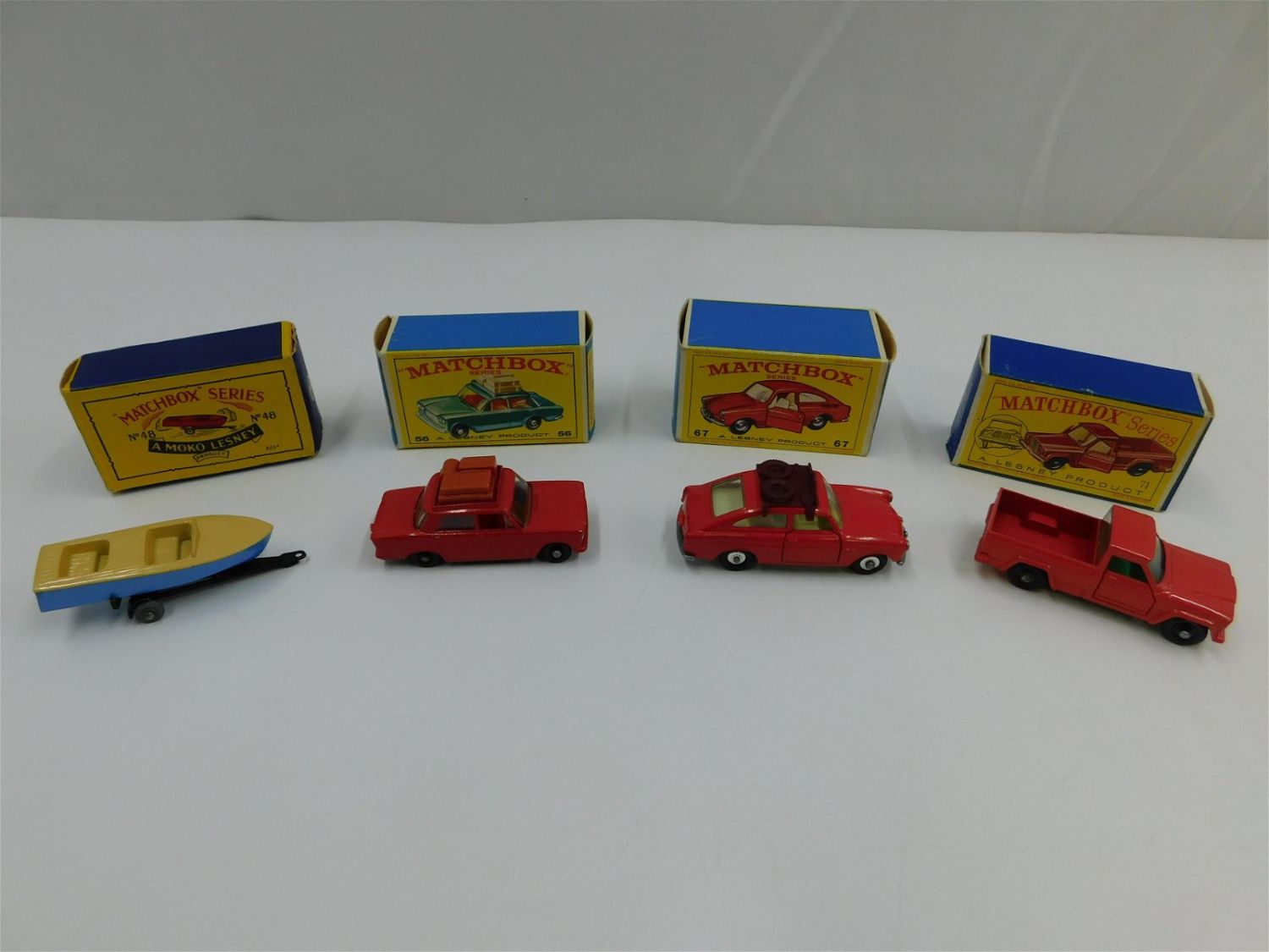 Lot of 4 Vintage Matchbox in Original Boxes including #67 Volkswagen 1600 TL, #56 Fiat 1500, #48 Meteor Sports Boat, and #71 Jeep Gladiator Pick-Up Truck. Most boxes are in nice shape with some minor wear. All invoices must be paid within 24 hours of the sale. There are 3 Shipping Options. Please read the Terms of Sale and Shipping Options in the Terms. If you don’t read the terms, you will be upset because you don’t know what is happening. Local pickups are at our Monmouth Junction location on Friday, Saturday and Monday ONLY! All pickups are by appointment only. Any condition issues will be listed in the description. Please read the terms for full information.