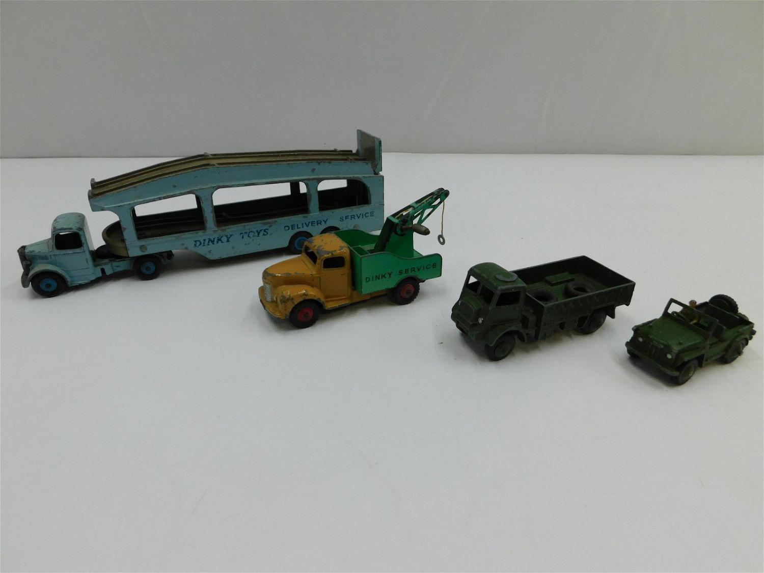 Lot of 4 Vintage Dinky Trucks including Car Transporter #582, Commer Tow Truck, Army Wagon #623, and Austin Champ Jeep. Largest measures 10" long. All invoices must be paid within 24 hours of the sale. There are 3 Shipping Options. Please read the Terms of Sale and Shipping Options in the Terms. If you don’t read the terms, you will be upset because you don’t know what is happening. Local pickups are at our Monmouth Junction location on Friday, Saturday and Monday ONLY! All pickups are by appointment only. Any condition issues will be listed in the description. Please read the terms for full information.