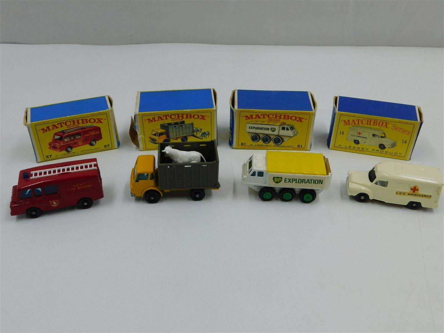 Lot of 4 Vintage Matchbox in Original Boxes including #57 Land Rover Fire Truck, #14 Lomas Ambulance, #61 Alvis Stalwart, and #37 Cattle Truck. The boxes have some wear and one box is missing a flap. All invoices must be paid within 24 hours of the sale. There are 3 Shipping Options. Please read the Terms of Sale and Shipping Options in the Terms. If you don’t read the terms, you will be upset because you don’t know what is happening. Local pickups are at our Monmouth Junction location on Friday, Saturday and Monday ONLY! All pickups are by appointment only. Any condition issues will be listed in the description. Please read the terms for full information.