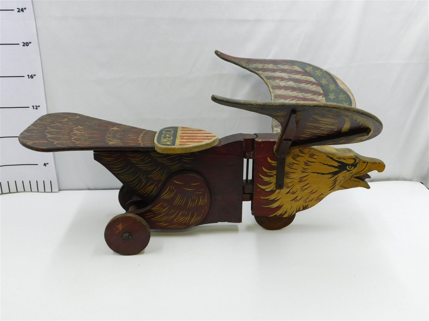 Antique Folk Art American Bald Eagle Wooden Ride On Car. Circa 1910-1940. Seat marked America. Wingspan has American Flag Decoration. In very good condition with normal wear. Right wing has been cracked but has early repair on bottom. Measures 18" tall x 40" long. All invoices must be paid within 24 hours of the sale. There are 3 Shipping Options. Please read the Terms of Sale and Shipping Options in the Terms. If you don’t read the terms, you will be upset because you don’t know what is happening. Local pickups are at our Monmouth Junction location on Friday, Saturday and Monday ONLY! All pickups are by appointment only. Any condition issues will be listed in the description. Please read the terms for full information.