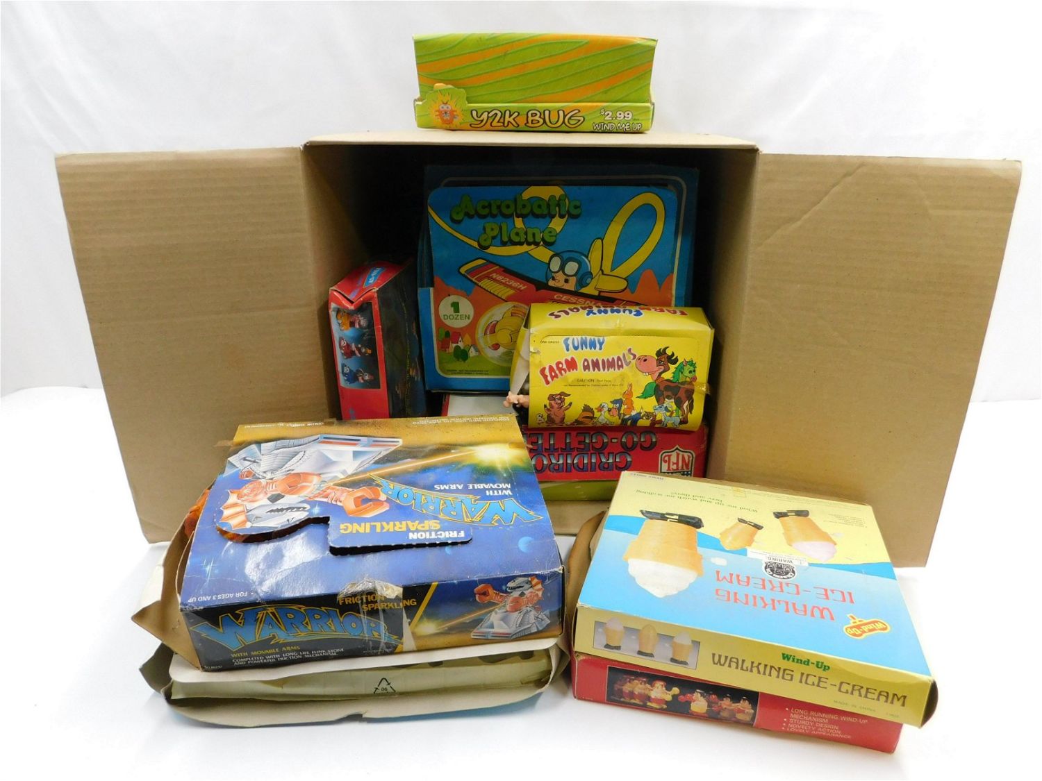 Large Lot of Wind Up Toys – All in store display boxes. Some are not complete. Includes Sneaky Sneakers, Animal Band Wagon, Gridiron Go Getters, Swimming Sharks, Y2K Bugs, Wind Up Bumping Boxers, Funny Farm Animals, Walking Ice-Cream, Warrior, and Acrobatic Plane. All invoices must be paid within 24 hours of the sale. There are 3 Shipping Options. Please read the Terms of Sale and Shipping Options in the Terms. If you don’t read the terms, you will be upset because you don’t know what is happening. Local pickups are at our Monmouth Junction location on Friday, Saturday and Monday ONLY! All pickups are by appointment only. Any condition issues will be listed in the description. Please read the terms for full information.