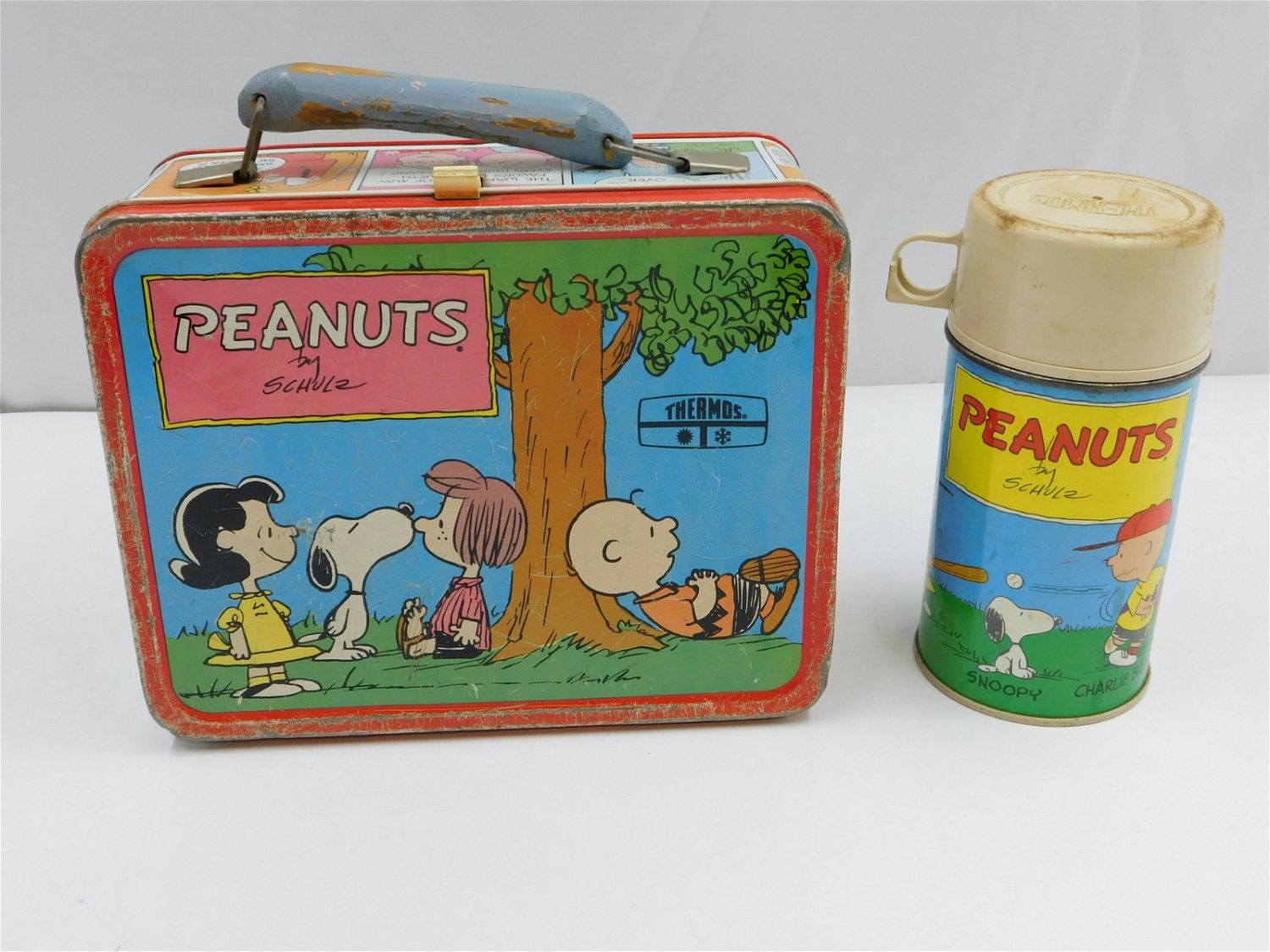 Peanuts vintage tin lunchbox with original Thermos and Thermos holder. Marked Thermos Division King-Seeley Thermos Co. Has a wooden handle, not sure if original. Has some paint loss/rusting to the interior as well as a name painted on the interior lid. Has paint loss/scratching throughout the exterior. The Thermos has scratching to the lid and is missing the inside stopper. All invoices must be paid within 24 hours of the sale. There are 3 Shipping Options. Please read the Terms of Sale and Shipping Options in the Terms. If you don’t read the terms, you will be upset because you don’t know what is happening. Local pickups are at our Monmouth Junction location on Friday, Saturday and Monday ONLY! All pickups are by appointment only. Any condition issues will be listed in the description. Please read the terms for full information.