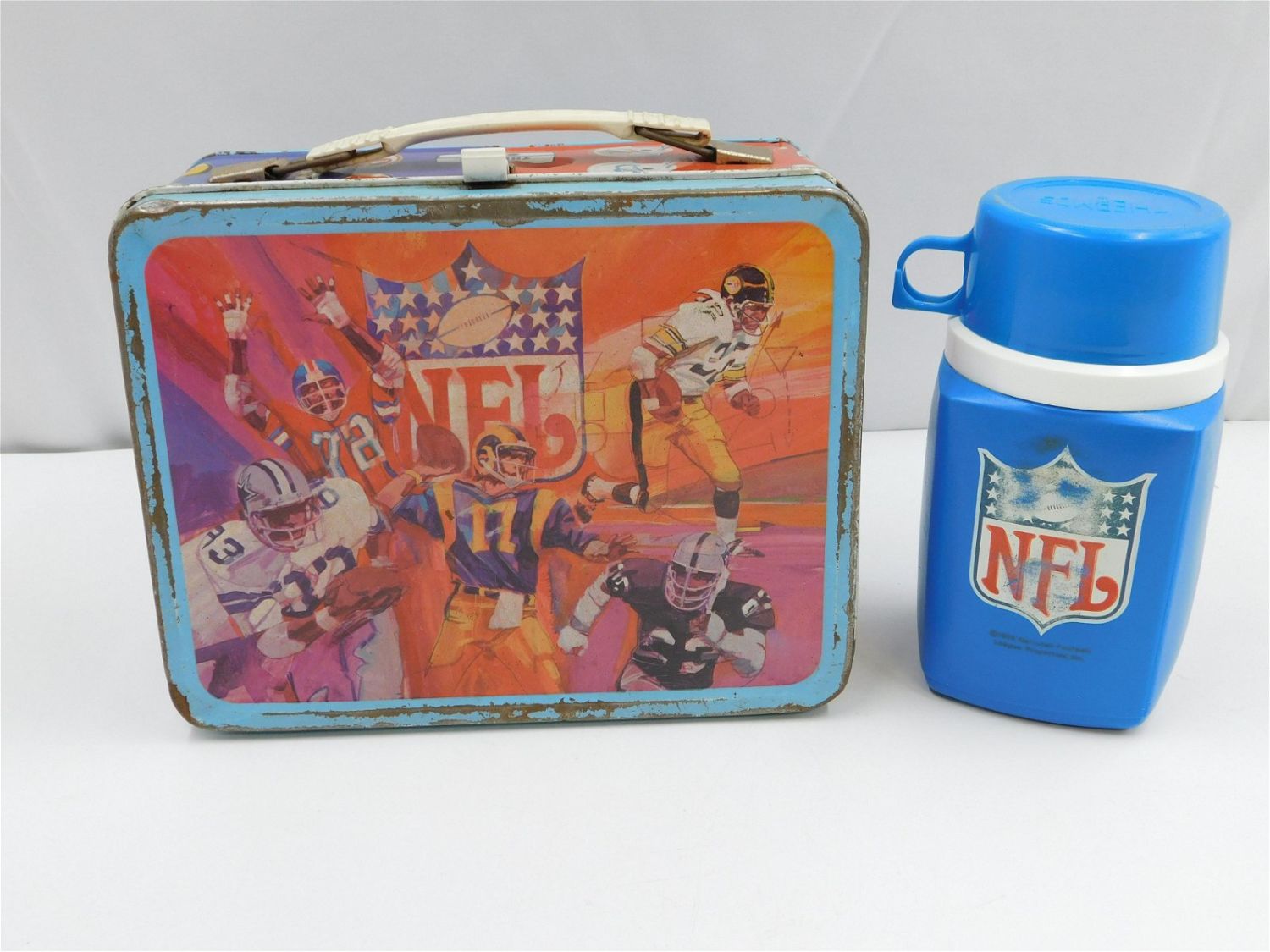 NFL vintage tin lunchbox with original Thermos. Marked National Football League 1978 NFL Properties Inc. Thermos Division King-Seeley Thermos Co. Has some paint loss/rusting to the interior, some loss to the Thermos image and scratching/paint loss throughout the exterior. All invoices must be paid within 24 hours of the sale. There are 3 Shipping Options. Please read the Terms of Sale and Shipping Options in the Terms. If you don’t read the terms, you will be upset because you don’t know what is happening. Local pickups are at our Monmouth Junction location on Friday, Saturday and Monday ONLY! All pickups are by appointment only. Any condition issues will be listed in the description. Please read the terms for full information.
