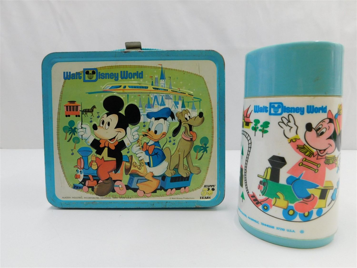 Walt Disney World vintage tin lunchbox with original Thermos and Thermos holder. Marked Aladdin Industries Incorporated, Nashville Tenn. 37210 USA. Walt Disney Productions. Has minor paint loss/rusting to the interior as well as marker and sticker residue to the lid. The Thermos has sticker residue to the cap and there is small paint loss and scratching throughout. All invoices must be paid within 24 hours of the sale. There are 3 Shipping Options. Please read the Terms of Sale and Shipping Options in the Terms. If you don’t read the terms, you will be upset because you don’t know what is happening. Local pickups are at our Monmouth Junction location on Friday, Saturday and Monday ONLY! All pickups are by appointment only. Any condition issues will be listed in the description. Please read the terms for full information.