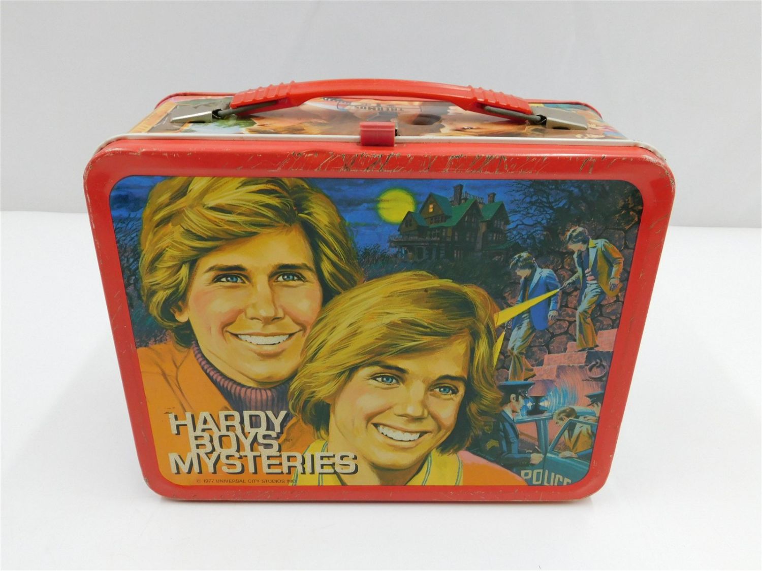 Hardy Boys Mysteries vintage tin lunchbox. Marked 1977 Universal City Studios Inc. Thermos Division King-Seeley Thermos Co. Has extremely minor paint loss to the interior as well as some tape residue to the interior lid. Has paint loss to the edges and some rusting to the back bottom edge as well as small scratches throughout. All invoices must be paid within 24 hours of the sale. There are 3 Shipping Options. Please read the Terms of Sale and Shipping Options in the Terms. If you don’t read the terms, you will be upset because you don’t know what is happening. Local pickups are at our Monmouth Junction location on Friday, Saturday and Monday ONLY! All pickups are by appointment only. Any condition issues will be listed in the description. Please read the terms for full information.