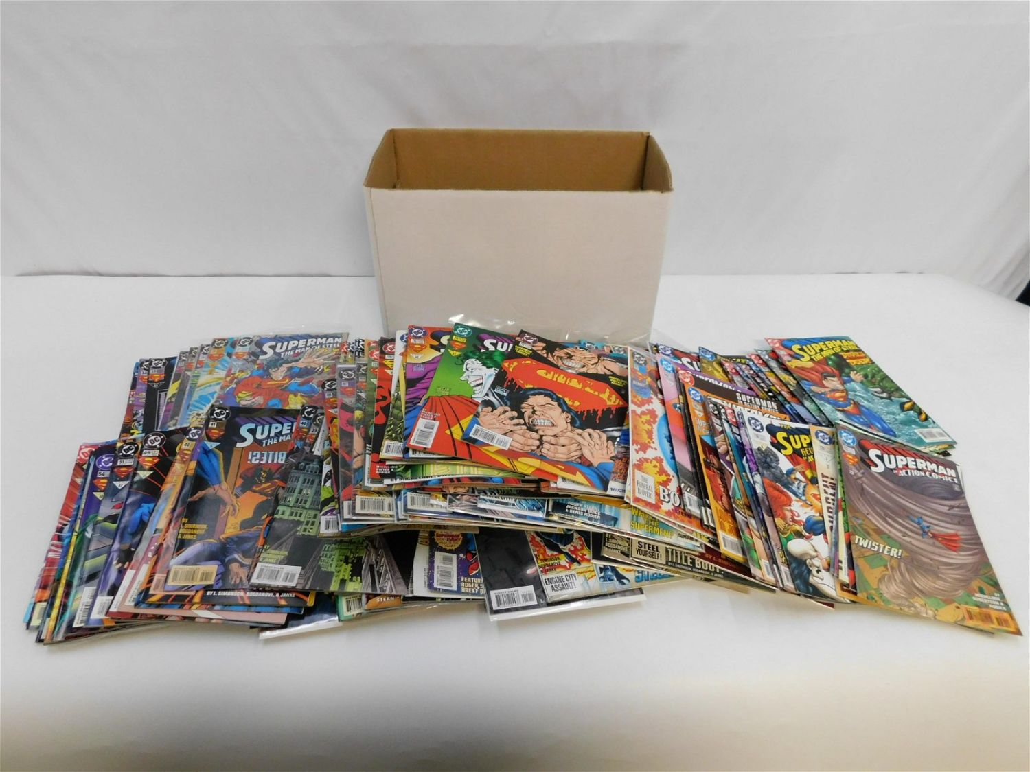 Short Box Full of Superman Related Comics including Nearly Full Runs of Superman: The Man of Tomorrow #1-15, Superman: The Man of Steel #16-118, and Action Comics #684-783. Includes Annuals. All invoices must be paid within 24 hours of the sale. All items are shipped USPS or UPS and will be billed separately. A $12 handling fee is added to the shipping price per lot if shipped in house. Some items or large quantity of purchases will be packed and shipped via the Monmouth Junction UPS store. Local pickups are at our Monmouth Junction location on Thursday, Friday, Saturday and Monday ONLY! All pickups are by appointment only. Any condition issues will be listed in the description. Please read the terms for full information.