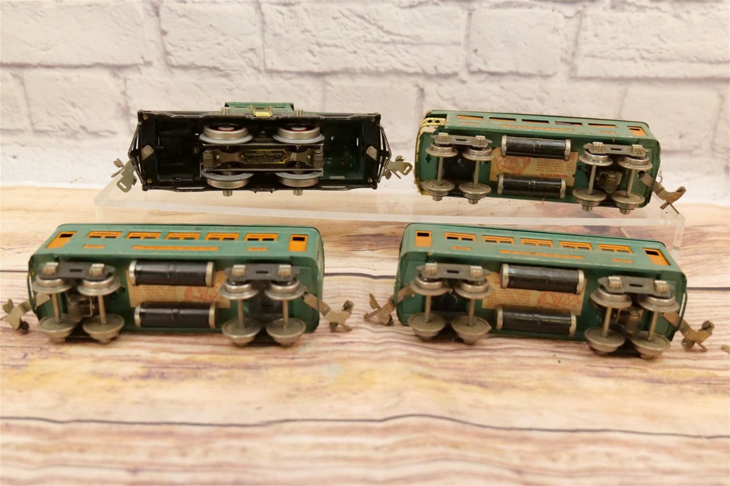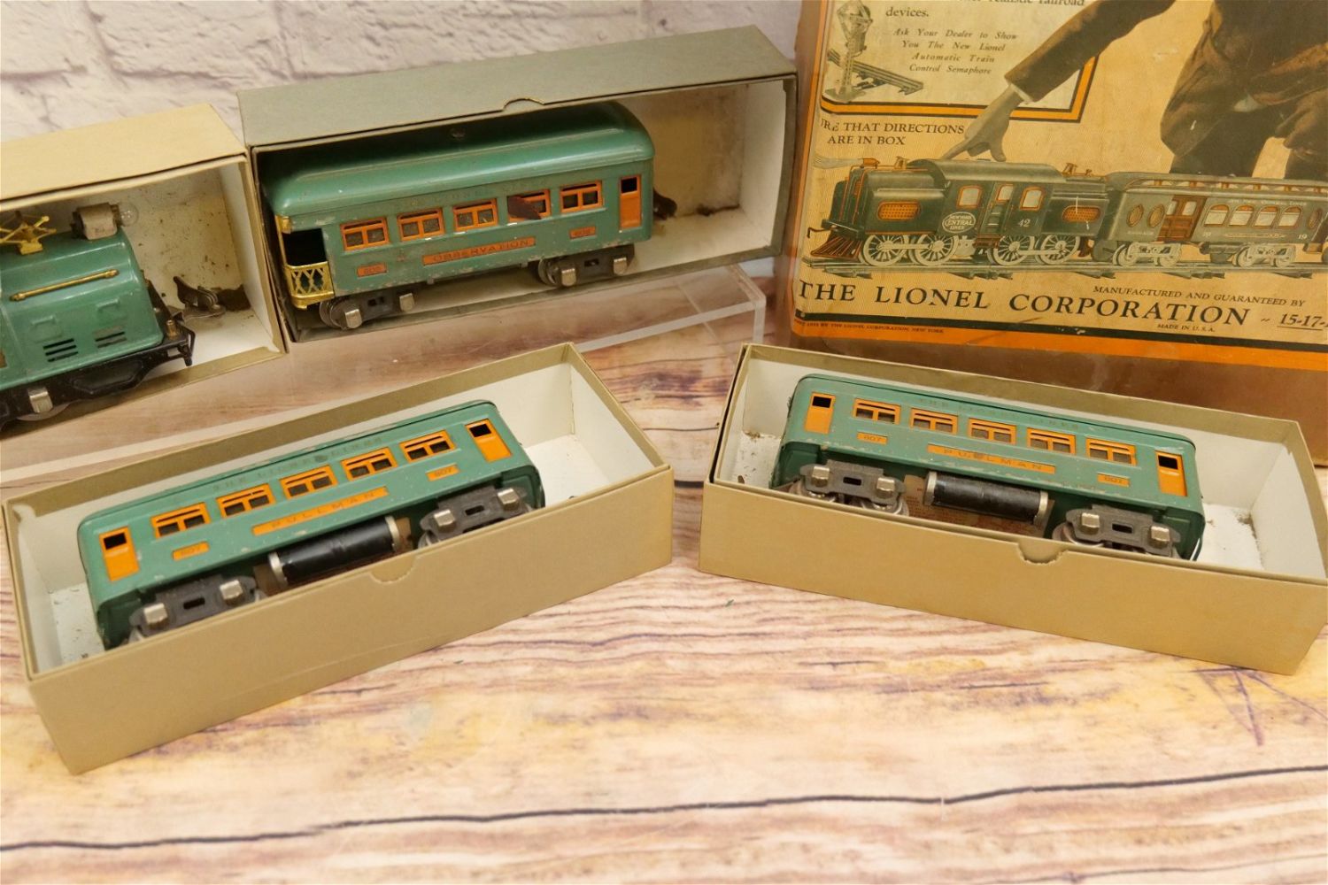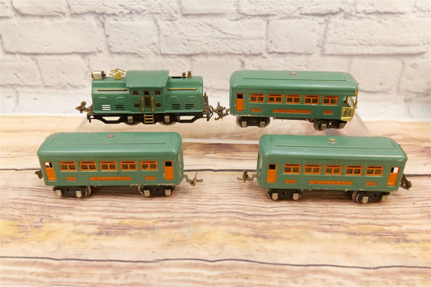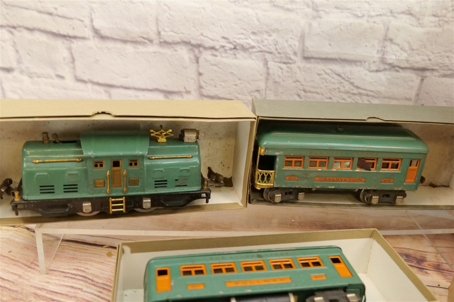 Lionel O Gauge Tin Plated Train Set. Outfit No. 352E. Set includes Engine No. 252, (2) No. 607 Pullman Passenger Cars and No. 608 Observation Car. Engine wheels are intact but showing stress. Cars are showing paint loss and usage. Fair to Good Condition. Boxes in set box numbers do not correspond. All invoices must be paid within 24 hours of the sale. We offer multiple shipping options, please read the terms as they have changed. We also offer Pick-Ups Friday, Saturday, and Monday immediately following the sale. BY APPOINTMENT ONLY. PLEASE READ THE SHIPPING TERMS!