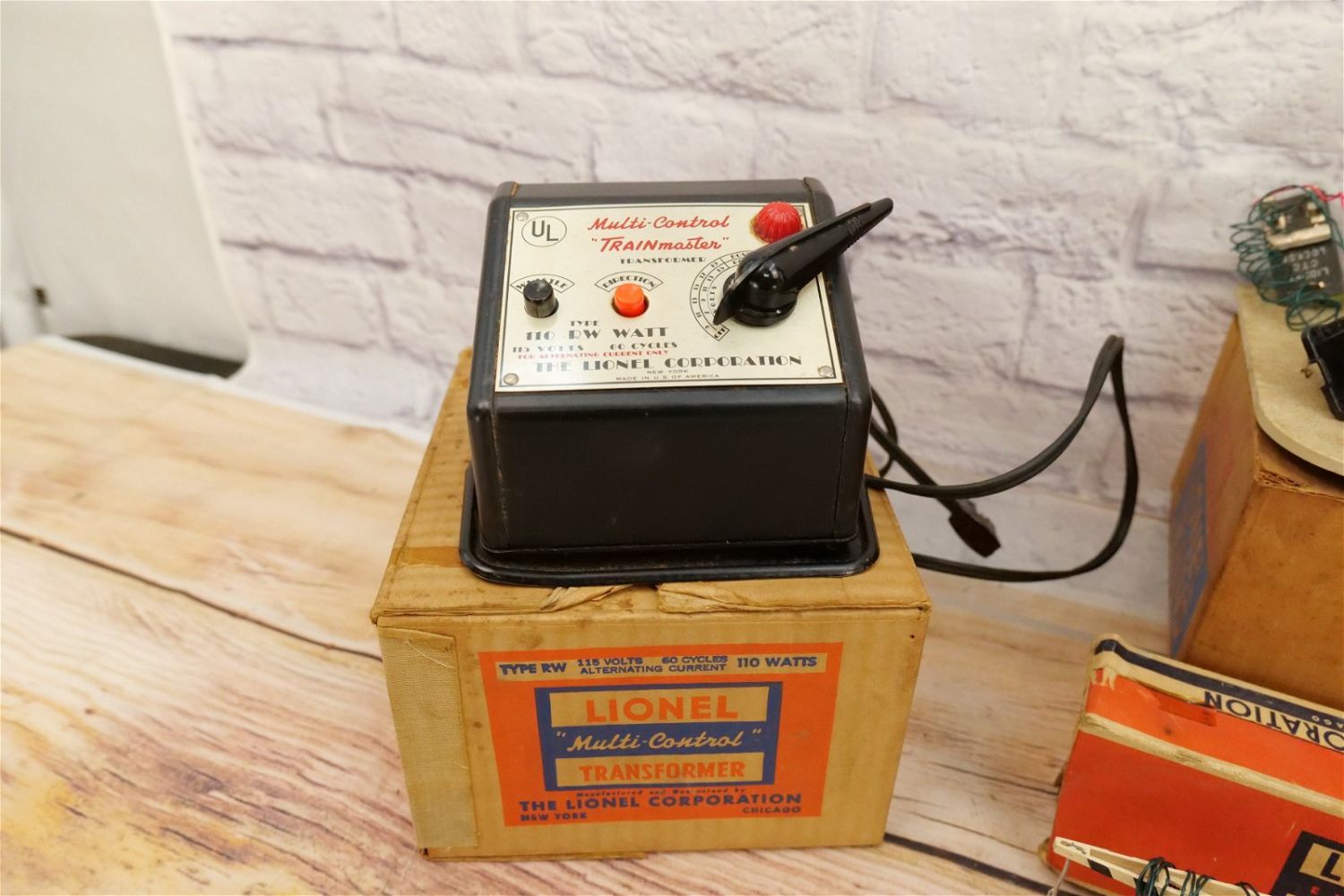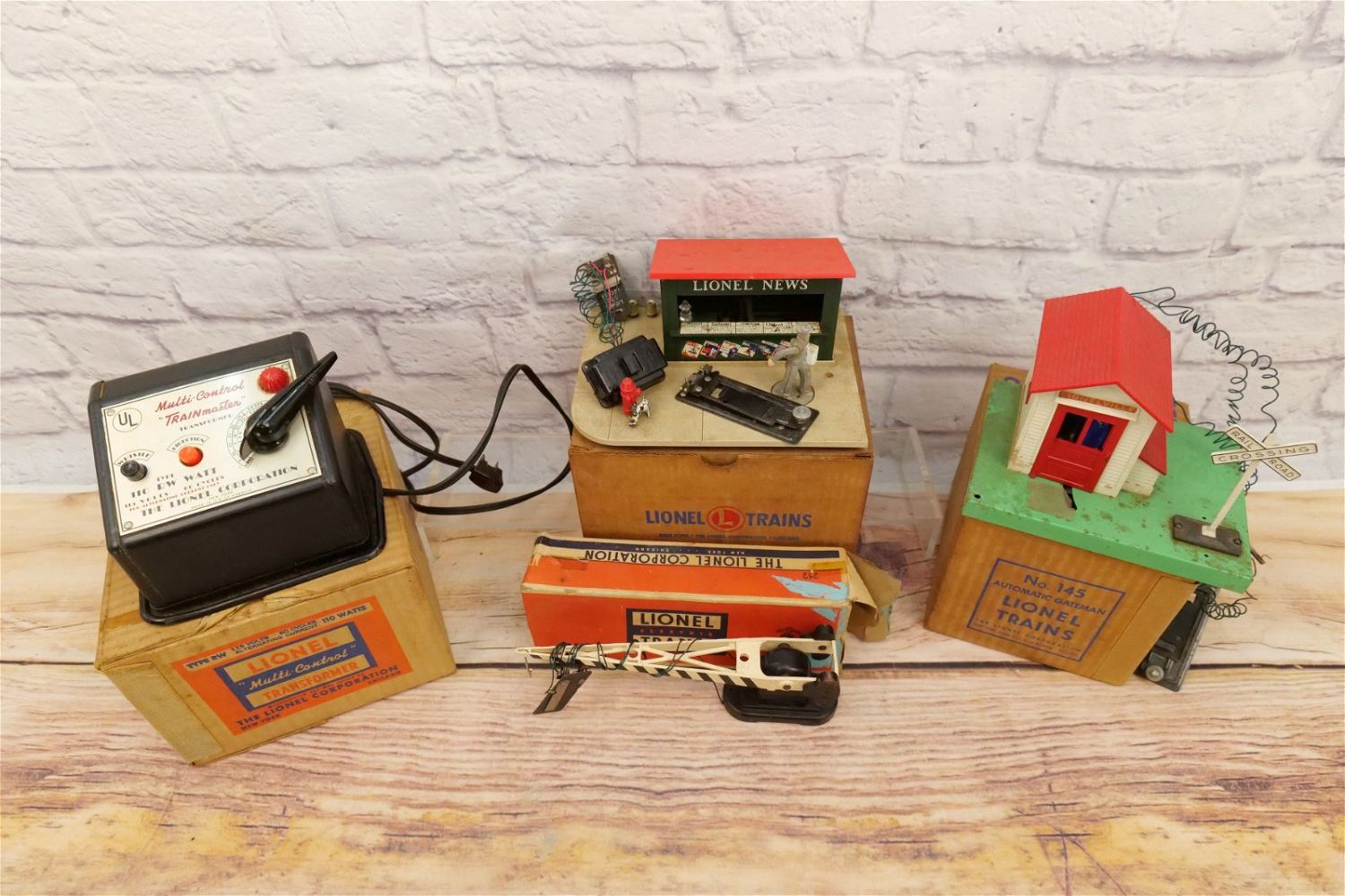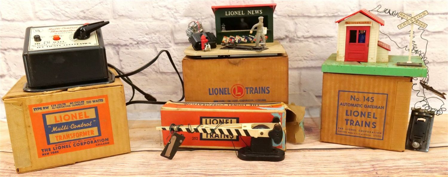 Lot of Lionel O27 Accessories and Transformers. Includes Trainmaster Transformer in Box, No. 145 Automatic Gate Man in Box, No. 128 Animated Newsstand with Box, and Automatic Crossing Gate. All invoices must be paid within 24 hours of the sale. We offer multiple shipping options, please read the terms as they have changed. We also offer Pick-Ups Friday, Saturday, and Monday immediately following the sale. BY APPOINTMENT ONLY. PLEASE READ THE SHIPPING TERMS!