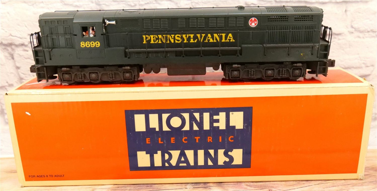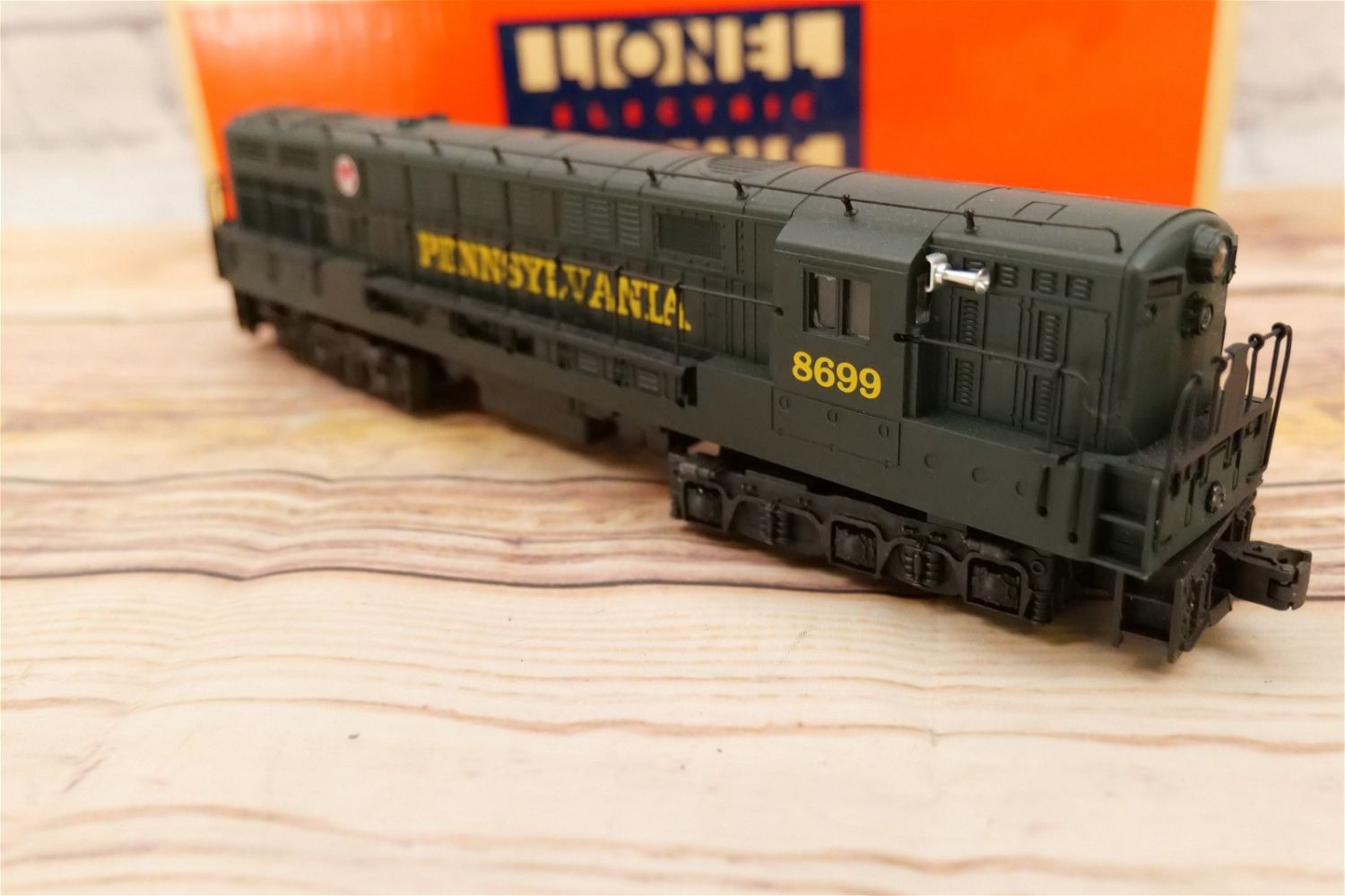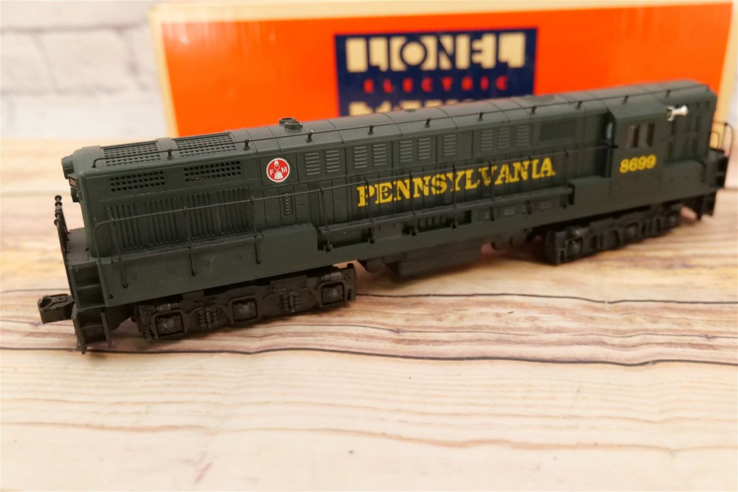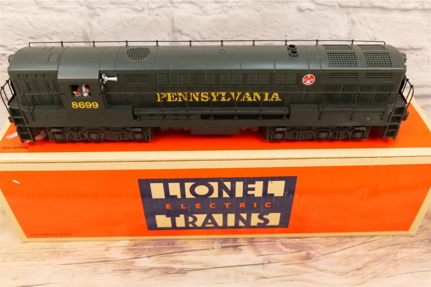 Lionel O27 Pennsylvania Fairbanks-Morse Trainmaster Diesel Engine No. 8699. Model 6-18307. Dual AC Motors, Operating Headlight, Diesel Horn and More. Great FM Engine. Like New in Box. Maybe ran once or twice. All invoices must be paid within 24 hours of the sale. We offer multiple shipping options, please read the terms as they have changed. We also offer Pick-Ups Friday, Saturday, and Monday immediately following the sale. BY APPOINTMENT ONLY. PLEASE READ THE SHIPPING TERMS!